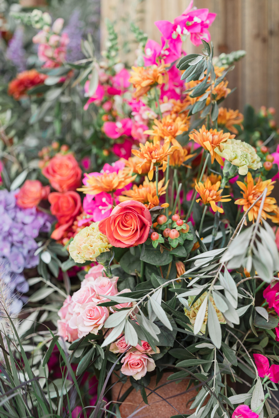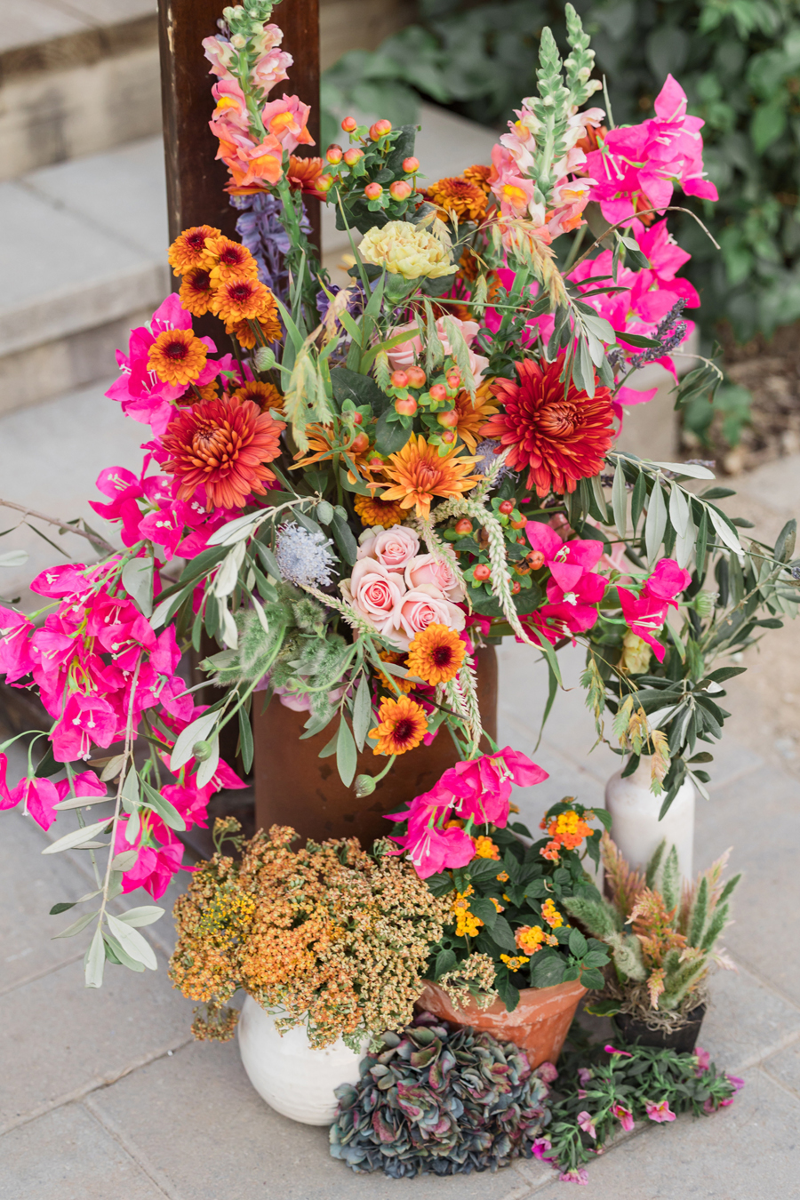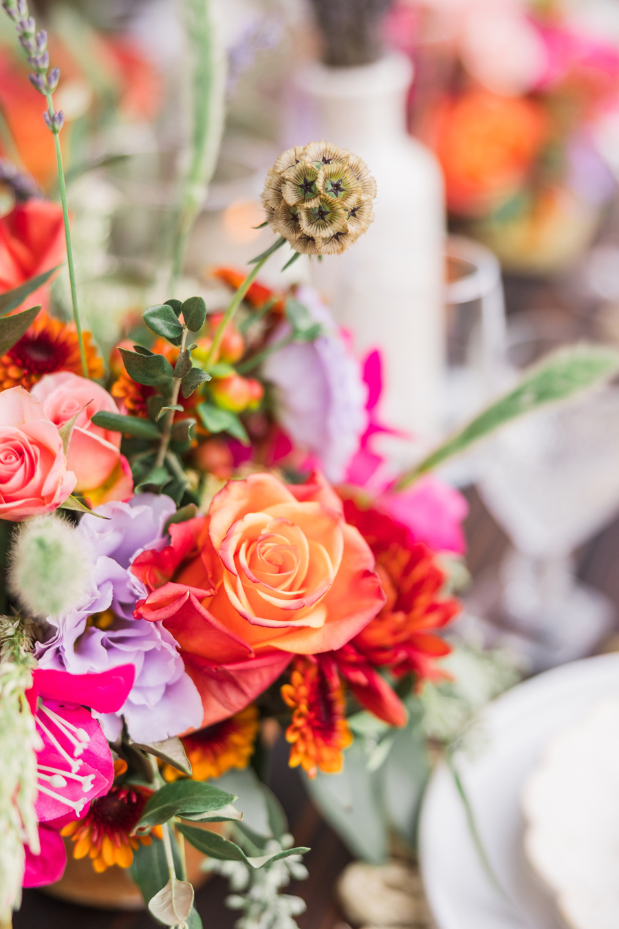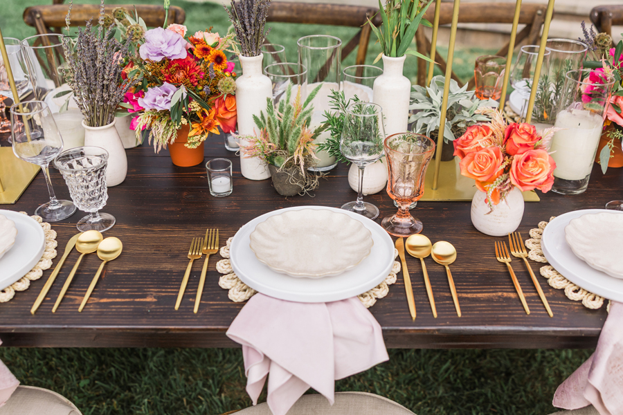 Coral, peach, and sunset orange florals spill across the tablescape beside buttery yellow blooms and hints of soft lavender—arranged as if gathered straight from a garden at golden hour. Terracotta vessels and sandy neutrals keep everything grounded so the palette feels vibrant but never overwhelming.