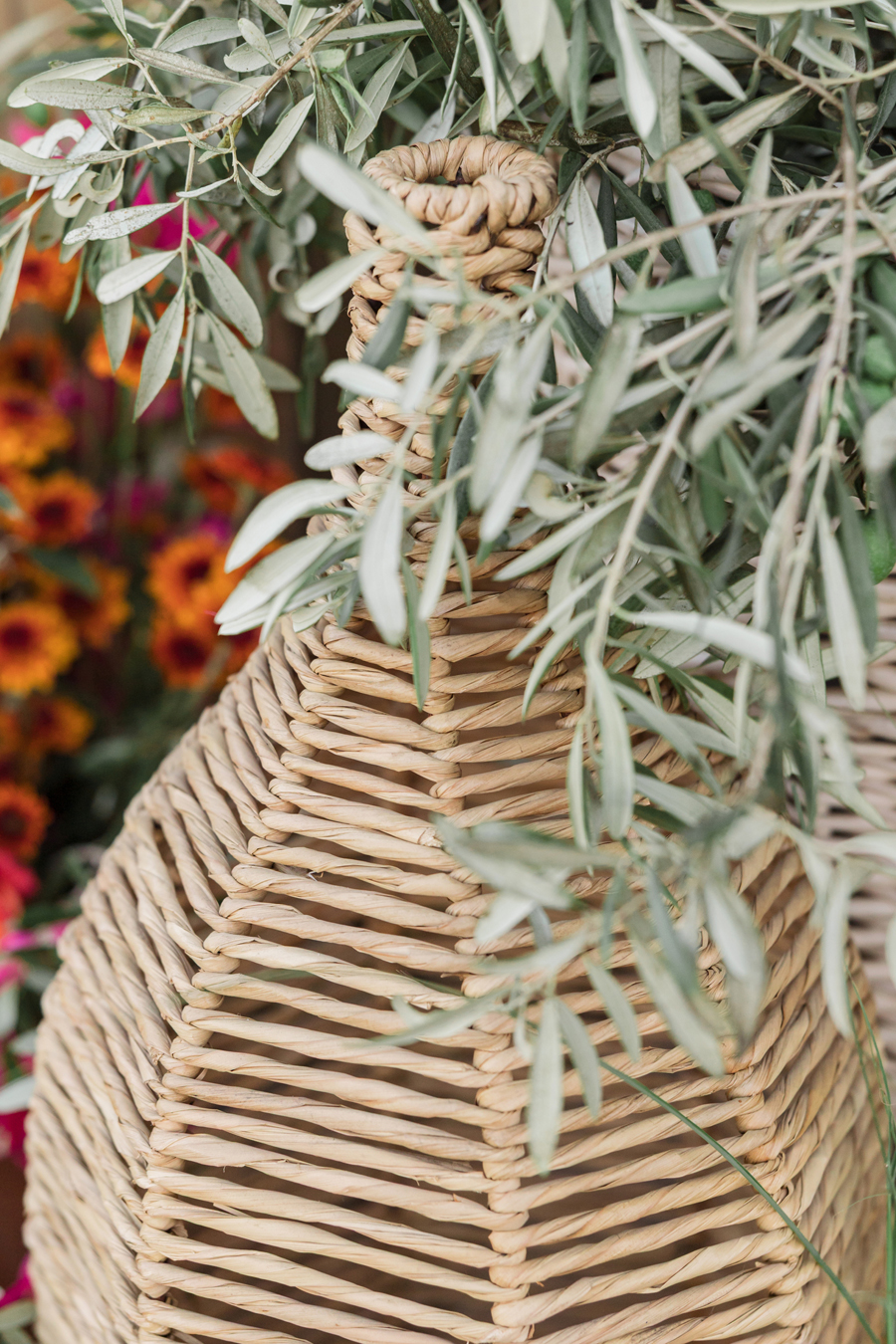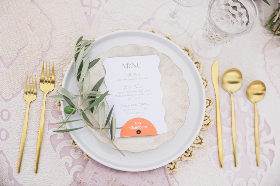 Designed by Sara of Rainbow Weddings & Events and brought to life by a curated group of incredibly talented local wedding professionals, every corner feels thoughtfully layered and effortlessly inviting. Farmhouse tables are richly adorned with layered place settings, handmade ceramics, and delicate vintage glassware catching the light like sea glass along the coast. Olive branches wind between settings while woven textures and warm tones add that perfectly relaxed, collected warmth.