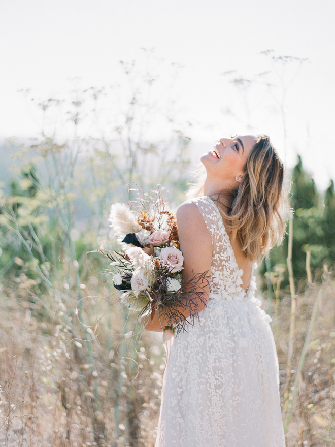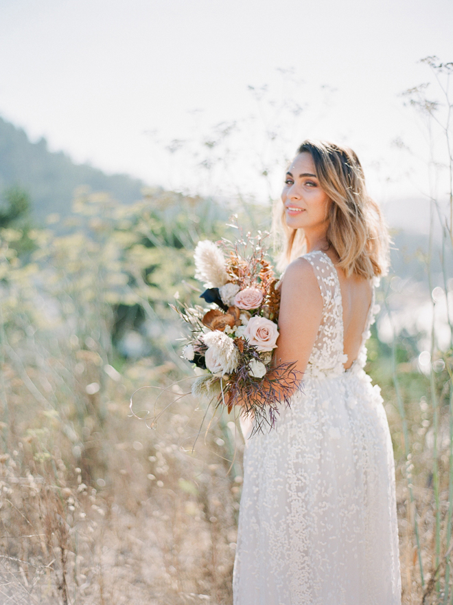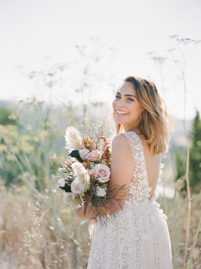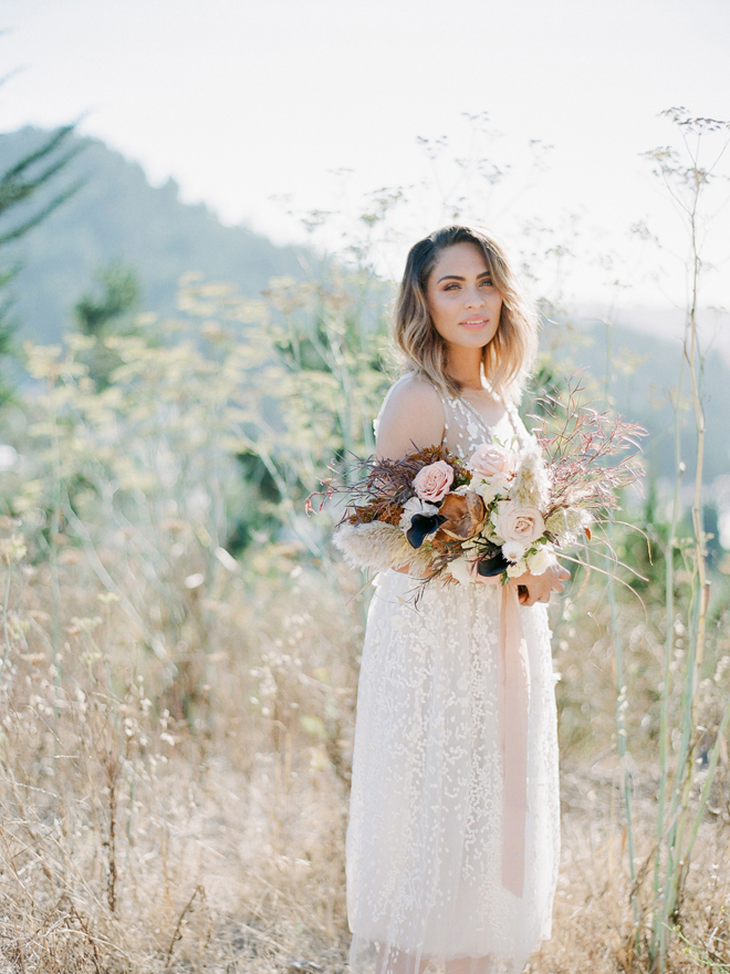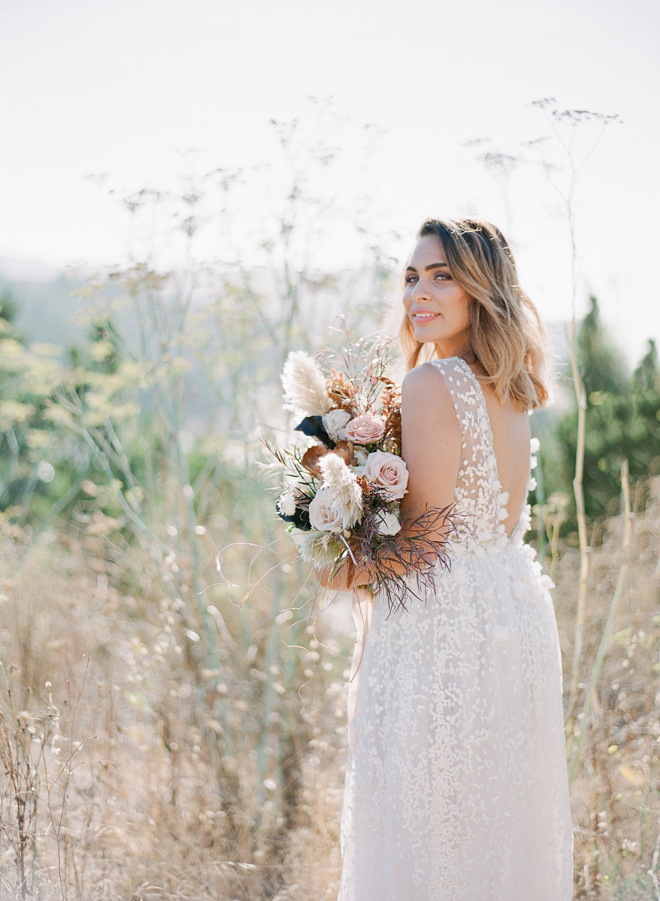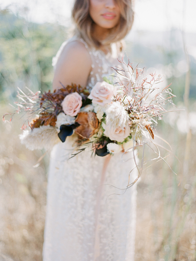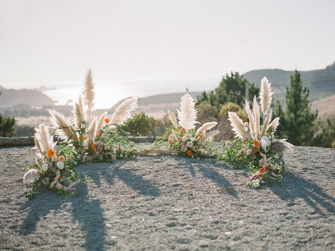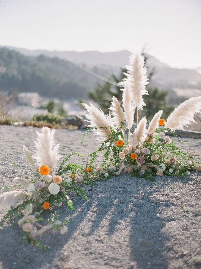 “Our photoshoot is inspired by the free-spirited culture, creative energy and beautiful natural landscape of Byron Bay Australia. We translate the Australian bohemia in Northern Californian language using natural textures such as wood and jute, airy ambiance and soft colors. Our pop of color comes from the flowers and we incorporate lots of dried elements such as flower pods, dried pampas grass etc. In our ceremony the focal point is semi-circle structure of grape wood, pops of blooms, pampas grass and other dried elements, overlooking the sunset over the Pacific Ocean. Our lounge area is a cozy and intimate space with pillows, large traditional Bulgarian rug and stunning calligraphy.
