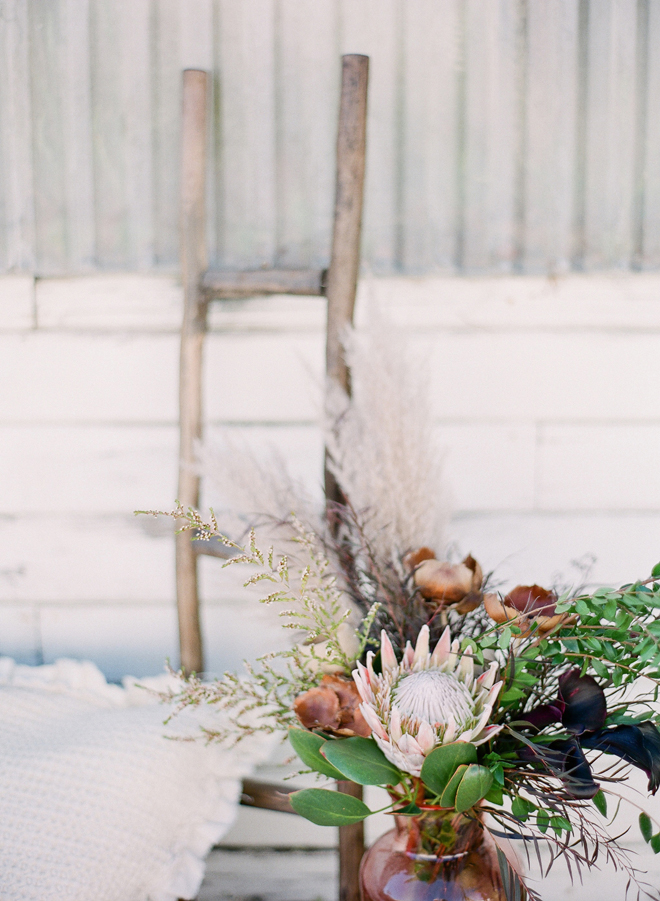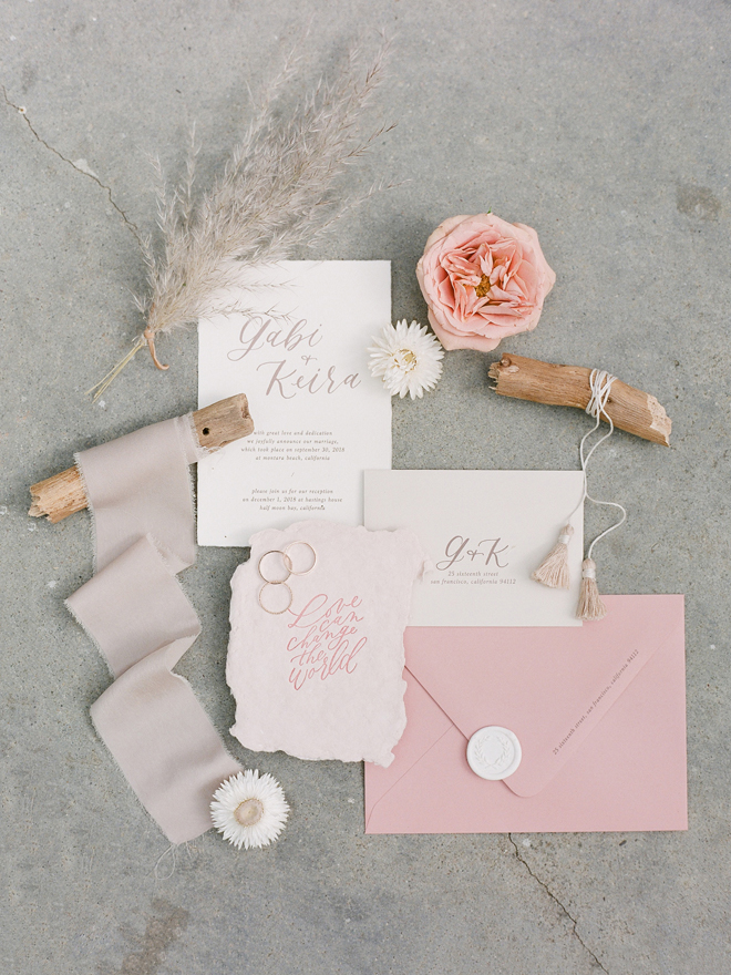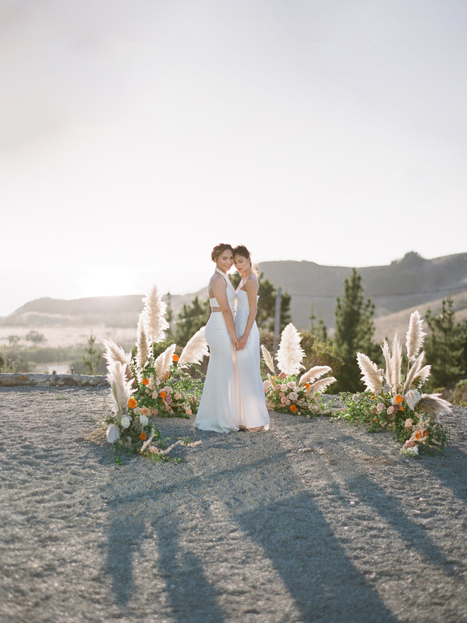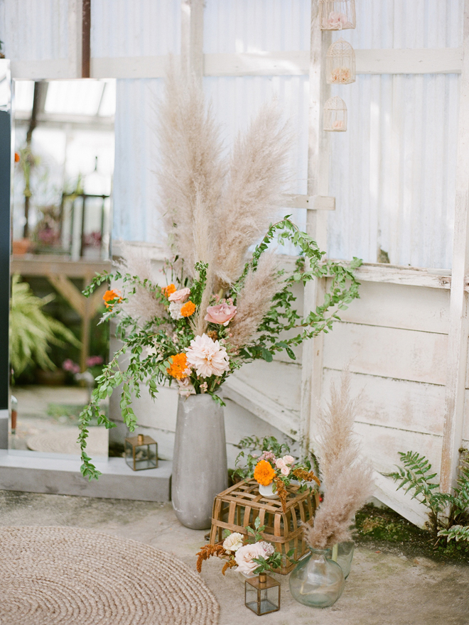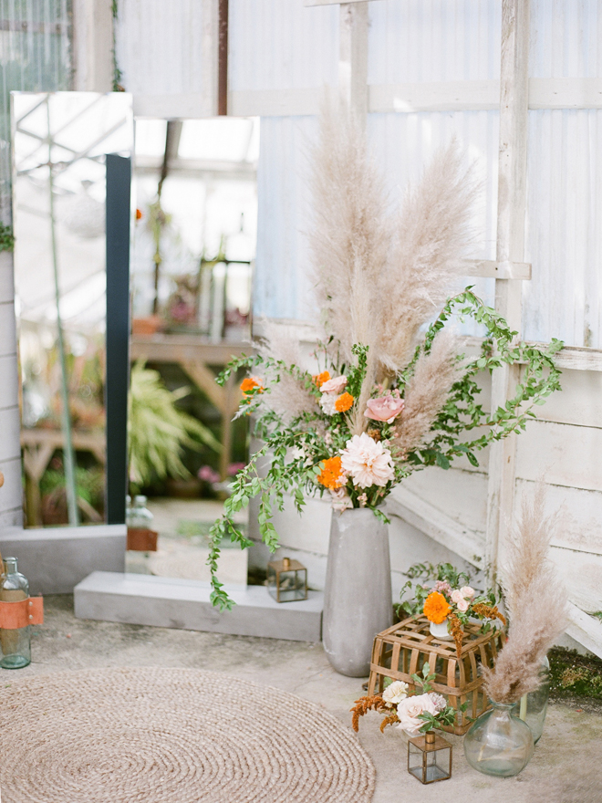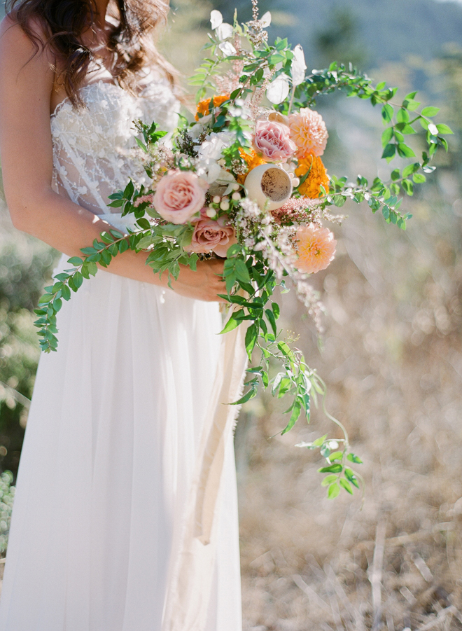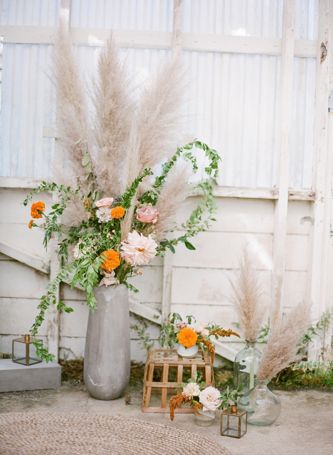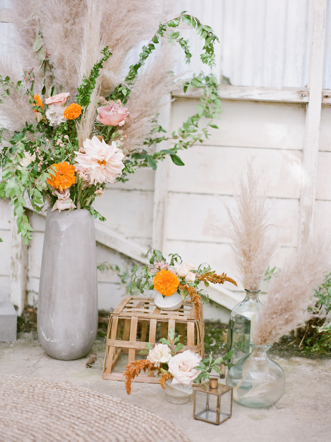 “Our photoshoot is inspired by the free-spirited culture, creative energy and beautiful natural landscape of Byron Bay Australia. We translate the Australian bohemia in Northern Californian language using natural textures such as wood and jute, airy ambiance and soft colors. Our pop of color comes from the flowers and we incorporate lots of dried elements such as flower pods, dried pampas grass etc. In our ceremony the focal point is semi-circle structure of grape wood, pops of blooms, pampas grass and other dried elements, overlooking the sunset over the Pacific Ocean. Our lounge area is a cozy and intimate space with pillows, large traditional Bulgarian rug and stunning calligraphy.