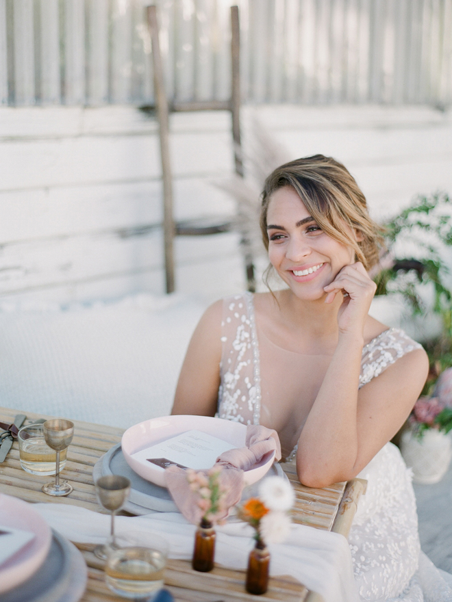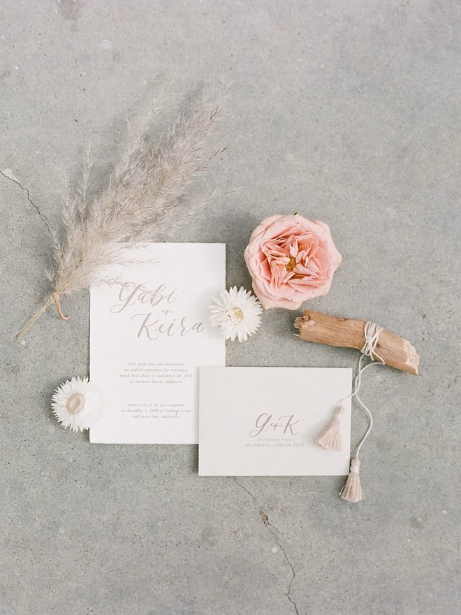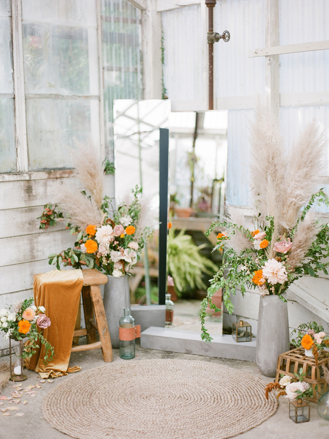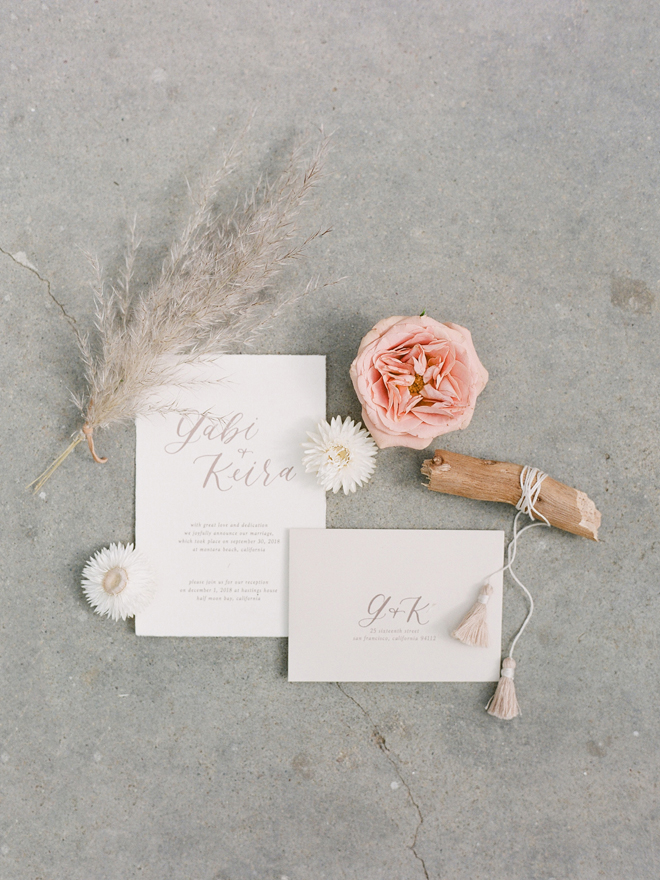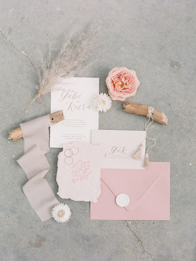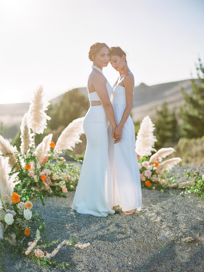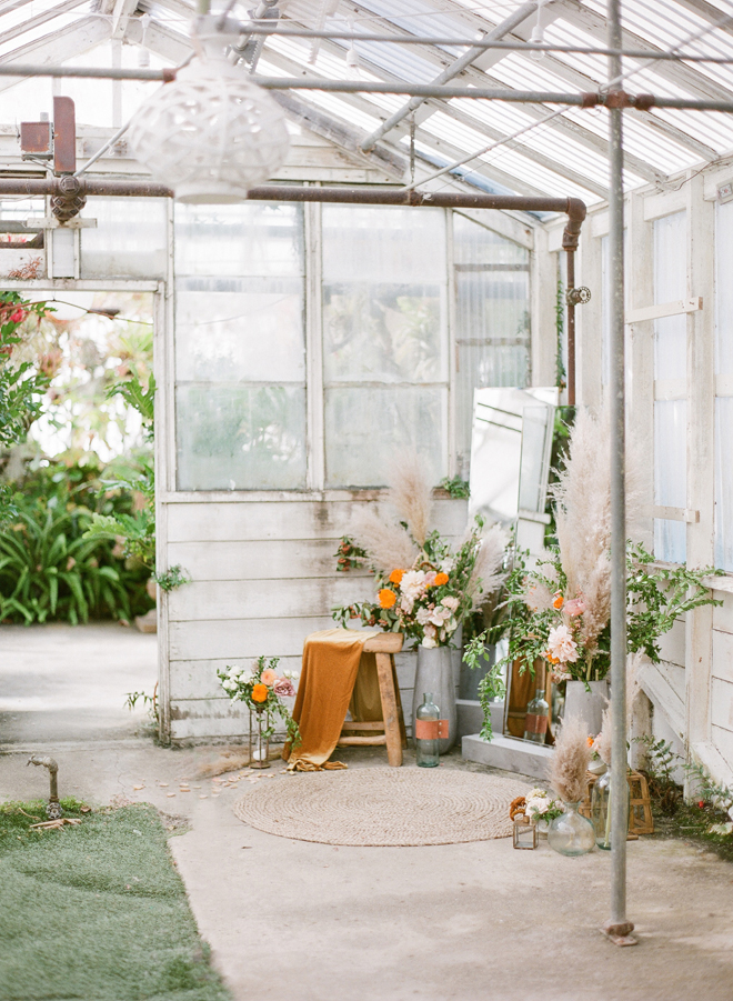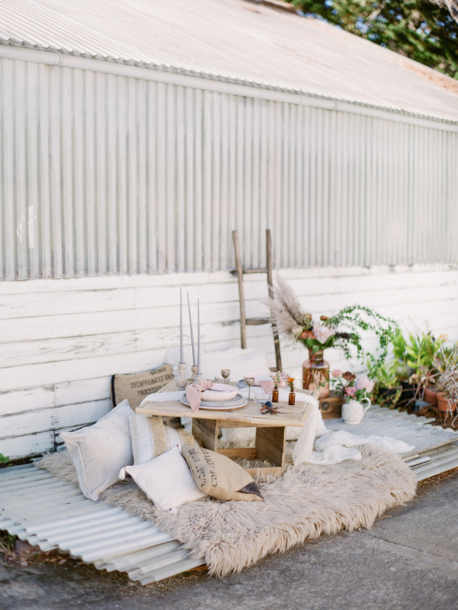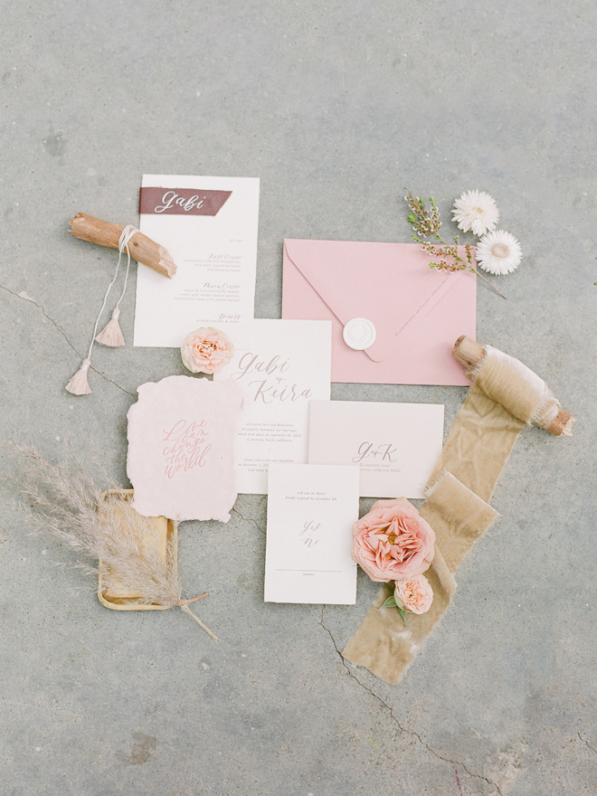 “Our photoshoot is inspired by the free-spirited culture, creative energy and beautiful natural landscape of Byron Bay Australia. We translate the Australian bohemia in Northern Californian language using natural textures such as wood and jute, airy ambiance and soft colors. Our pop of color comes from the flowers and we incorporate lots of dried elements such as flower pods, dried pampas grass etc. In our ceremony the focal point is semi-circle structure of grape wood, pops of blooms, pampas grass and other dried elements, overlooking the sunset over the Pacific Ocean. Our lounge area is a cozy and intimate space with pillows, large traditional Bulgarian rug and stunning calligraphy.
