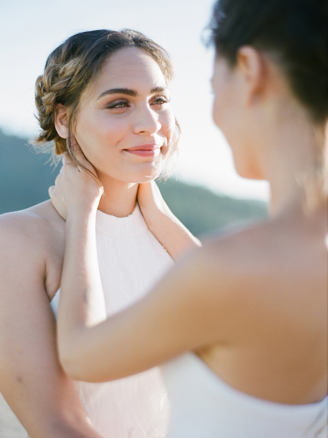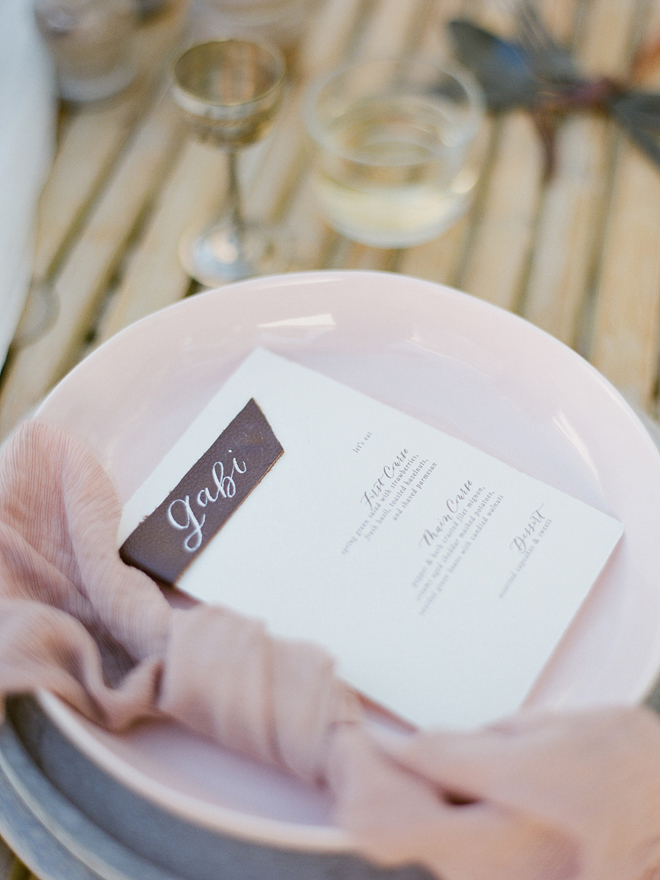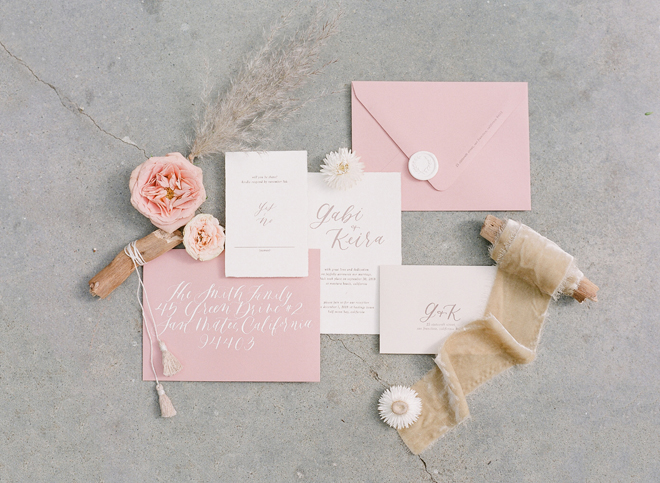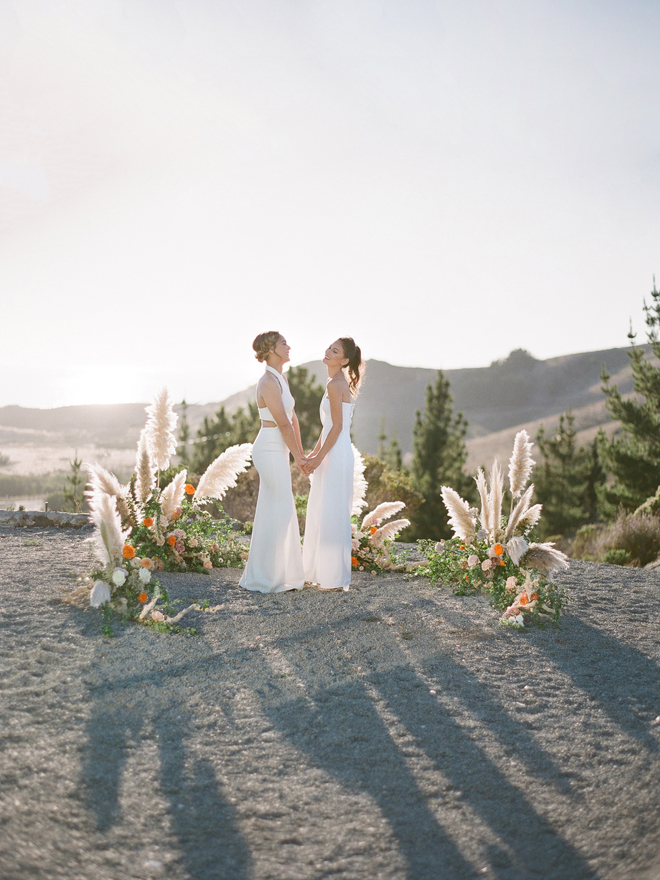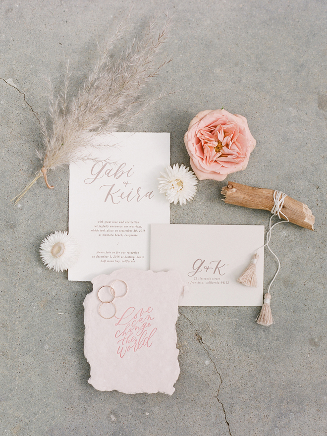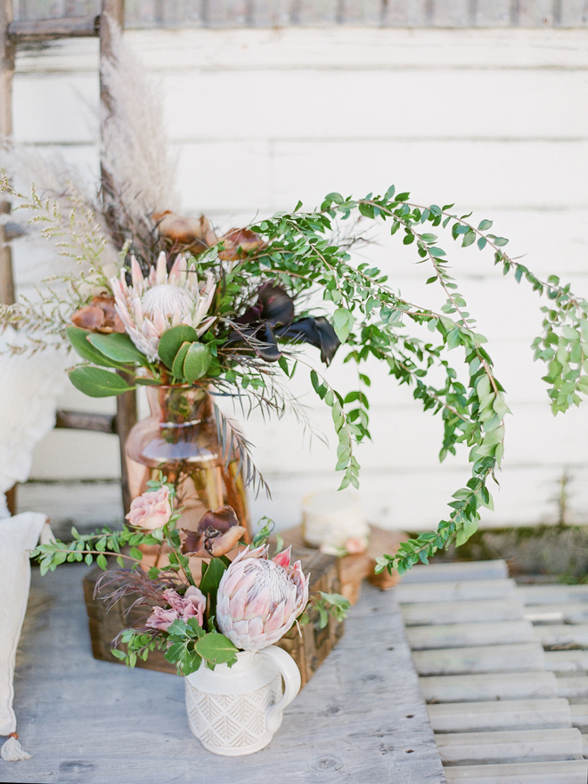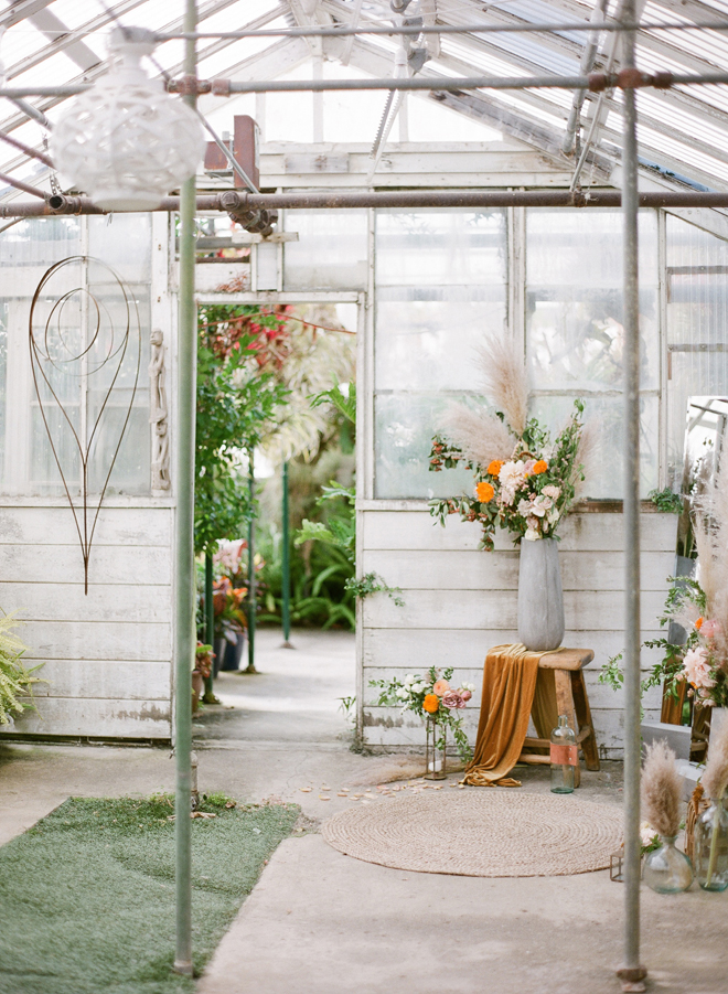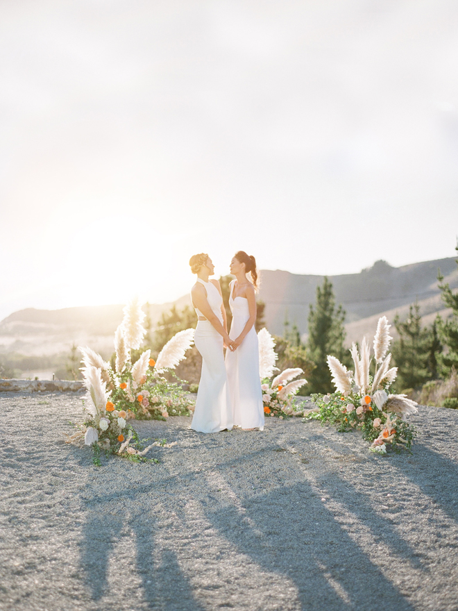 “Our photoshoot is inspired by the free-spirited culture, creative energy and beautiful natural landscape of Byron Bay Australia. We translate the Australian bohemia in Northern Californian language using natural textures such as wood and jute, airy ambiance and soft colors. Our pop of color comes from the flowers and we incorporate lots of dried elements such as flower pods, dried pampas grass etc. In our ceremony the focal point is semi-circle structure of grape wood, pops of blooms, pampas grass and other dried elements, overlooking the sunset over the Pacific Ocean. Our lounge area is a cozy and intimate space with pillows, large traditional Bulgarian rug and stunning calligraphy.