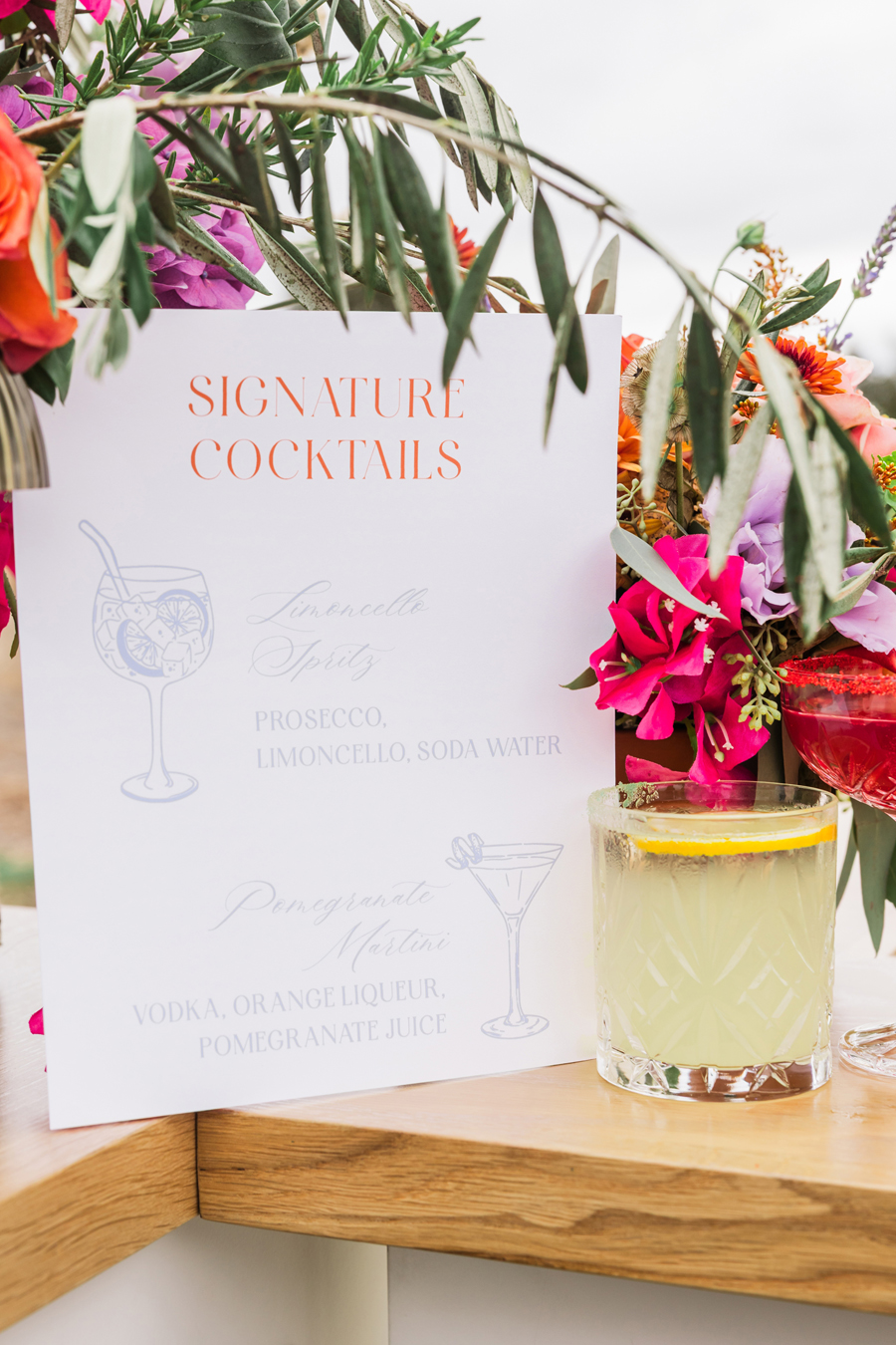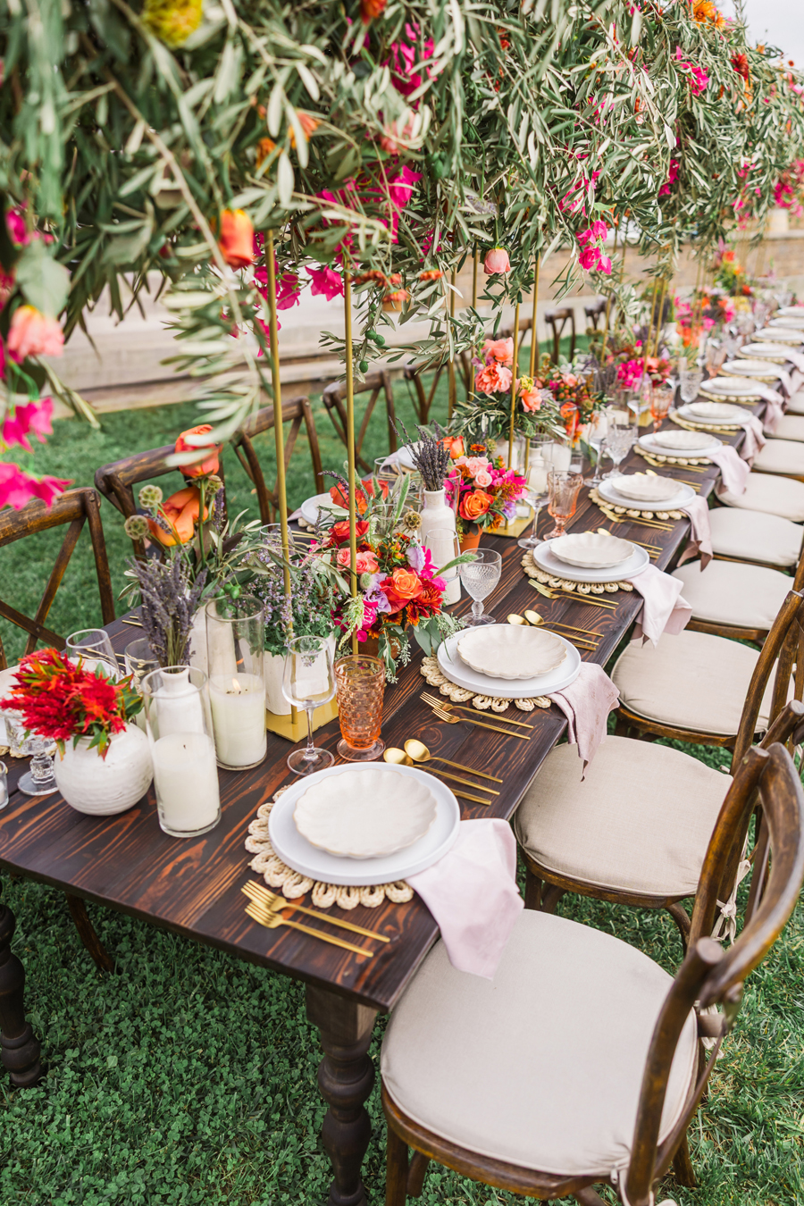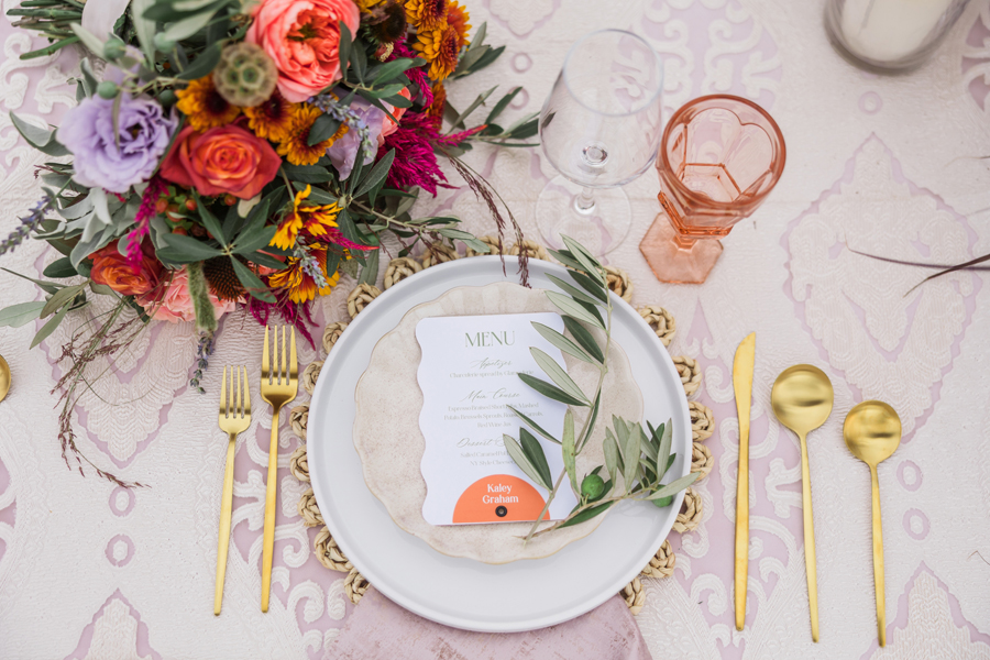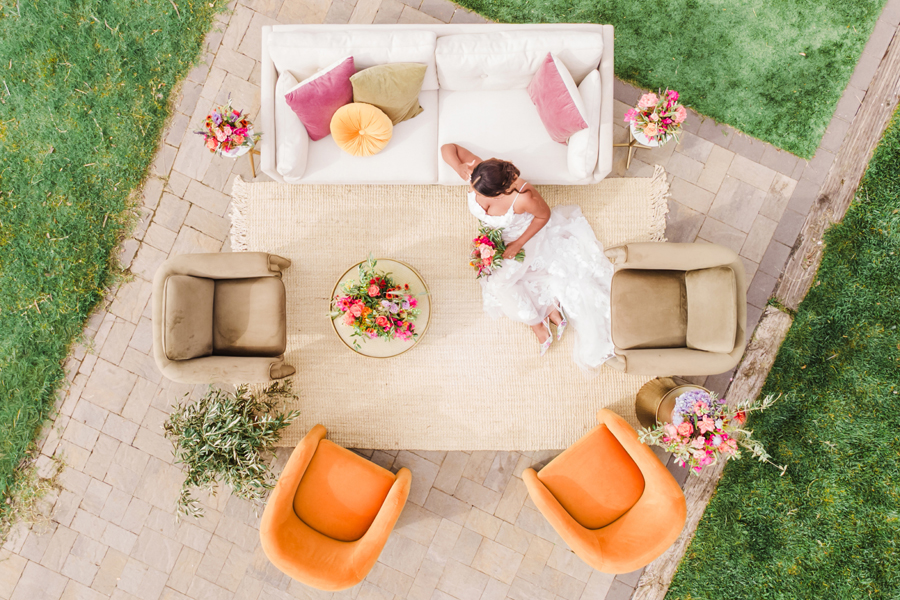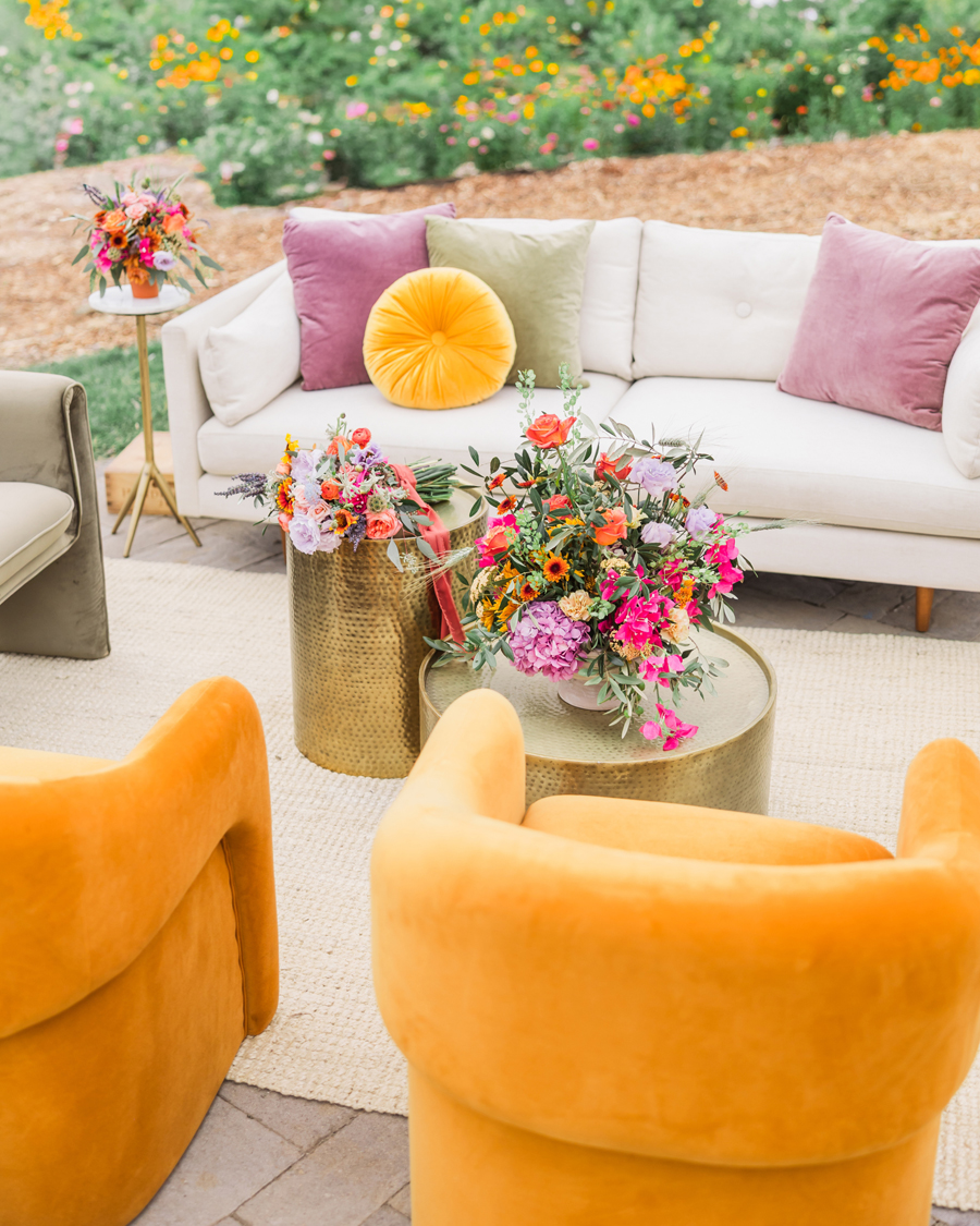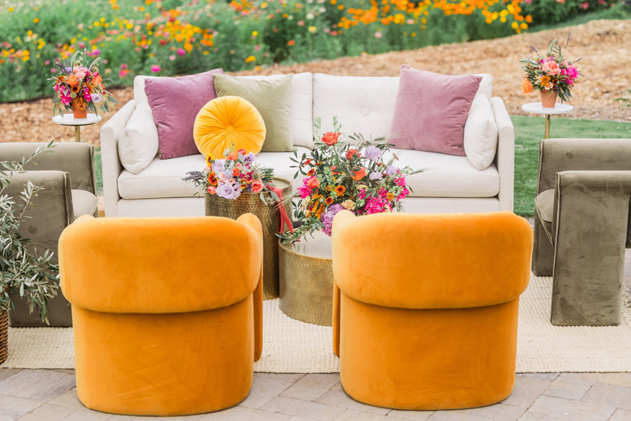 Led by Sara from Rainbow Weddings & Events, the talented creative team made up of amazing local wedding professionals curated each moment with purpose—from the lush ceremony aisle and abundant floral installations to the playful lounge vignettes, citrus-inspired cocktails, and artfully styled tablescapes. A rich palette of coral, pink, orange, and golden yellow blooms infused the space with warmth and movement, while soft neutrals and natural materials grounded the look, allowing the florals to truly shine. Designed as a celebration of love, individuality, and unapologetic color, this shoot is proof that weddings can feel refined and editorial while still embracing joy, personality, and a little bit of fun. Scroll on for endless inspiration—and a reminder that when it comes to love, more is definitely more.
