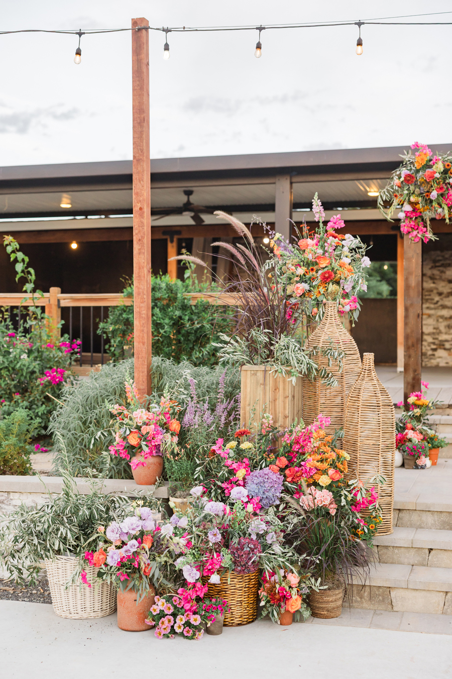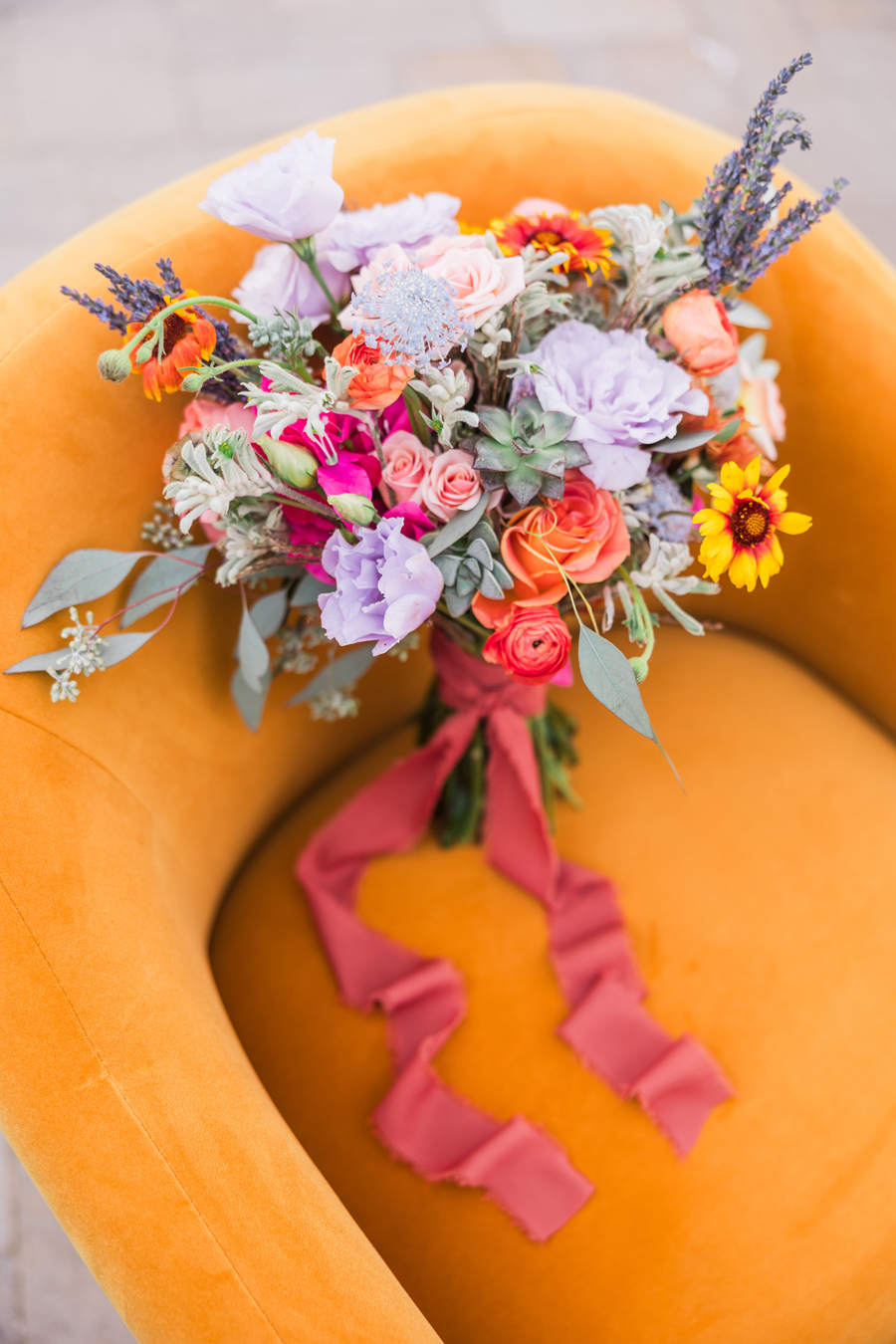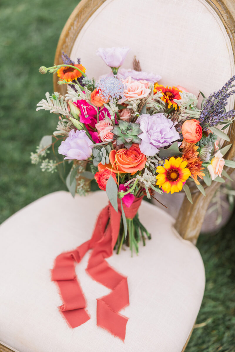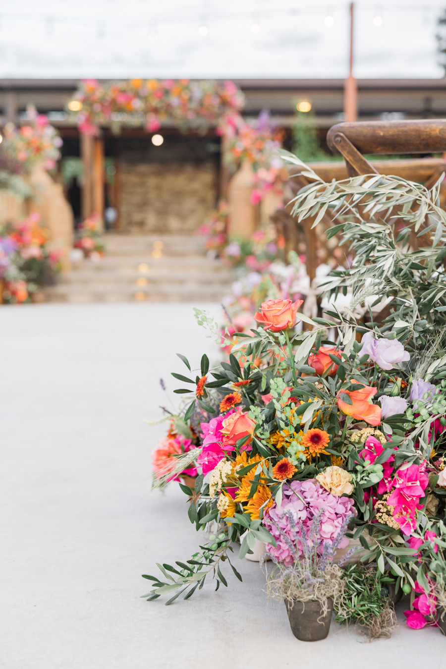 Led by Sara from Rainbow Weddings & Events, the talented creative team made up of amazing local wedding professionals curated each moment with purpose—from the lush ceremony aisle and abundant floral installations to the playful lounge vignettes, citrus-inspired cocktails, and artfully styled tablescapes. A rich palette of coral, pink, orange, and golden yellow blooms infused the space with warmth and movement, while soft neutrals and natural materials grounded the look, allowing the florals to truly shine. Designed as a celebration of love, individuality, and unapologetic color, this shoot is proof that weddings can feel refined and editorial while still embracing joy, personality, and a little bit of fun. Scroll on for endless inspiration—and a reminder that when it comes to love, more is definitely more.