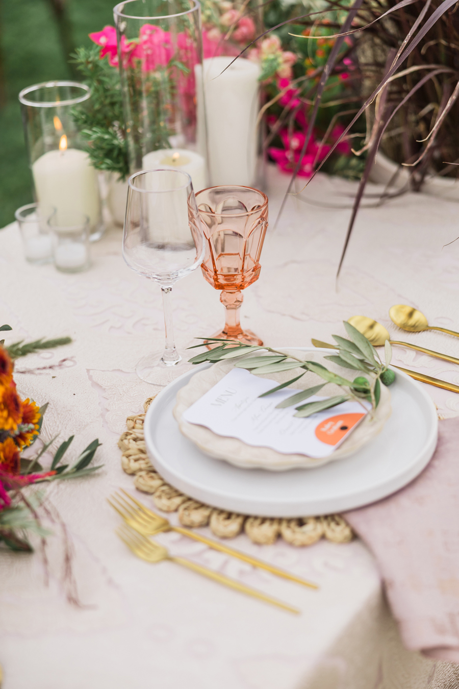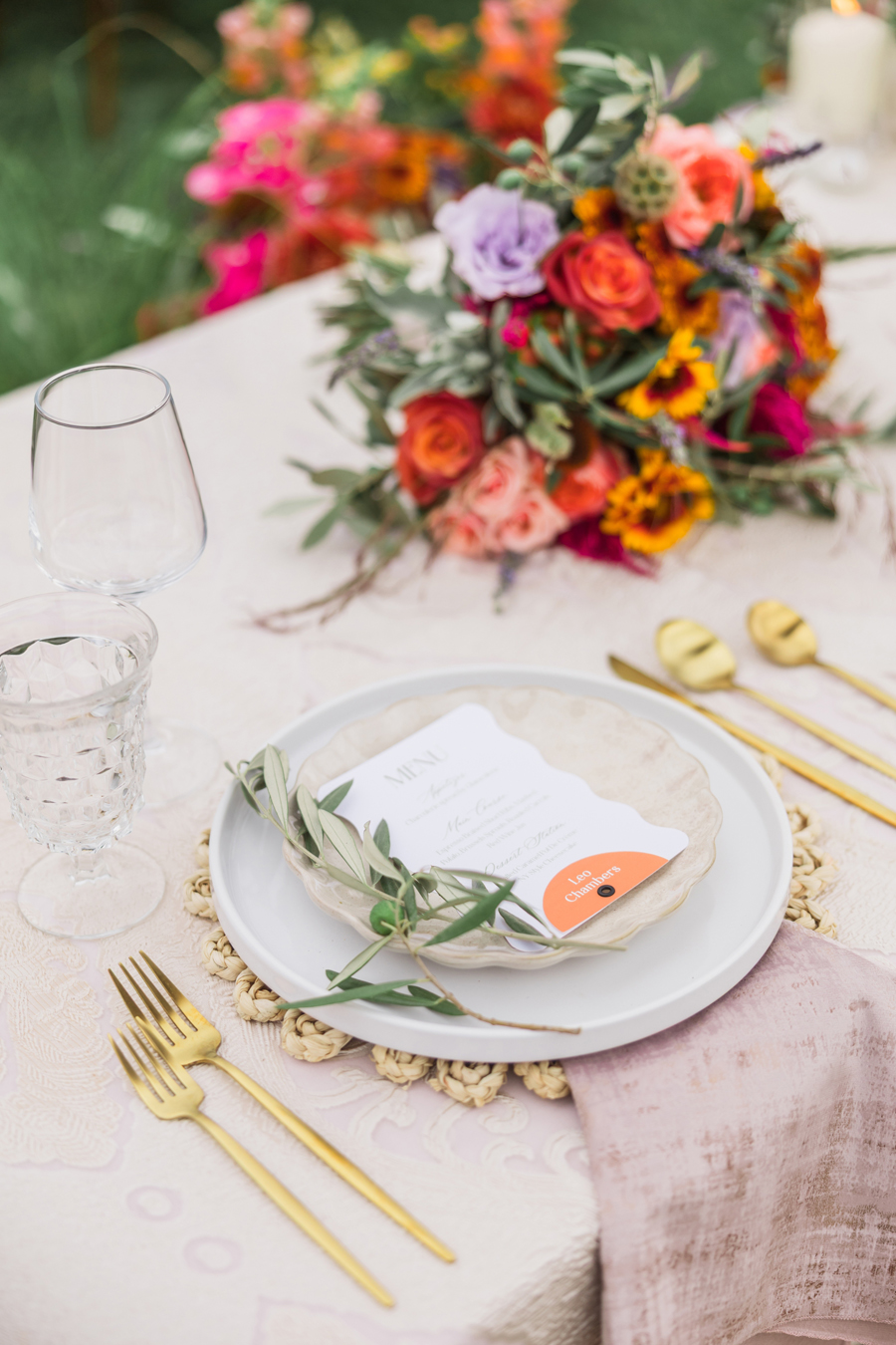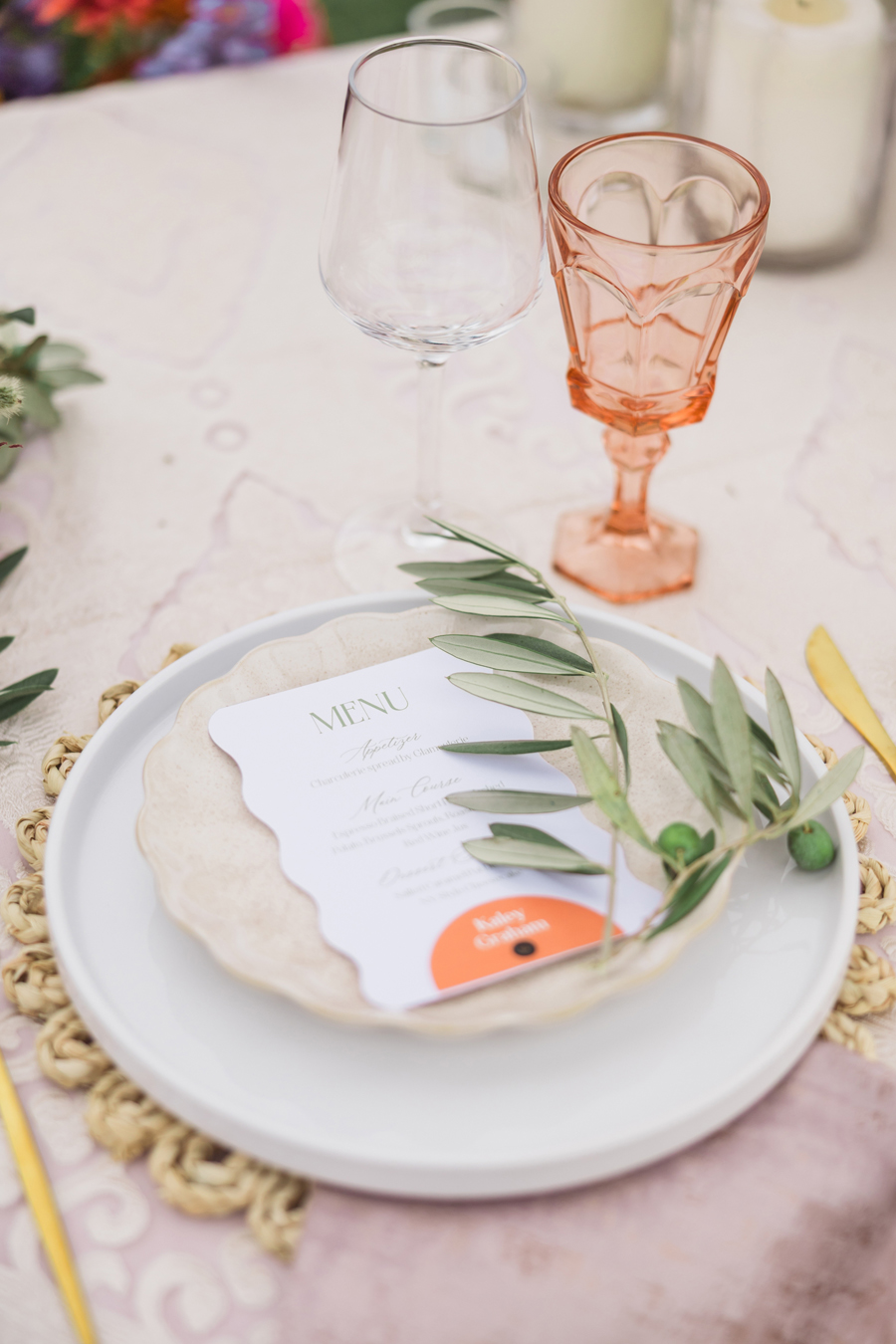 I pulled inspiration from sun-drenched landscapes and coastal vineyard gatherings, leaning into olive greens, terracotta tones, soft sandy neutrals, pops of citrus/peach, and a touch of muted lavender for something unexpected. The design focused on natural materials and details that feel collected rather than styled—linen tablecloths, vintage glassware, ceramics, olive branches, and florals that look like they were gathered straight from the garden.