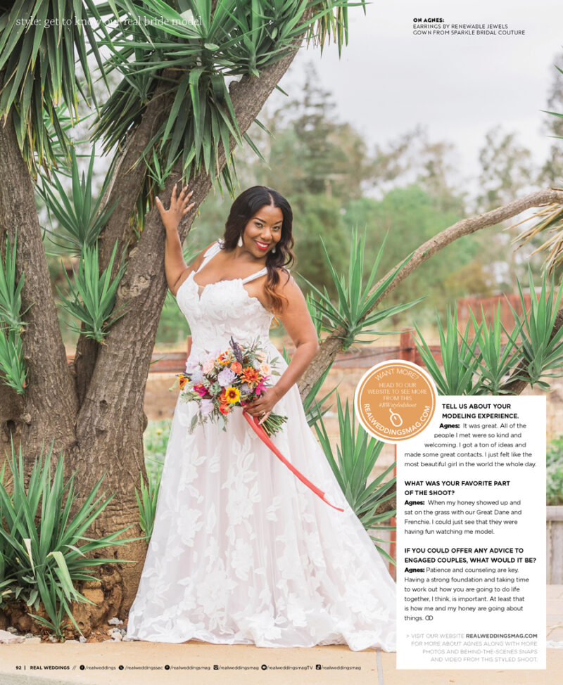 Above Photo: On Agnes: Earrings by Renewable Jewels; Gown from Sparkle Bridal Couture