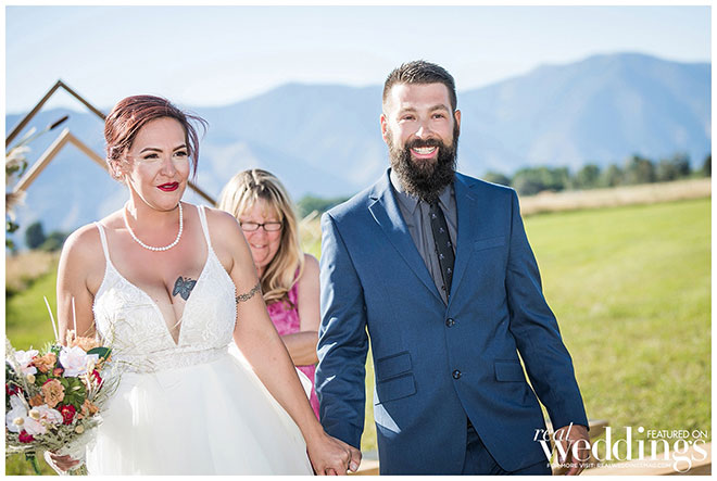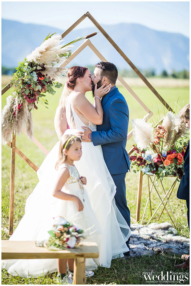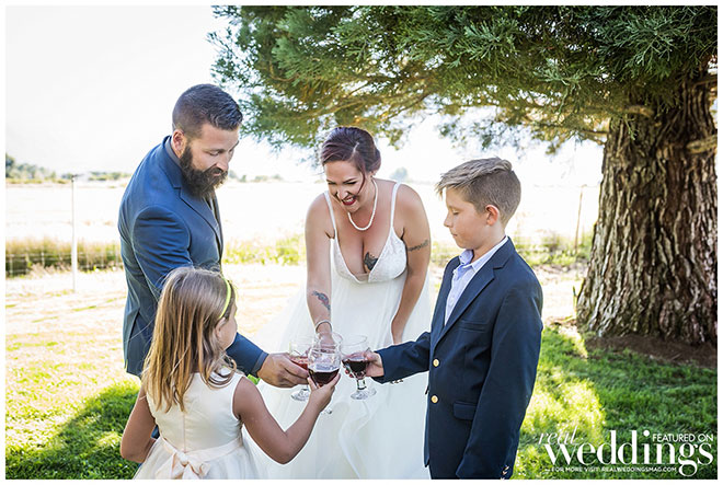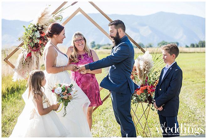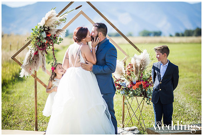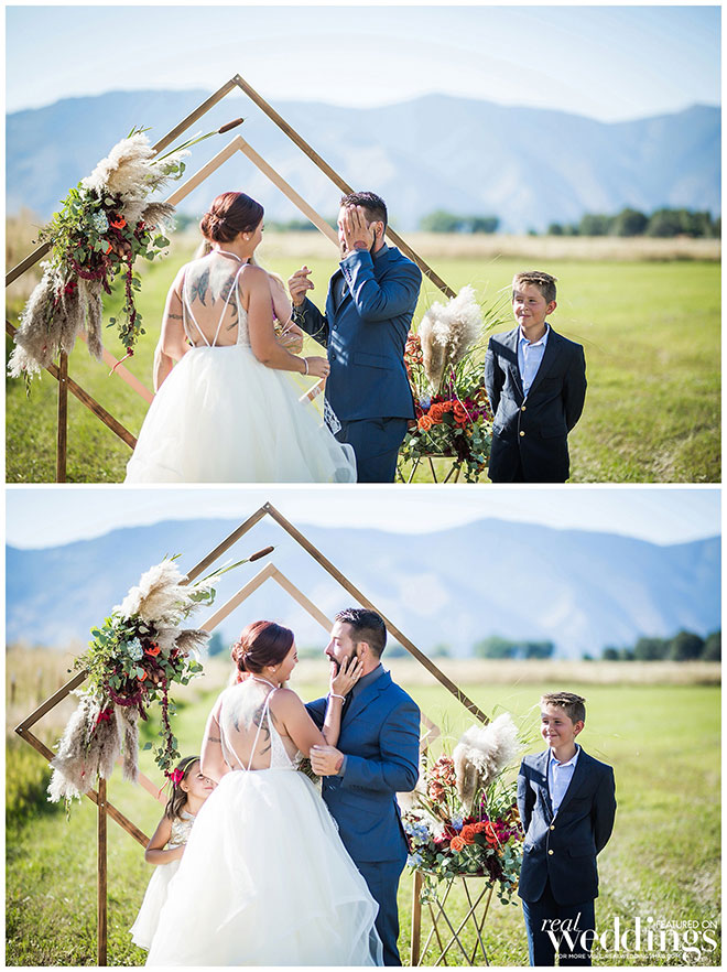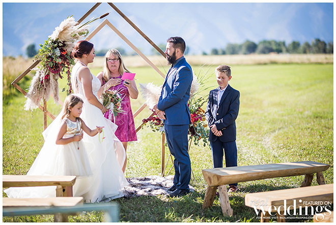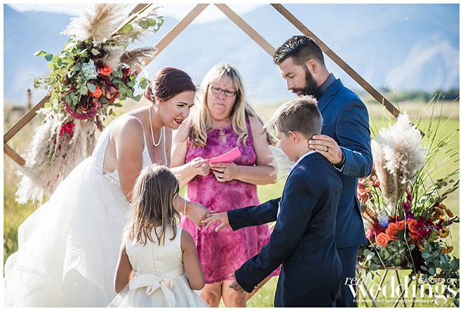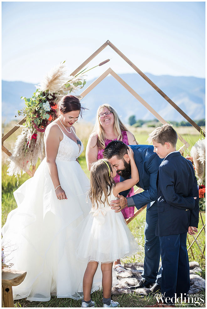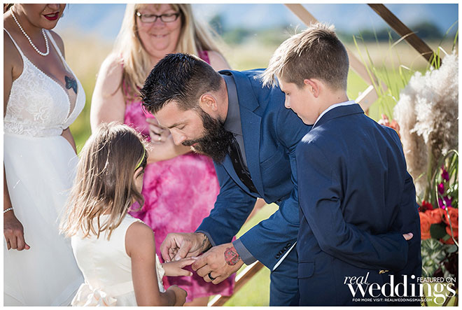 Angelina had the idea of surprising her groom with a vow renewal, and convinced Rich to head home mid-photo shoot to freshen up for our Behind-the-Scenes interview and grab the kids. Meanwhile, Cassidy Braddock of styled.by.sass did Angelina’s hair and makeup for the occasion, and then we put her in a beautiful gown (courtesy of The Clothes Mine) so that she could walk down the aisle in style. Accompanied by an impromptu guitar serenade by our real groom model, Tony, Angelina strolled up the aisle to meet Rich at the altar where the couple shared words of promise with their two kids, Tristen and Ivy, by their sides, all officiated by Rich’s mom Lori—and the kids received commitment rings too! Tears. Were. Flowing.