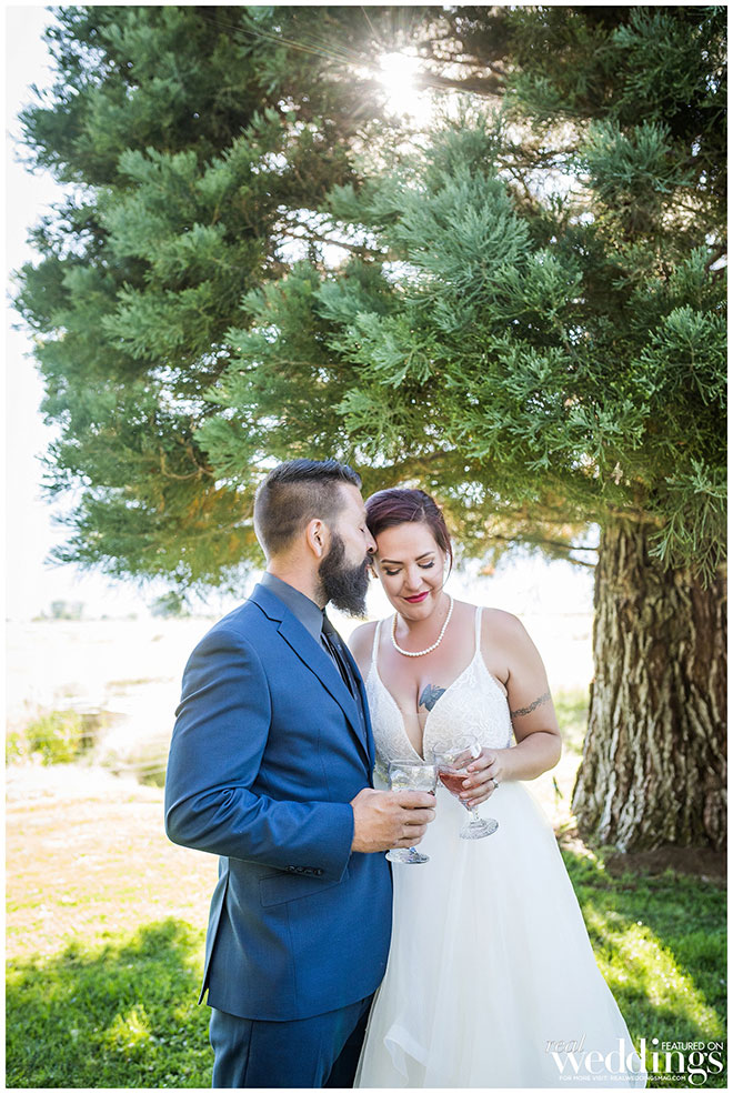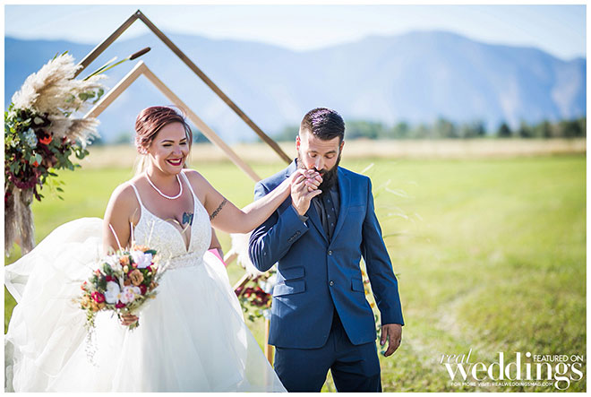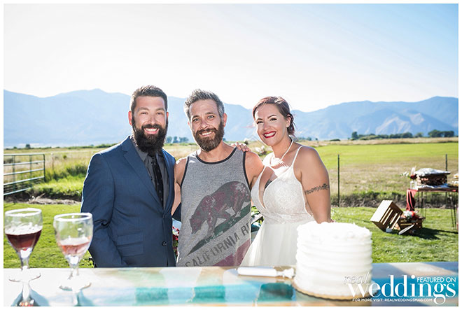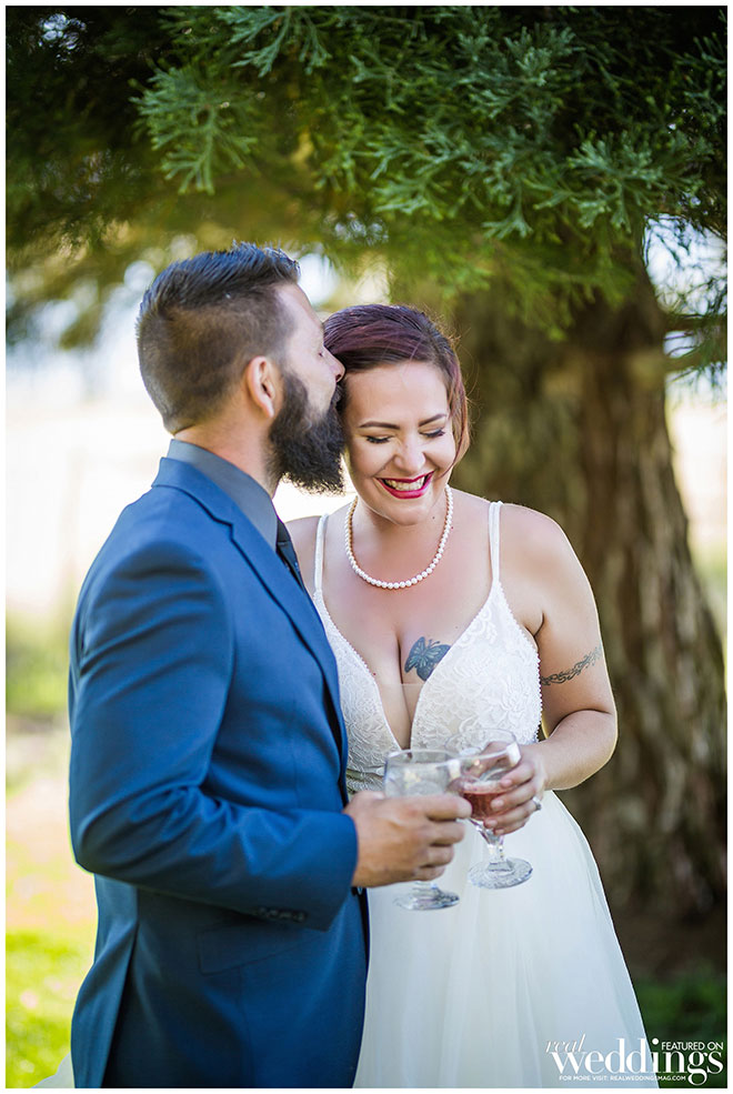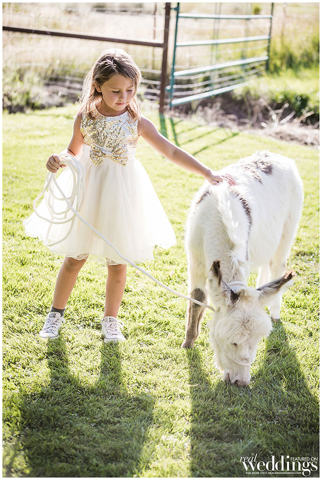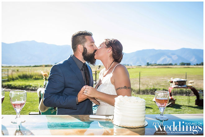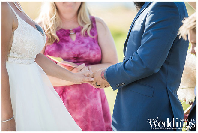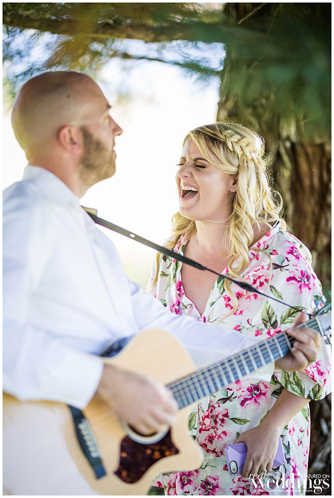 Angelina had the idea of surprising her groom with a vow renewal, and convinced Rich to head home mid-photo shoot to freshen up for our Behind-the-Scenes interview and grab the kids. Meanwhile, Cassidy Braddock of styled.by.sass did Angelina’s hair and makeup for the occasion, and then we put her in a beautiful gown (courtesy of The Clothes Mine) so that she could walk down the aisle in style. Accompanied by an impromptu guitar serenade by our real groom model, Tony, Angelina strolled up the aisle to meet Rich at the altar where the couple shared words of promise with their two kids, Tristen and Ivy, by their sides, all officiated by Rich’s mom Lori—and the kids received commitment rings too! Tears. Were. Flowing.