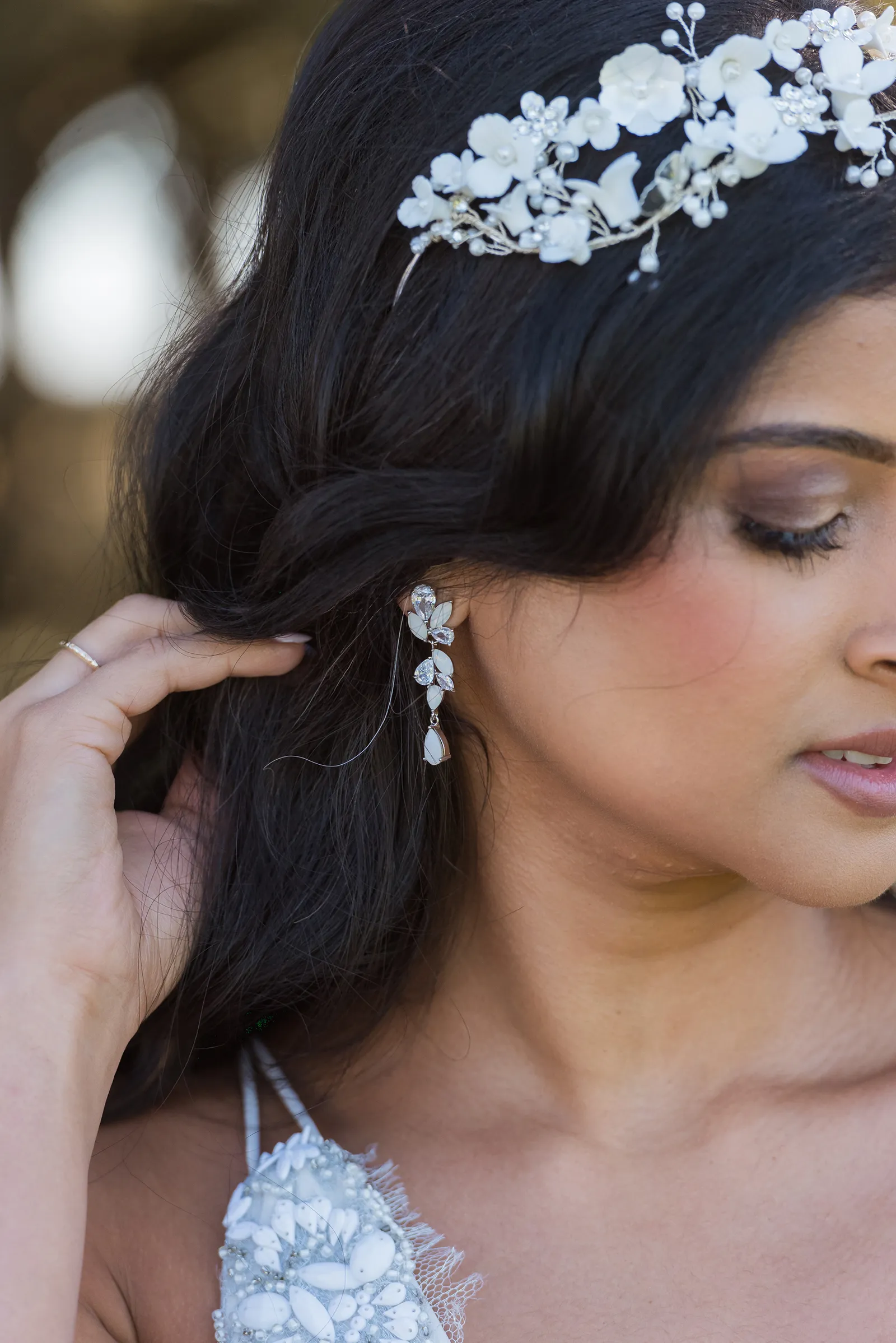 On Sahana: Headpiece and Earrings by Mariell; Gown from Brides for a Cause