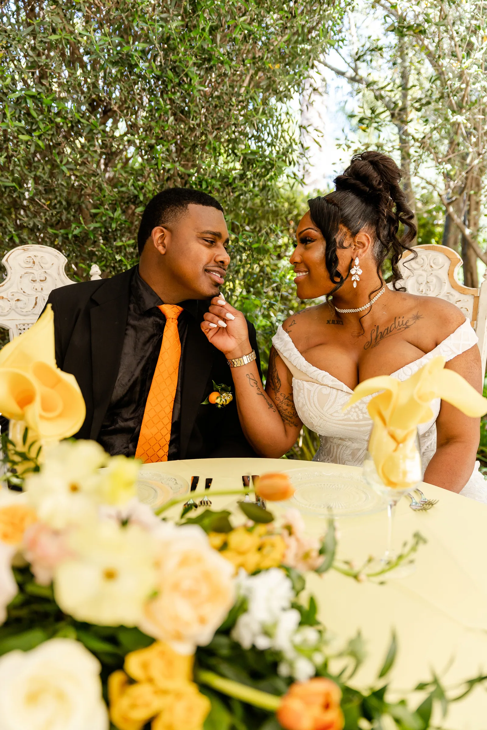 Wedding industry vendors constantly refine their knowledge and style to match the needs of their clients. Therefore, we wanted to provide a space where each vendor could have creative control allowing them to display what they can offer to real couples. The planning and design team worked closely with each vendor and our real couples to infuse their brand with the styled shoots vision. This Citrus Soirée theme displays fresh crisp details to give a daring but subtle feel. This was achieved by incorporating fresh kumquats in the floral arrangements and pumpkin hue linens with an intricate lace overlay. -Paige, Megan Paige Events.