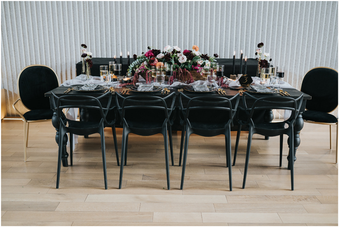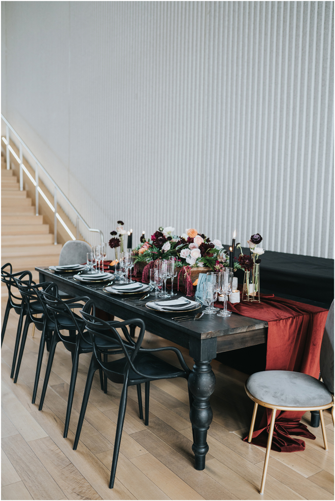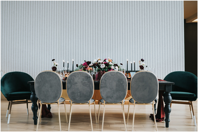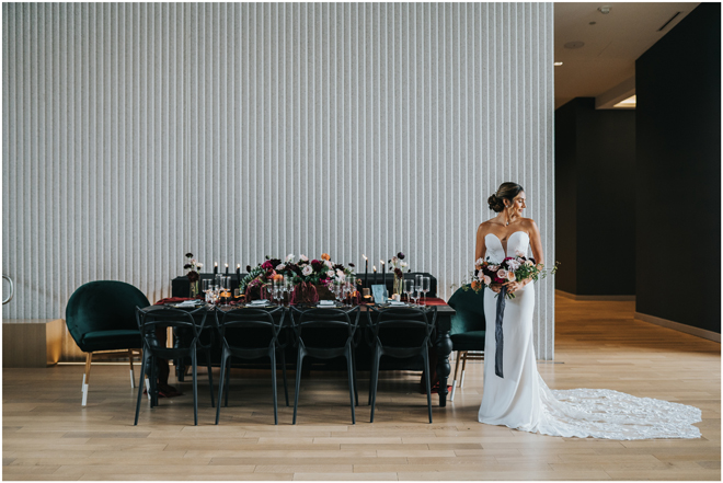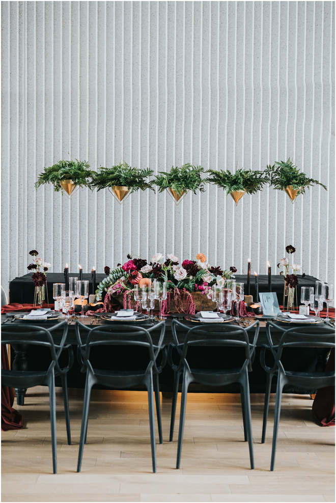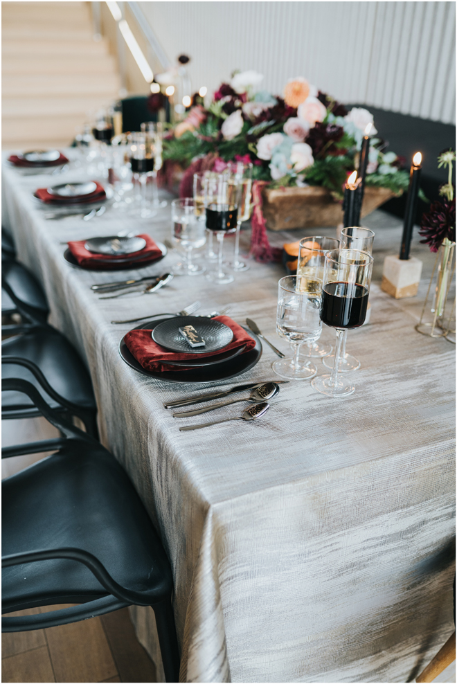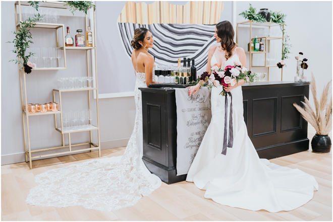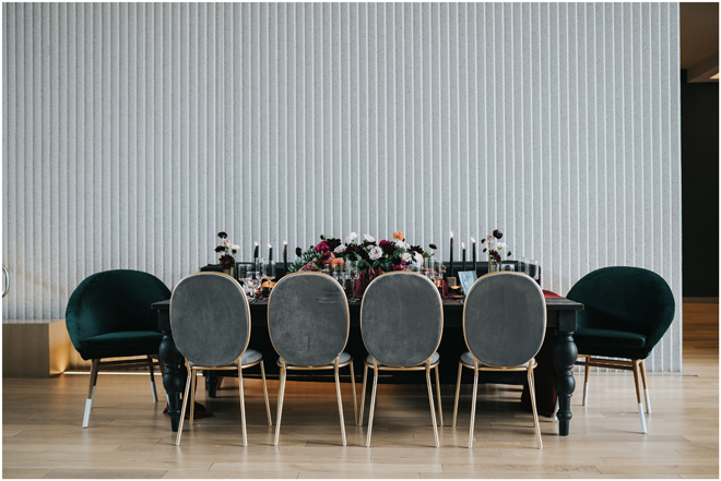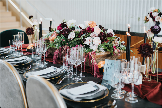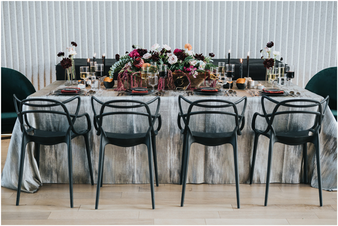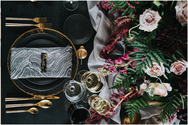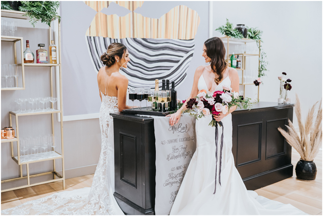 Do you love styled shoot wedding inspiration as much as we do? Well, you’re going to LOVE this #StyledShootSunday, with several variations on the table top and chairs, one killer bar, two beautiful brides and an epic staircase, this dark, edgy and drop-dead gorgeous contemporary styled shoot at the Kimpton Sawyer Hotel has it all! We especially love all of the textures and the incredible details, don’t you?!