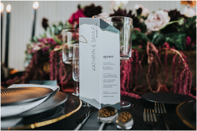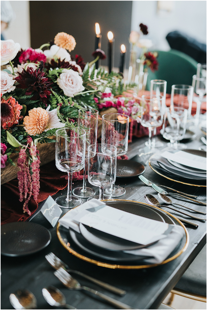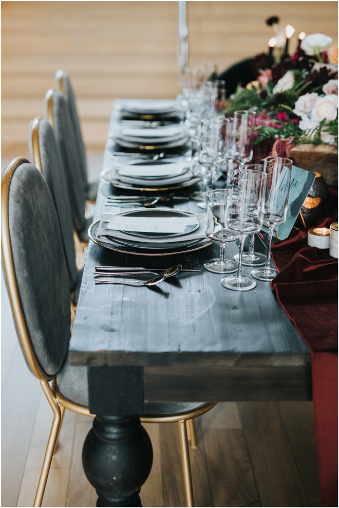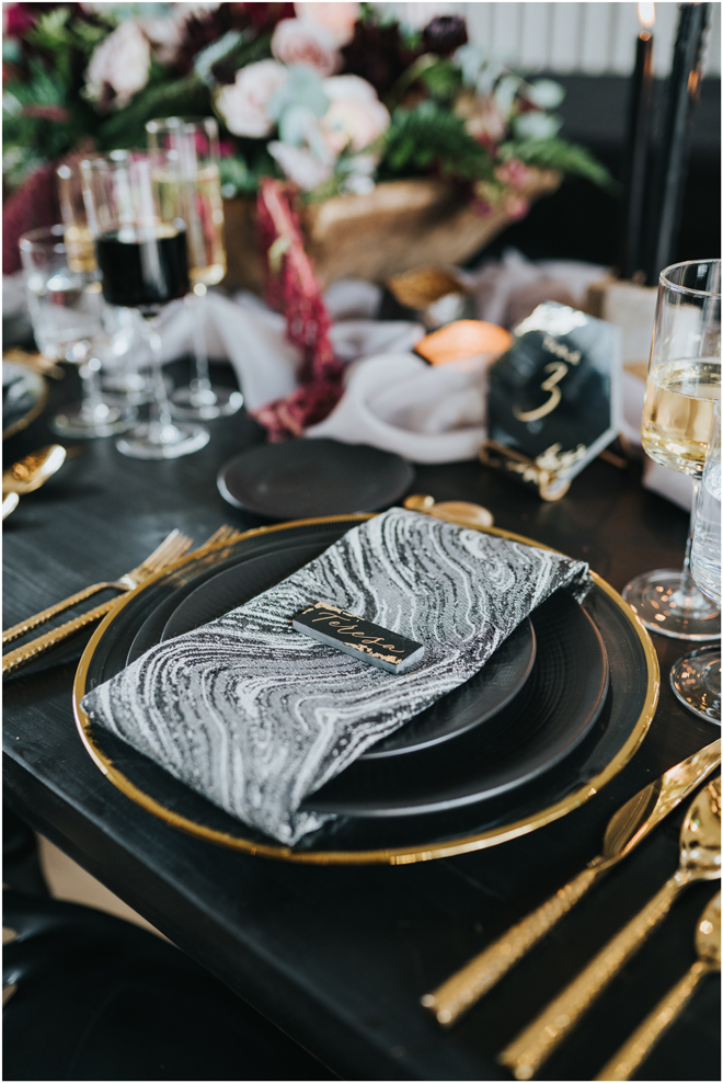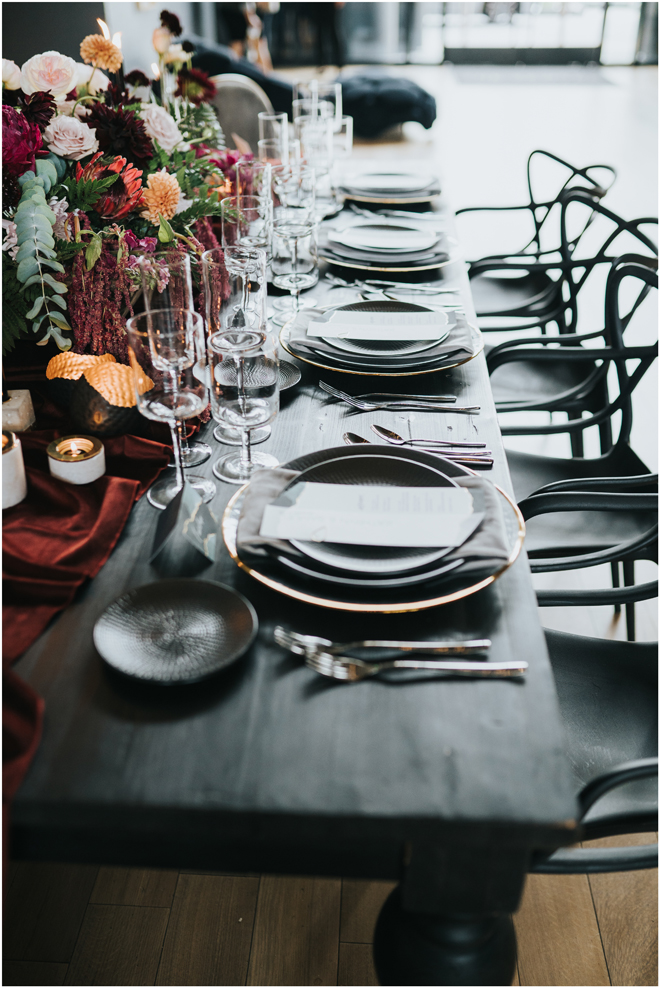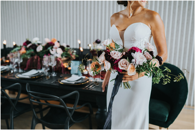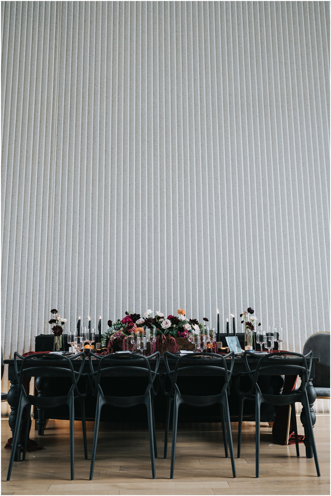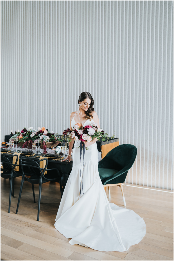 Do you love styled shoot wedding inspiration as much as we do? Well, you’re going to LOVE this #StyledShootSunday, with several variations on the table top and chairs, one killer bar, two beautiful brides and an epic staircase, this dark, edgy and drop-dead gorgeous contemporary styled shoot at the Kimpton Sawyer Hotel has it all! We especially love all of the textures and the incredible details, don’t you?!