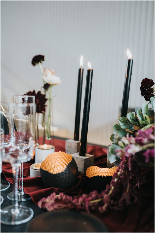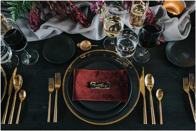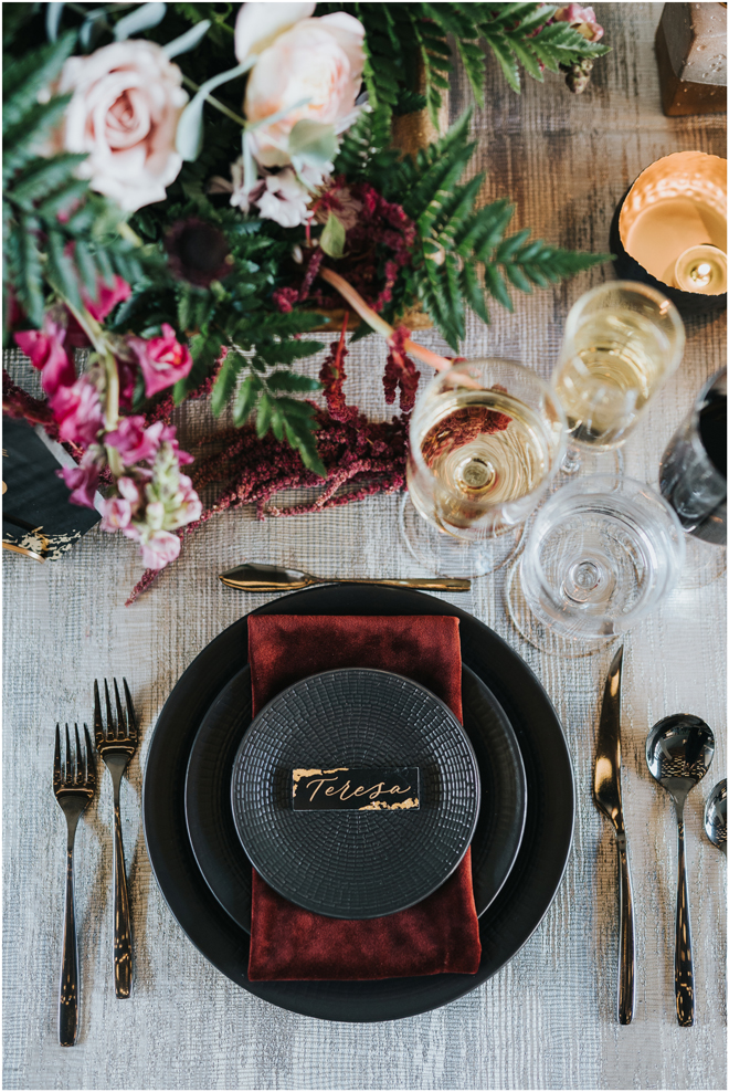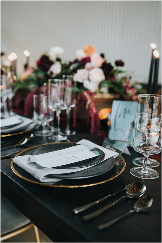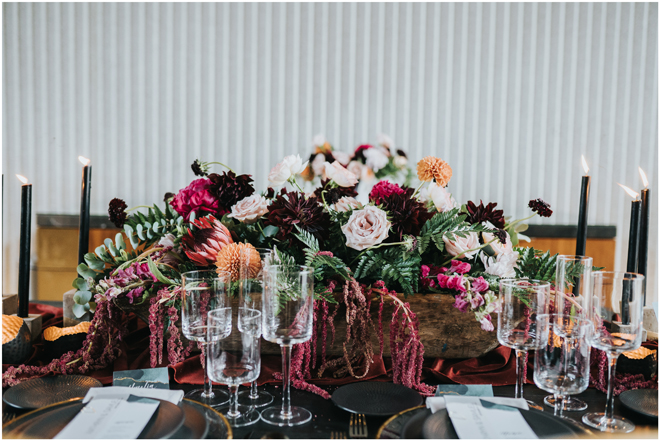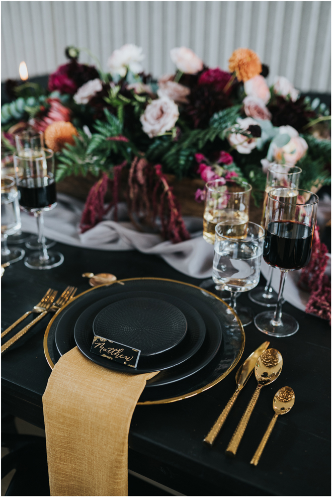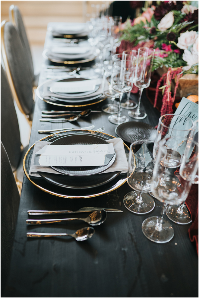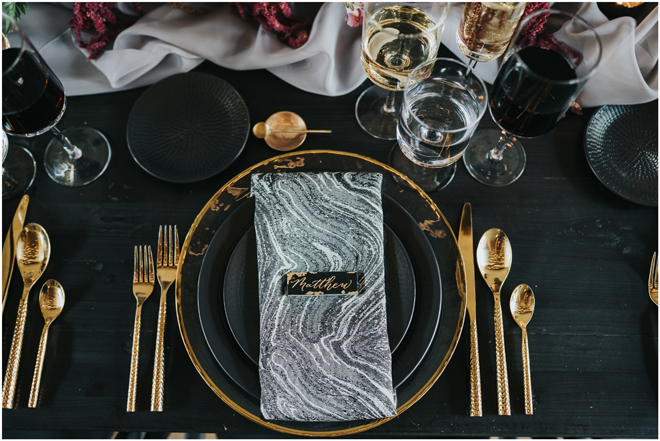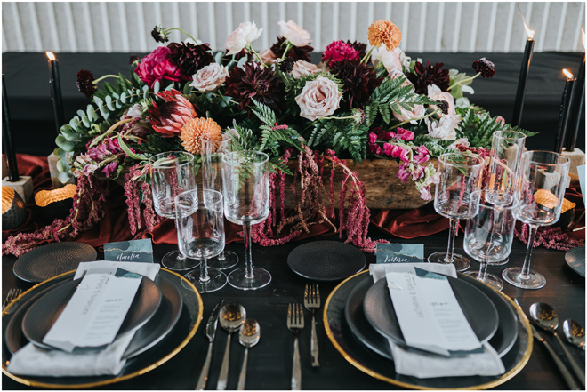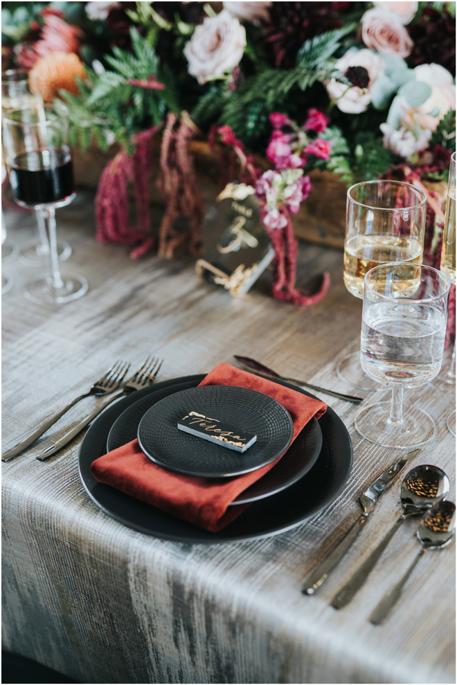 Do you love styled shoot wedding inspiration as much as we do? Well, you’re going to LOVE this #StyledShootSunday, with several variations on the table top and chairs, one killer bar, two beautiful brides and an epic staircase, this dark, edgy and drop-dead gorgeous contemporary styled shoot at the Kimpton Sawyer Hotel has it all! We especially love all of the textures and the incredible details, don’t you?!
