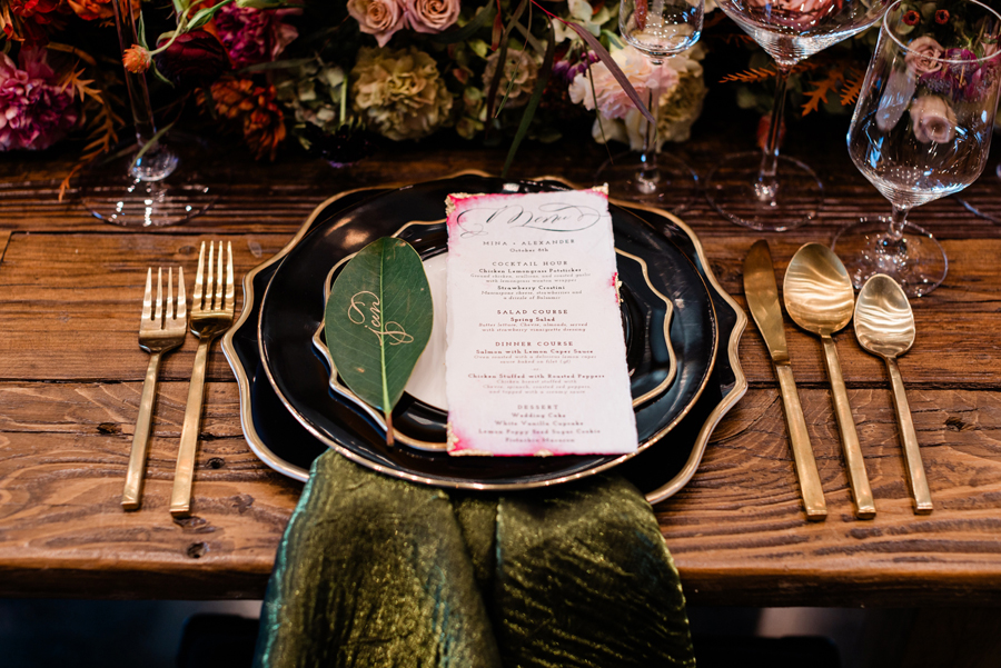 And talk about details…our “Crazy in Love” styled shoot was loaded with them: the rich florals, the handcrafted farm tables and benches, the bespoke paperie and calligraphy, the gorgeous table top elements, the delicious desserts…all set against the backdrop of the breathtaking Domenico Winery & Vineyards | Amador venue. Pace yourself…there’s so much beauty here to take in!
