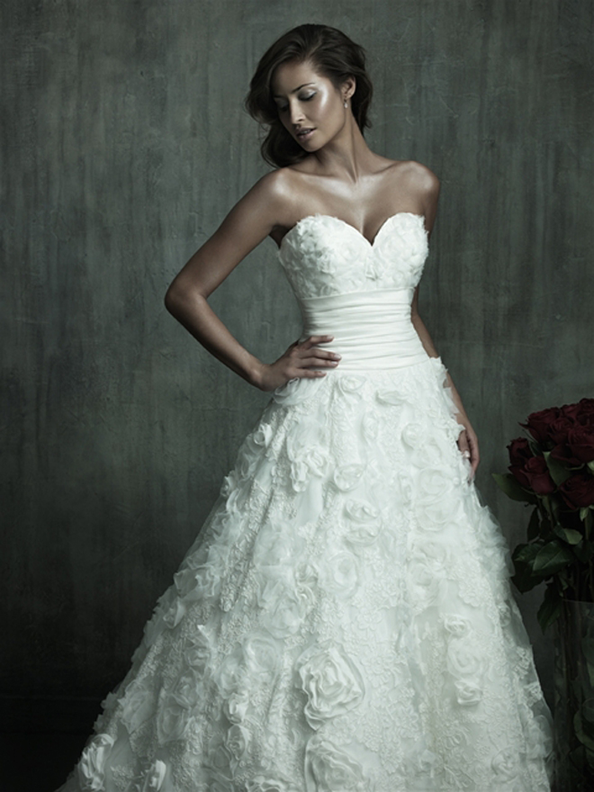 This gown creates drama with rich three-dimensional details throughout. The sweetheart bodice is embellished with soft flowers and lace appliqués while a ruched taffeta band defines the waist.