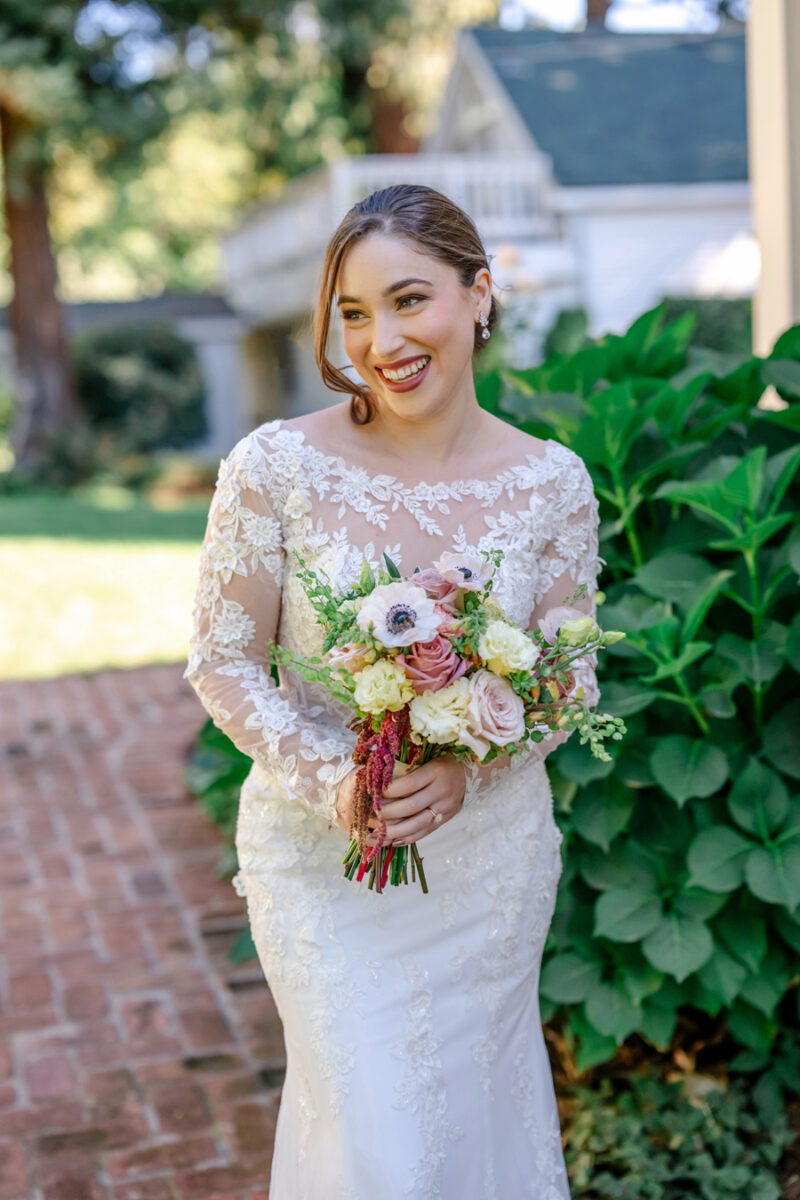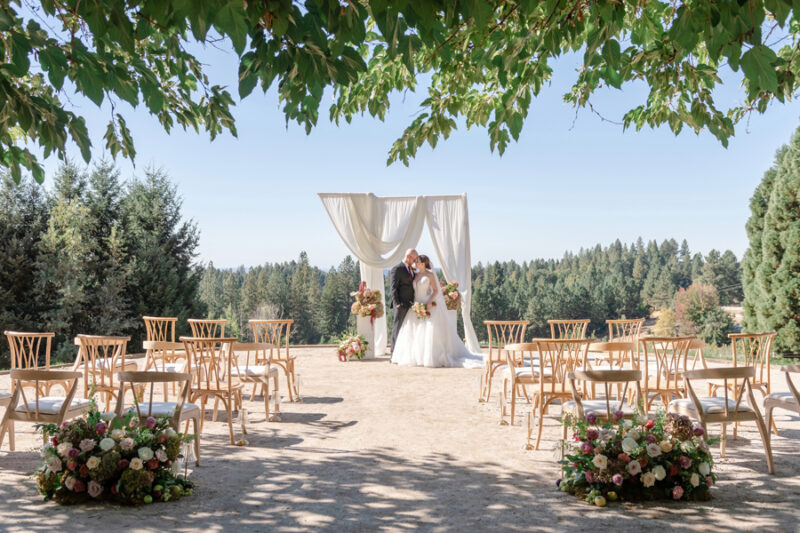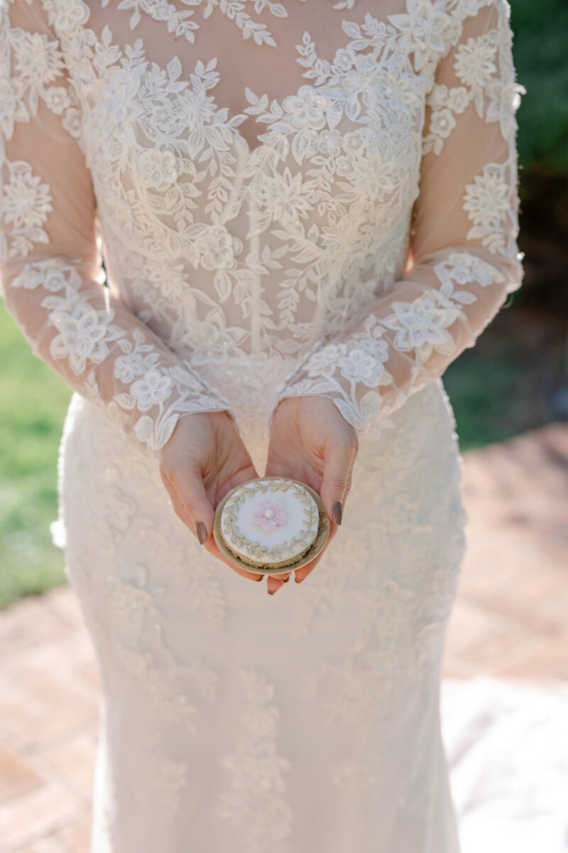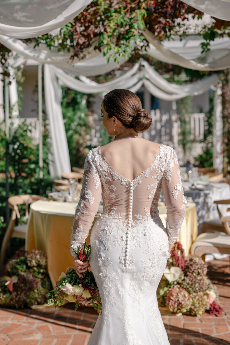 When we asked our shoot designer Kendall with Kendall Melissa Events about her inspiration for the shoot, she said, “As soon as I stepped onto the beautiful, sprawling lawn at The Farmhouse at Apple Hill, I was immediately inspired. It is hard not to be swept away by the expansive views of the orchards that sit just beyond the ceremony site, which offers breathtaking sunset vistas. I’ve always been drawn to shapes and their juxtaposition to draw inspiration from.