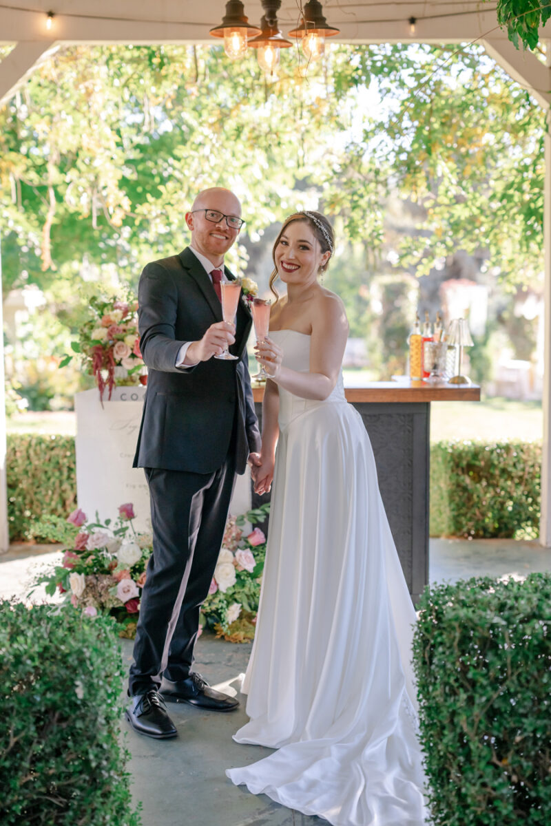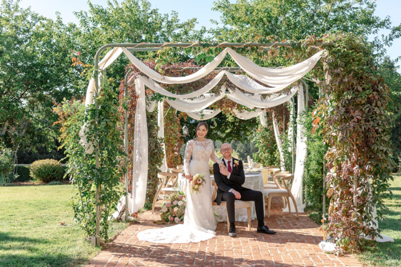 Flowing draping sways gently through the ceremony and reception spaces, creating a sense of airiness and ease, while lush florals and vintage-inspired accents add warmth, texture, and a touch of nostalgia. Thoughtful layering and playful details shine throughout the design, from beautifully set tabletops and cozy lounge moments tucked beneath the trees to an elegant cake display and customized signature cocktails enjoyed beneath the gazebo—each vignette feeling refined, inviting, and joyfully celebratory.