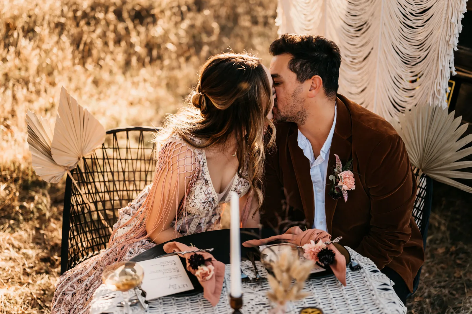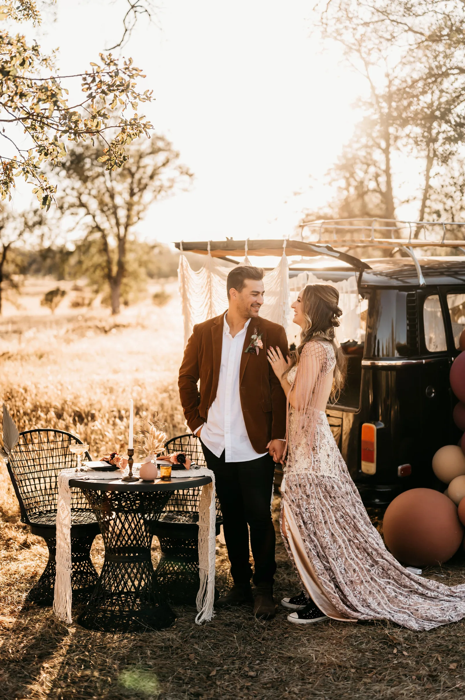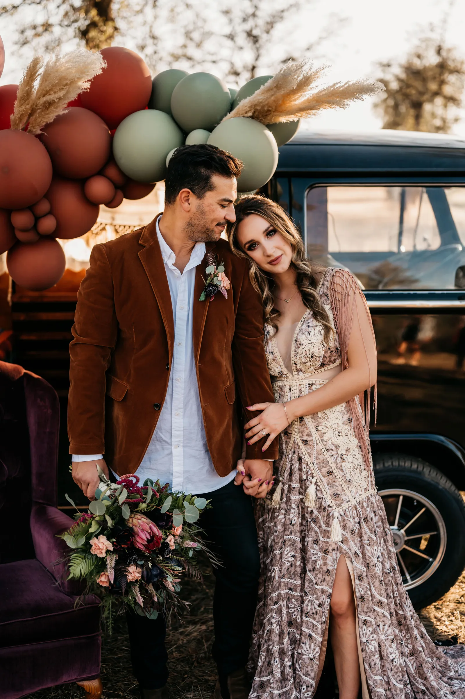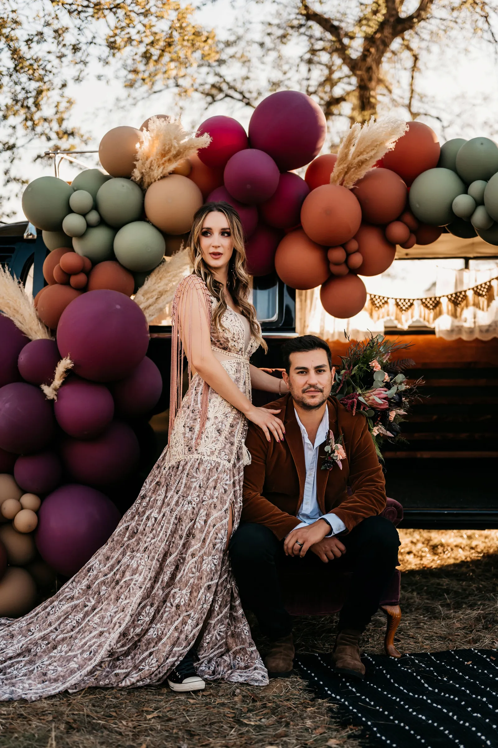 “The design and feel for this styled shoot was a moody, fun eclectic vibe. I wanted lots of velvet and a bit of a gypsy boho feel. It needed to be spunky, fun and not too perfect. I created a mood board full of rich warm fall colors, and the creating started. From the velvet studded Converse to the gorgeous invite suite, to the amazing colorful balloons. Every detail came together just perfectly. Our amazing real life couple was playful, carefree and a bit mischievous, which is exactly what we wanted for this shoot. The Photo Bus tied everything together with its stylish and playful aesthetic. We hope this can inspire you to go wild and have fun with colors and textures, and create a day that is unique to you!” -Chenoa Sedillo