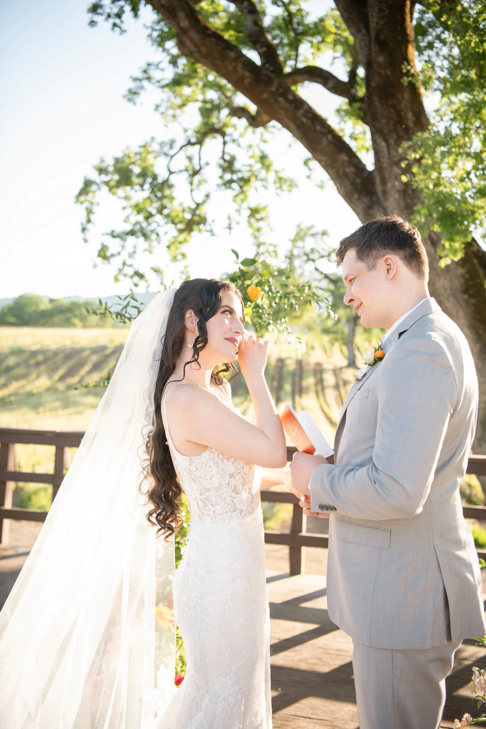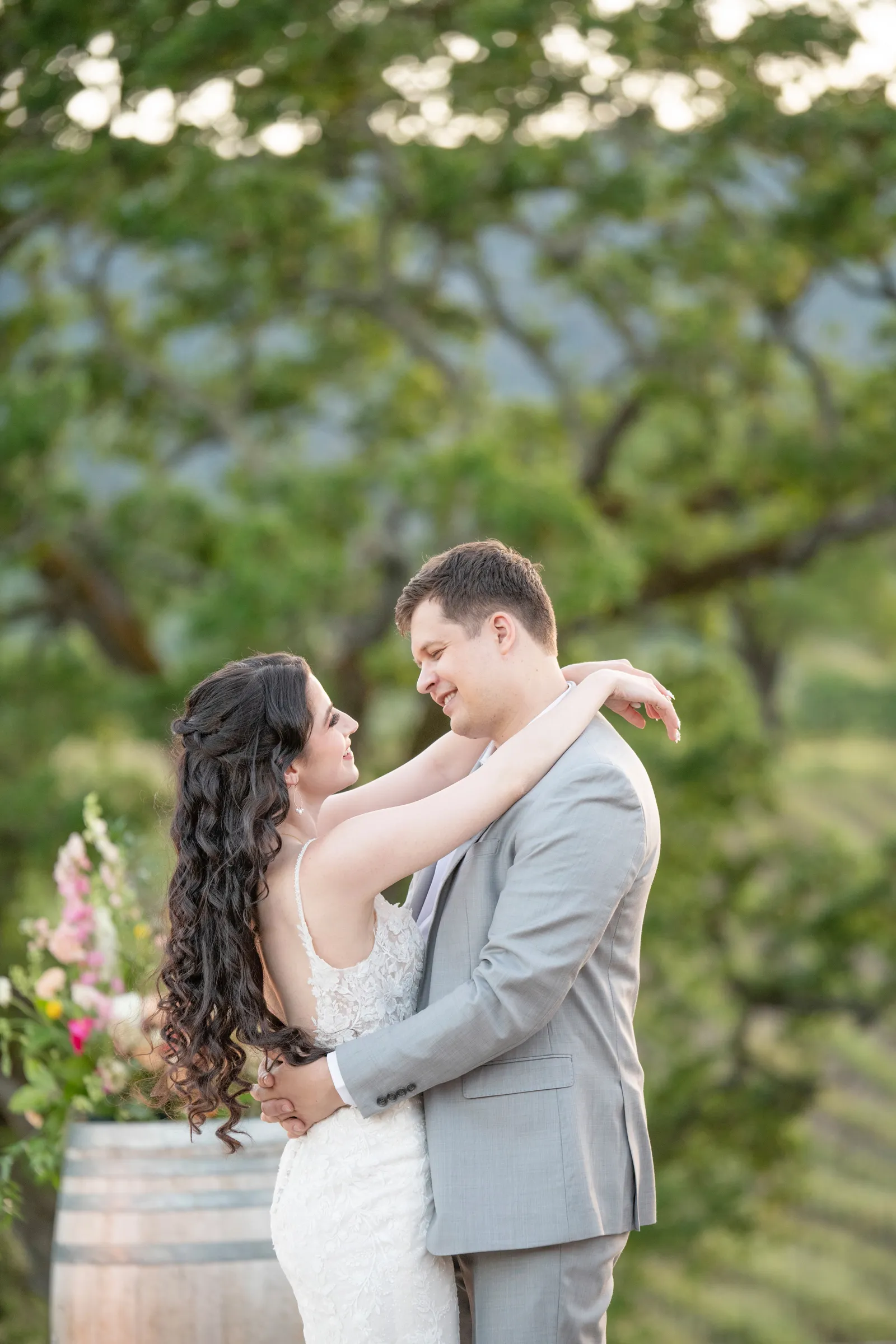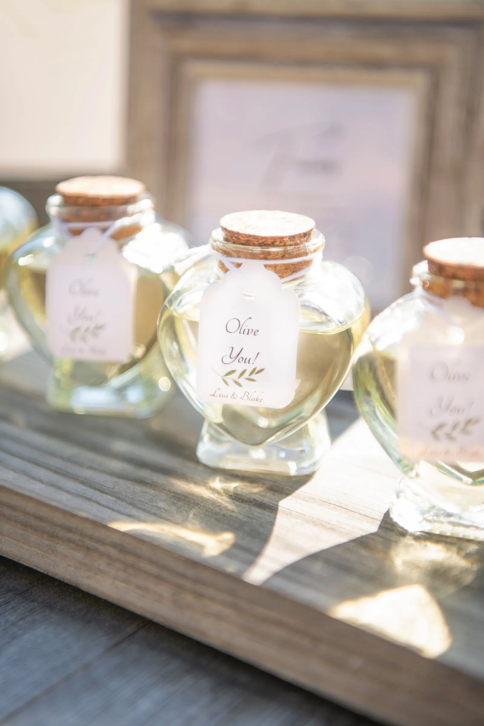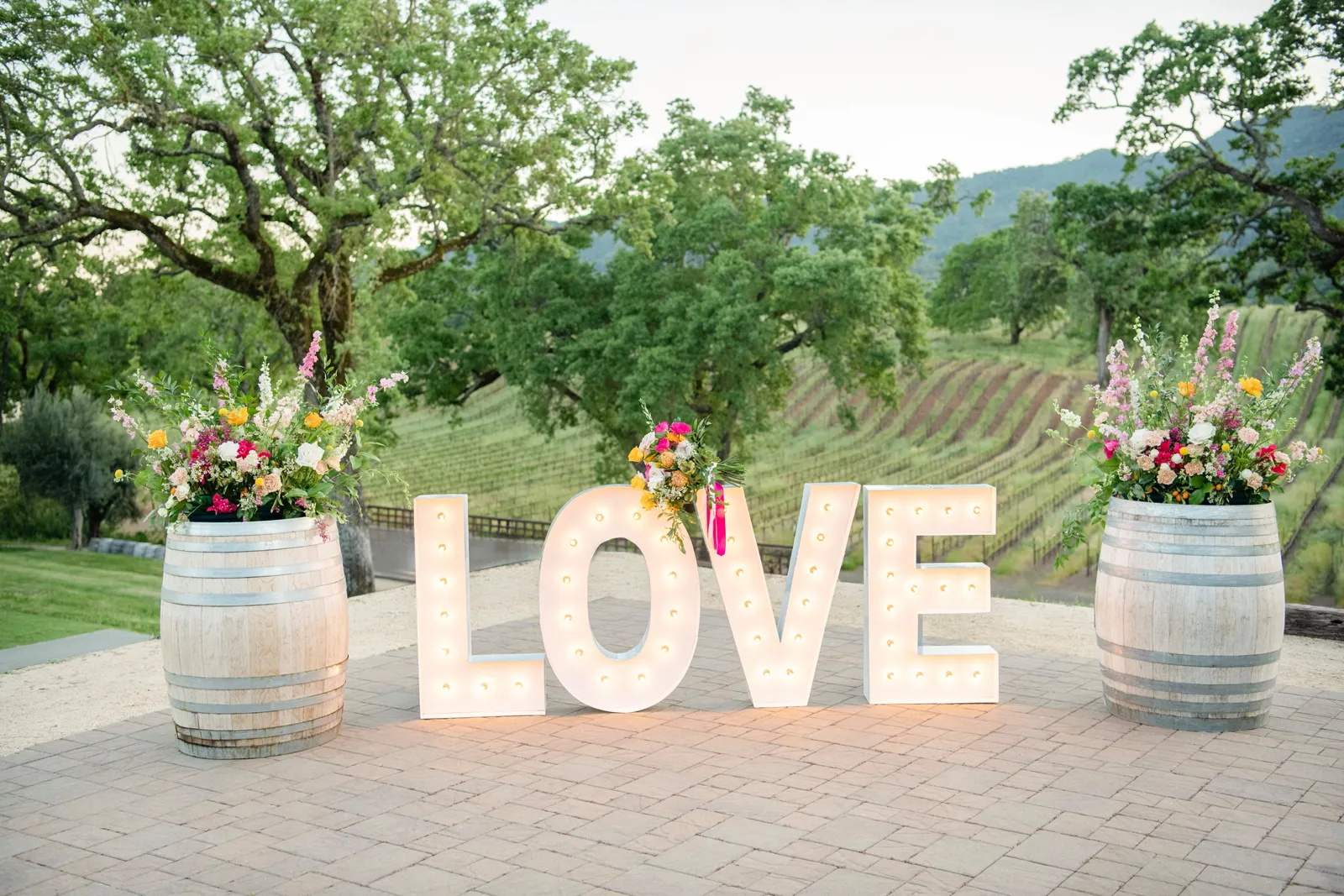 “Some of the personal details included the olive oil favors housed in the mini heart-shaped glass bottles with cork lids that read ‘Olive You’ as an added special touch. The gold foil-pressed His and Her Vow Books stood out in our feature design as well. The gold velvet hexagon ring box and the gold trinket guitar highlights the musical history and aspect of B.R. Cohn Winery. We used an ivory, tufted bench for the Sweetheart Table seating and accented it with the softest blush throw blanket and a blush, velvet lumbar pillow embroidered with pearls that read the words ‘Amour’. To keep the “love” theme going, we used “LOVE” marquee letters from Alpha-Lit North Bay to light up the winery grounds after the sunset as an added touch. To mix up the traditional unity ceremony, we included B.R. Cohn’s Olive Oils, by incorporating two versions of their olive oils, in which the couple would mix the two olive oils into one. Finally, all of the jewelry worn by the bride was handmade with recycled gold and sterling silver from 19 Hands and Jewelry Boutique based in Berkeley, California.” -Aisha, Sheree Amour Weddings & Event Planning