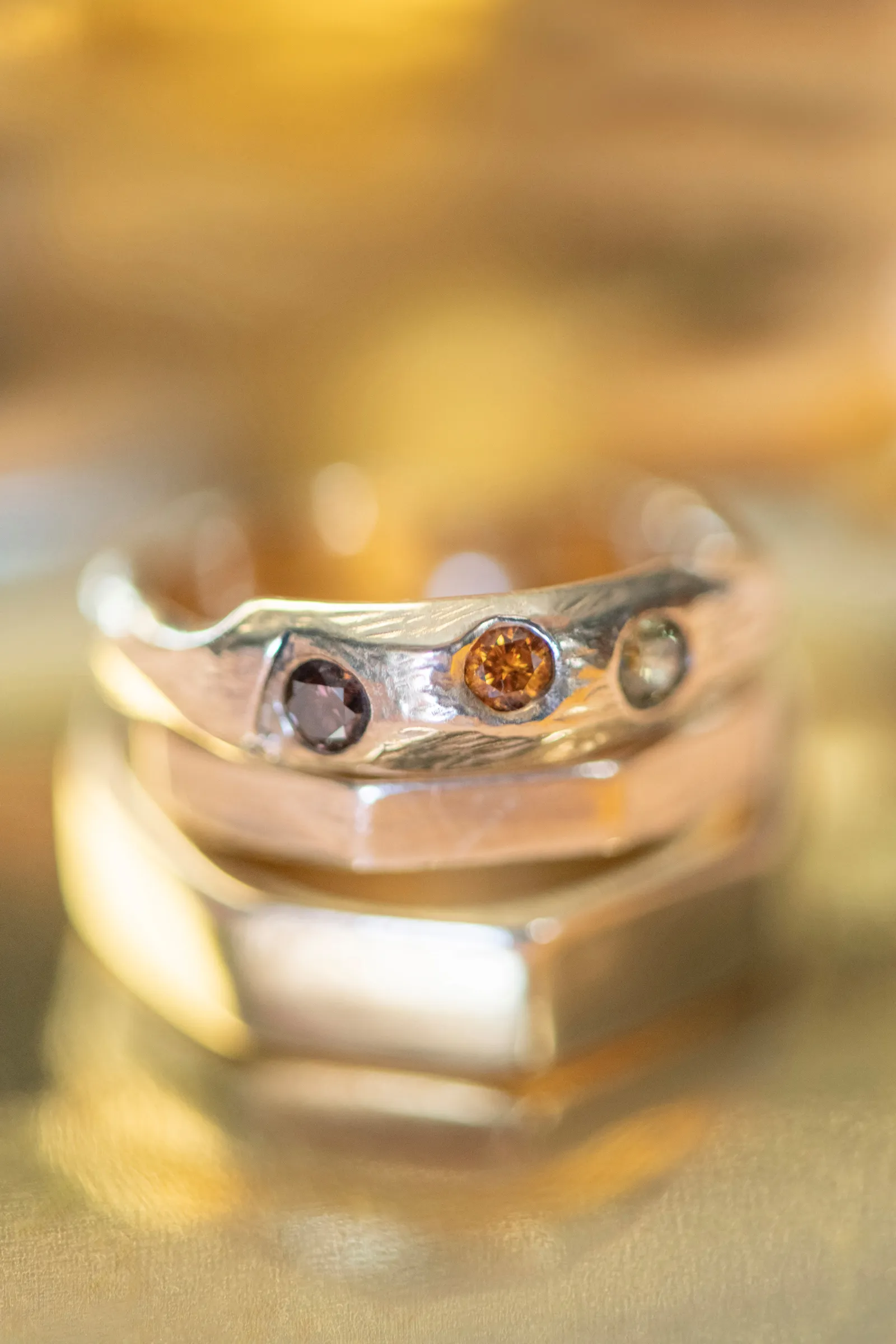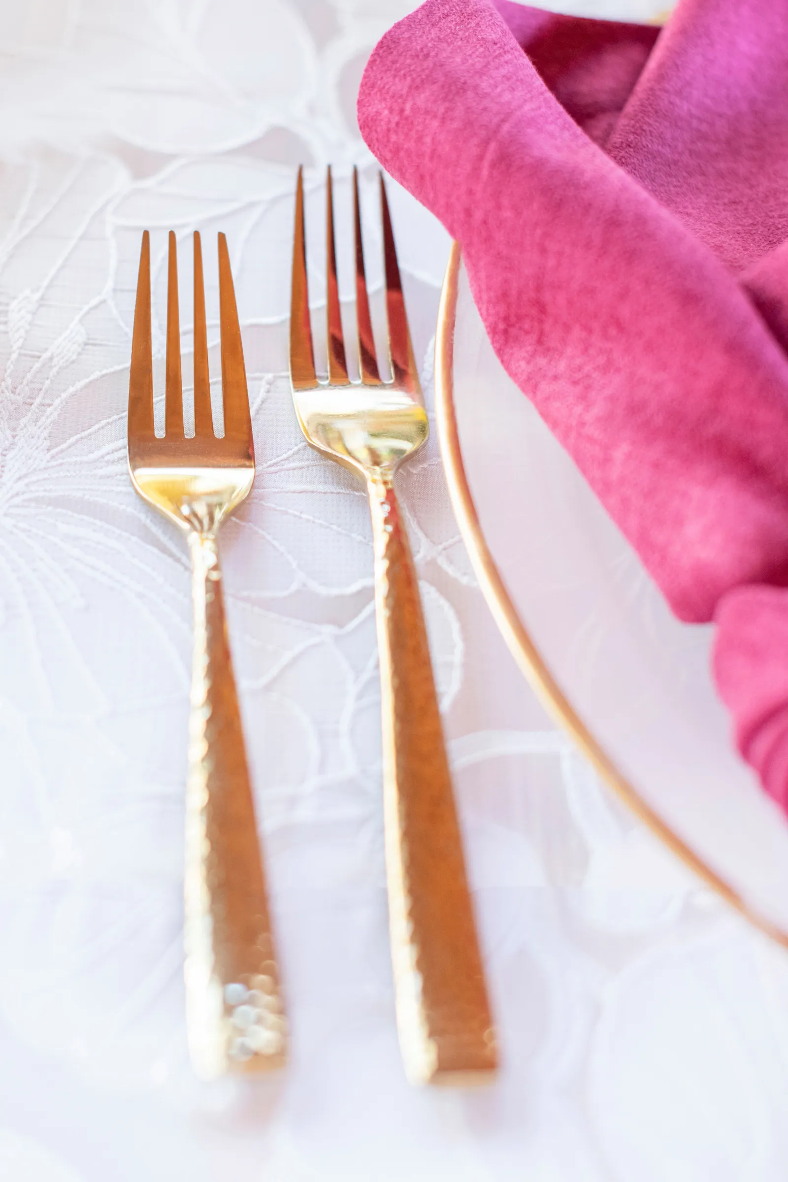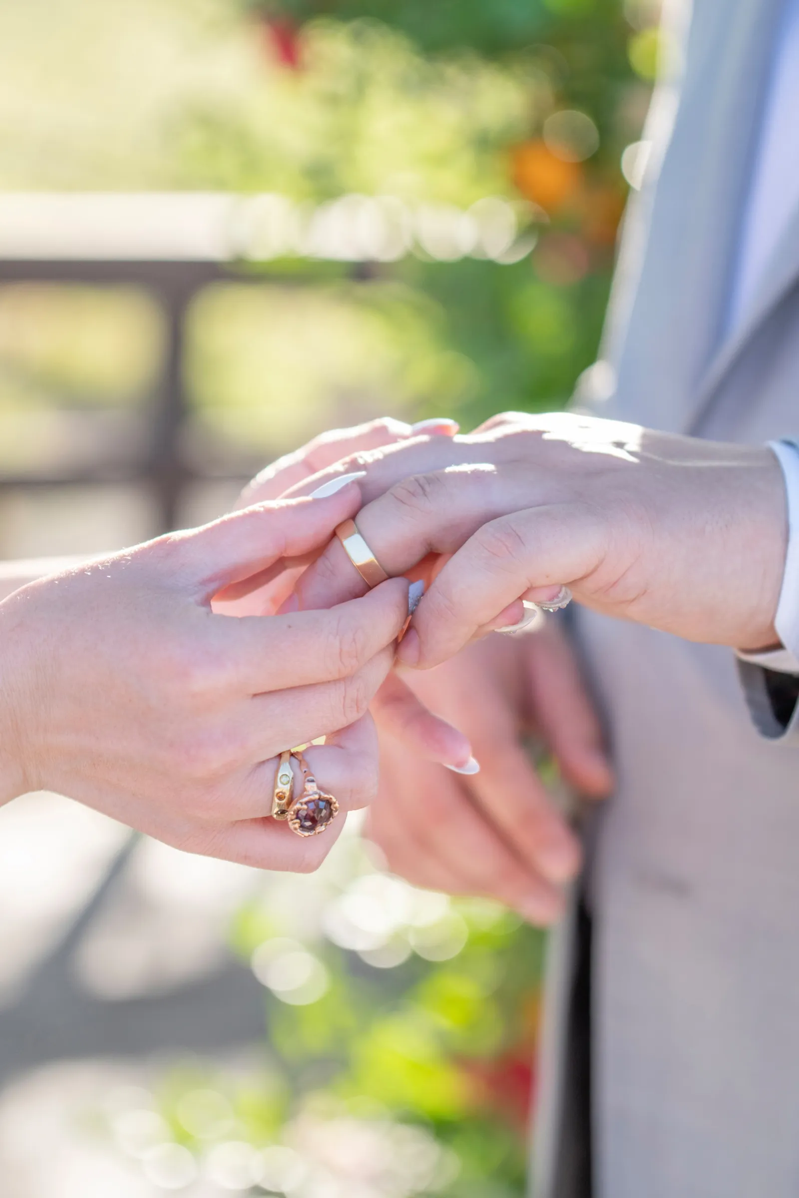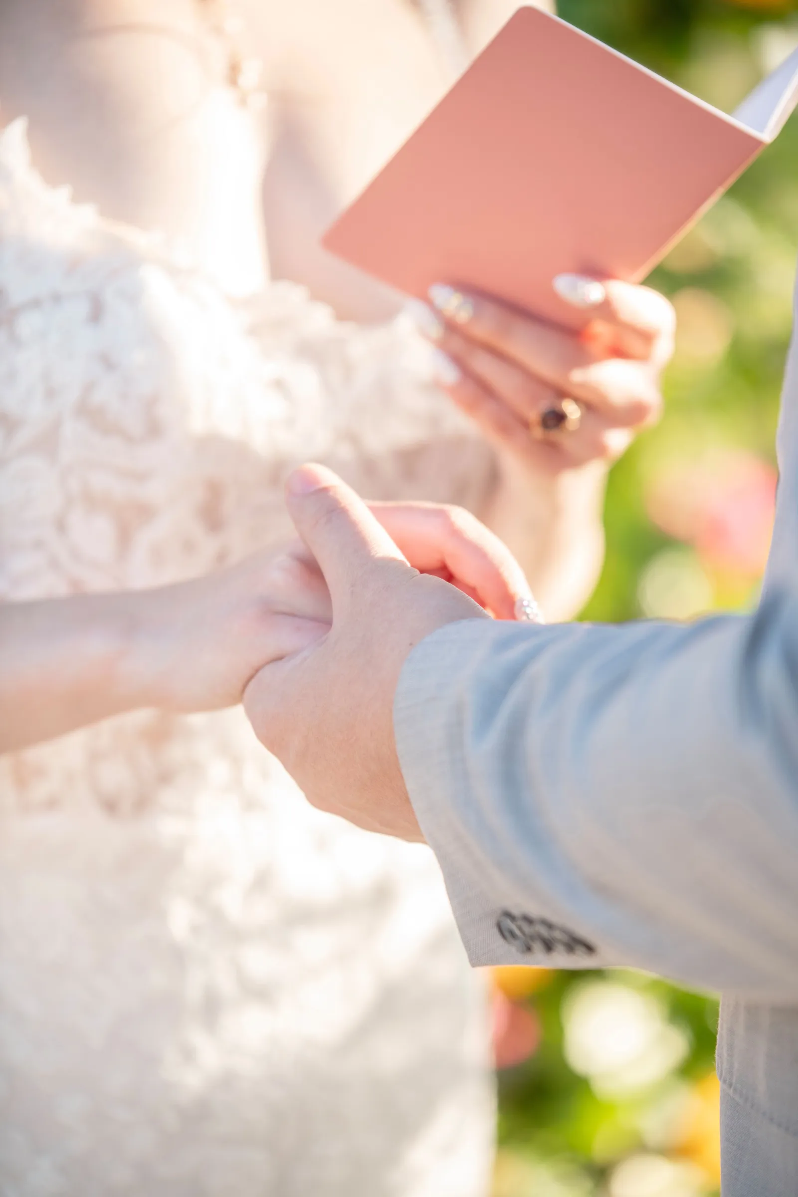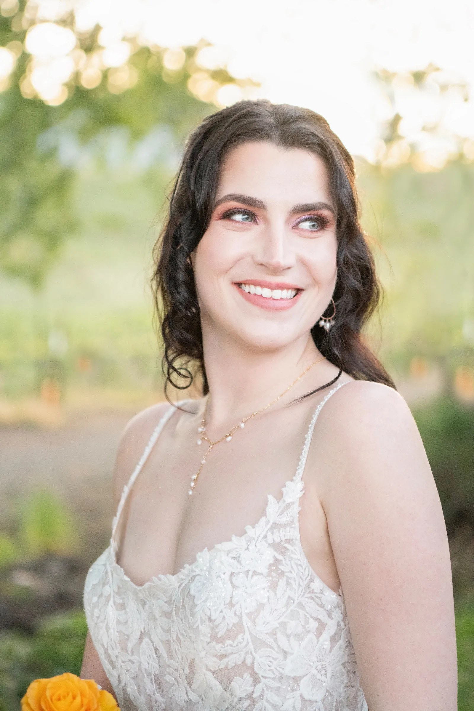 “Some of the personal details included the olive oil favors housed in the mini heart-shaped glass bottles with cork lids that read ‘Olive You’ as an added special touch. The gold foil-pressed His and Her Vow Books stood out in our feature design as well. The gold velvet hexagon ring box and the gold trinket guitar highlights the musical history and aspect of B.R. Cohn Winery. We used an ivory, tufted bench for the Sweetheart Table seating and accented it with the softest blush throw blanket and a blush, velvet lumbar pillow embroidered with pearls that read the words ‘Amour’. To keep the “love” theme going, we used “LOVE” marquee letters from Alpha-Lit North Bay to light up the winery grounds after the sunset as an added touch. To mix up the traditional unity ceremony, we included B.R. Cohn’s Olive Oils, by incorporating two versions of their olive oils, in which the couple would mix the two olive oils into one. Finally, all of the jewelry worn by the bride was handmade with recycled gold and sterling silver from 19 Hands and Jewelry Boutique based in Berkeley, California.” -Aisha, Sheree Amour Weddings & Event Planning