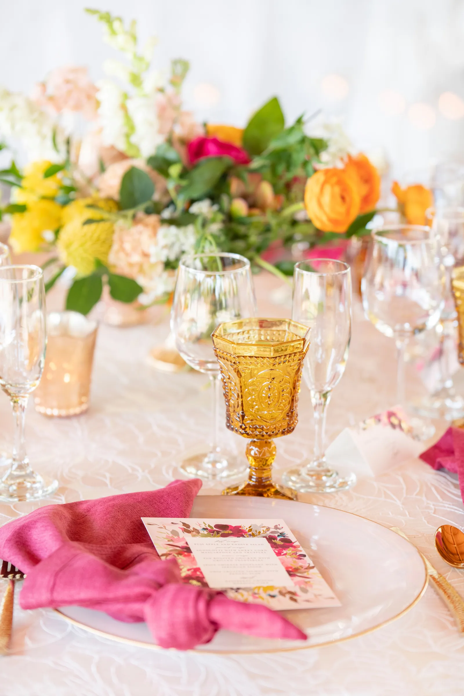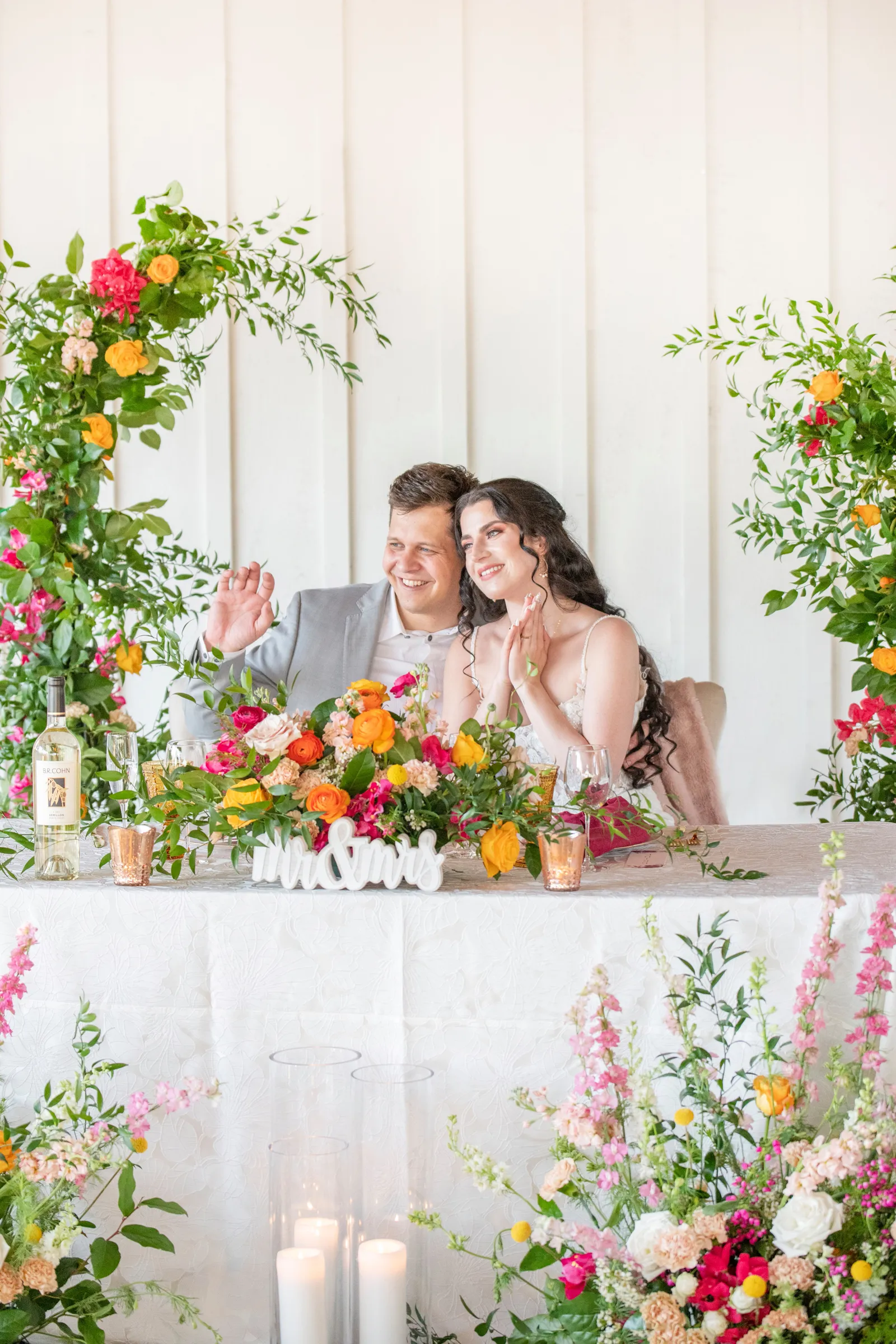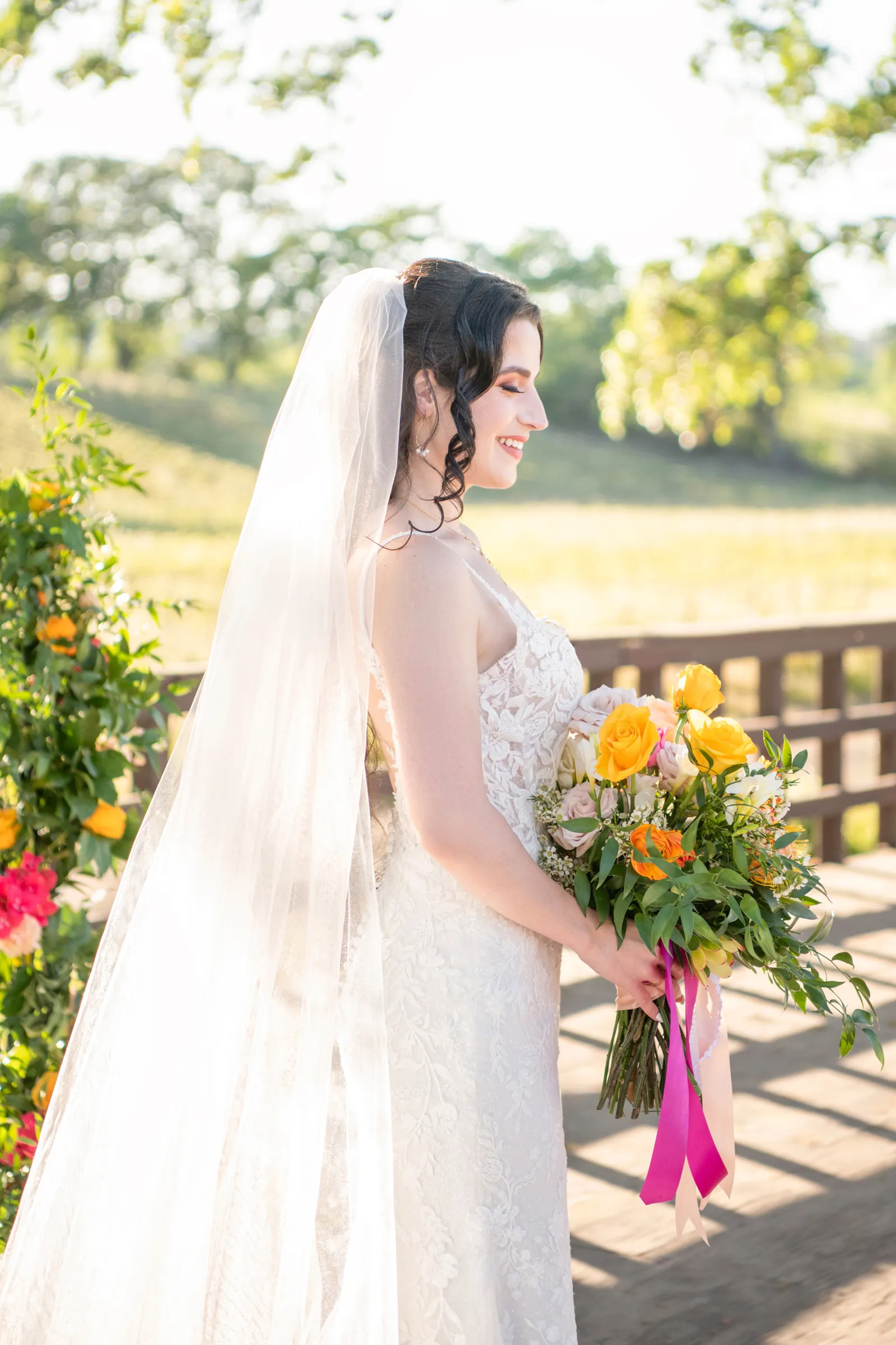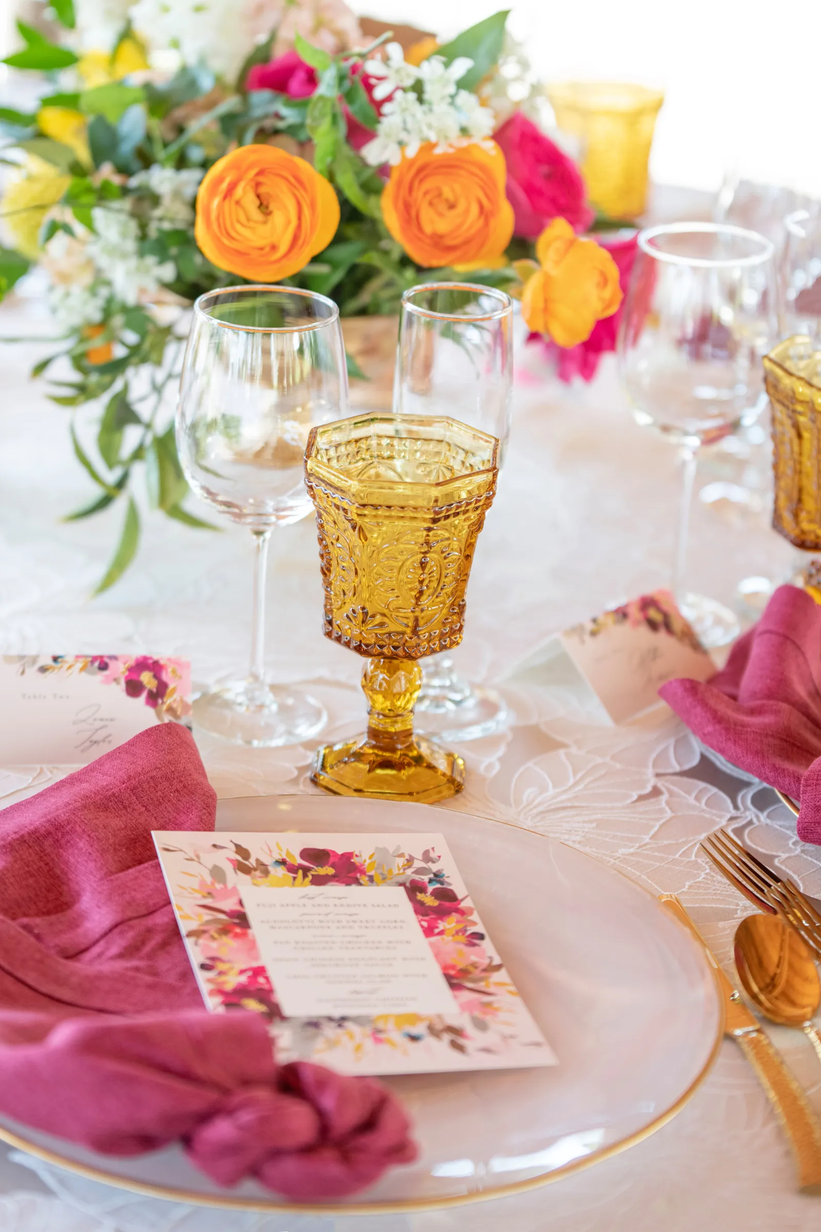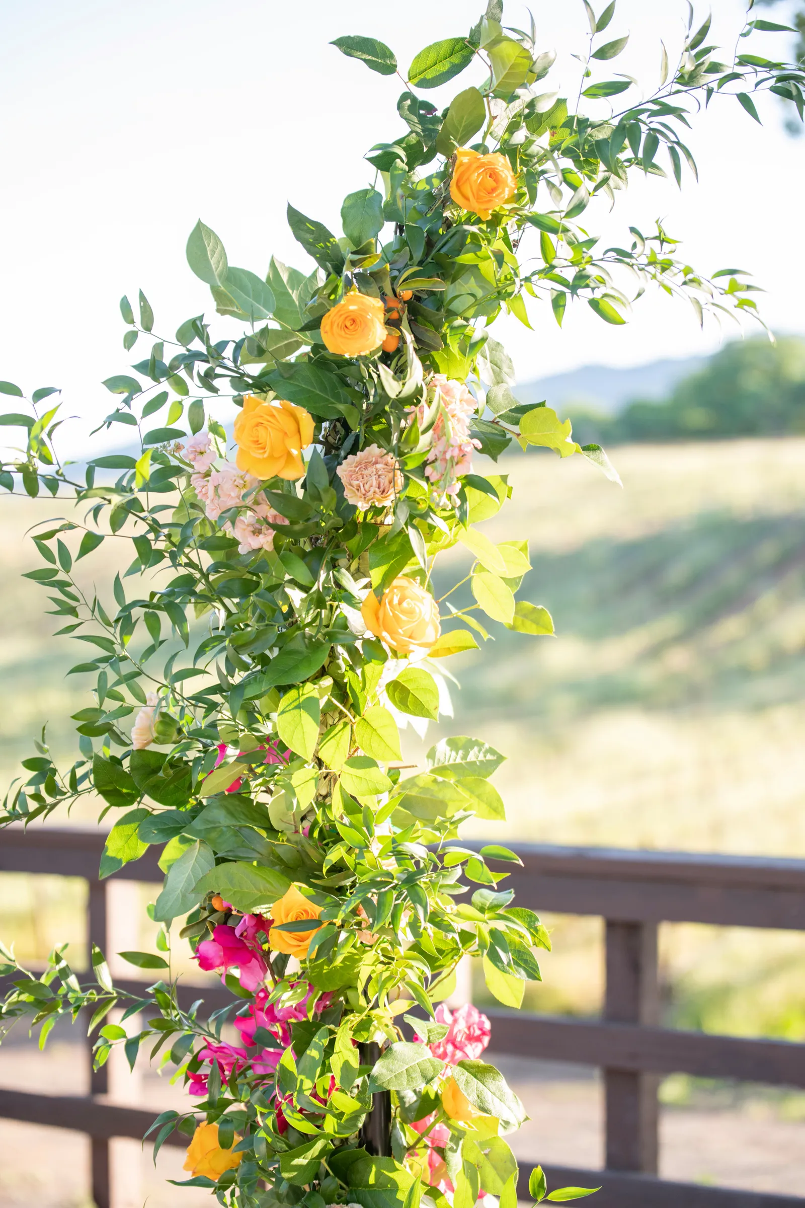 “The selection of bold bright colors included pink, yellow, orange, fuchsia, and green in the floral design, tablescape design, ceremony, cake, and all of the other little details were inspired by the colors of summer, colorful music concerts, the golden sunshine and the natural landscape and backdrop of the vineyards at B.R. Cohn Winery.” -Aisha, Sheree Amour Weddings & Event Planning
