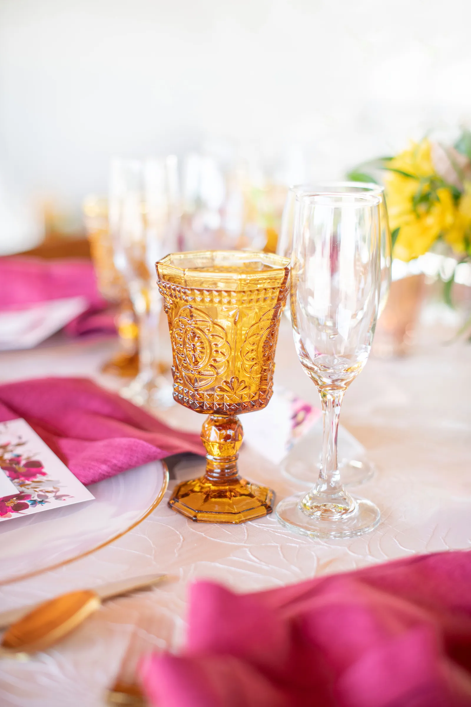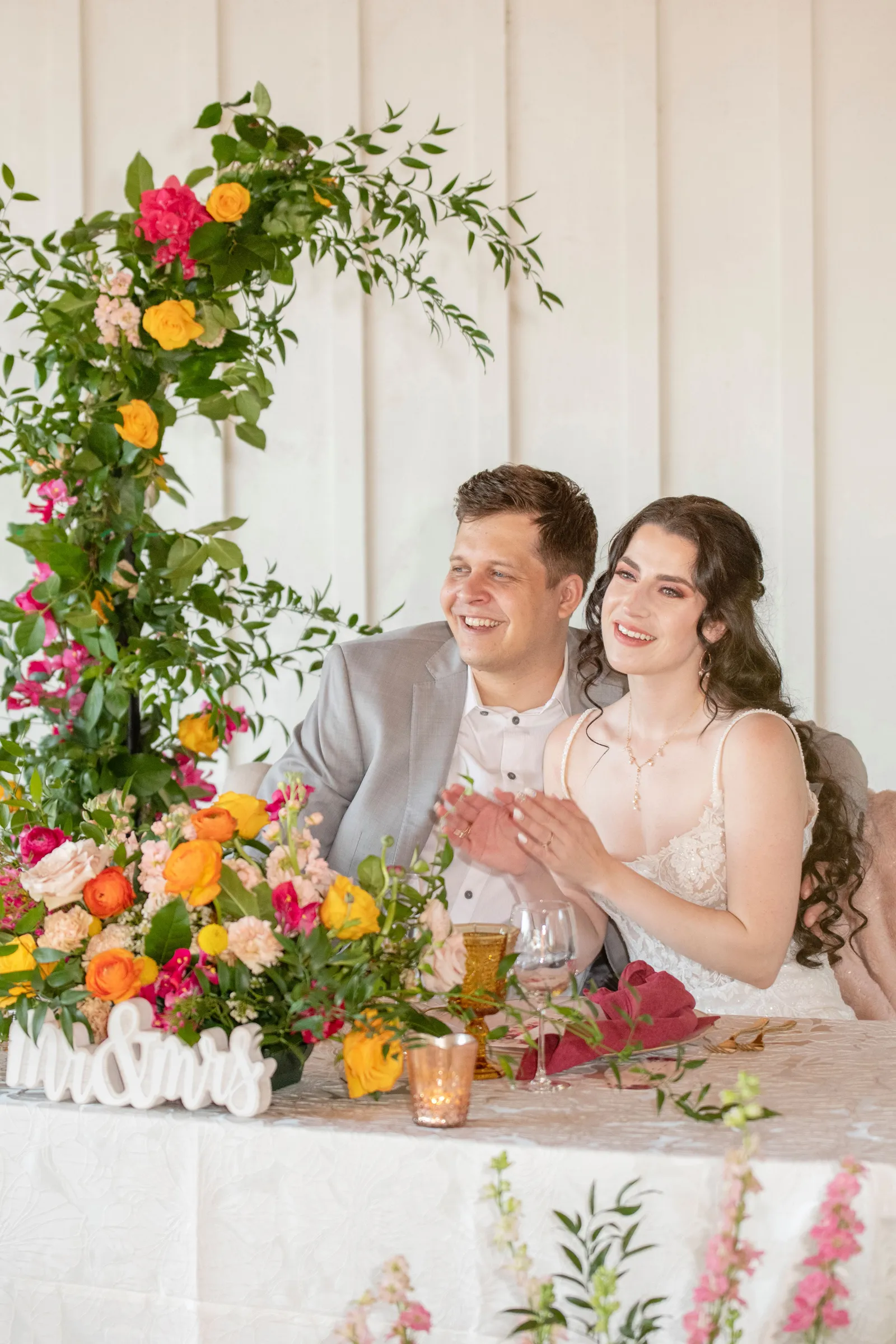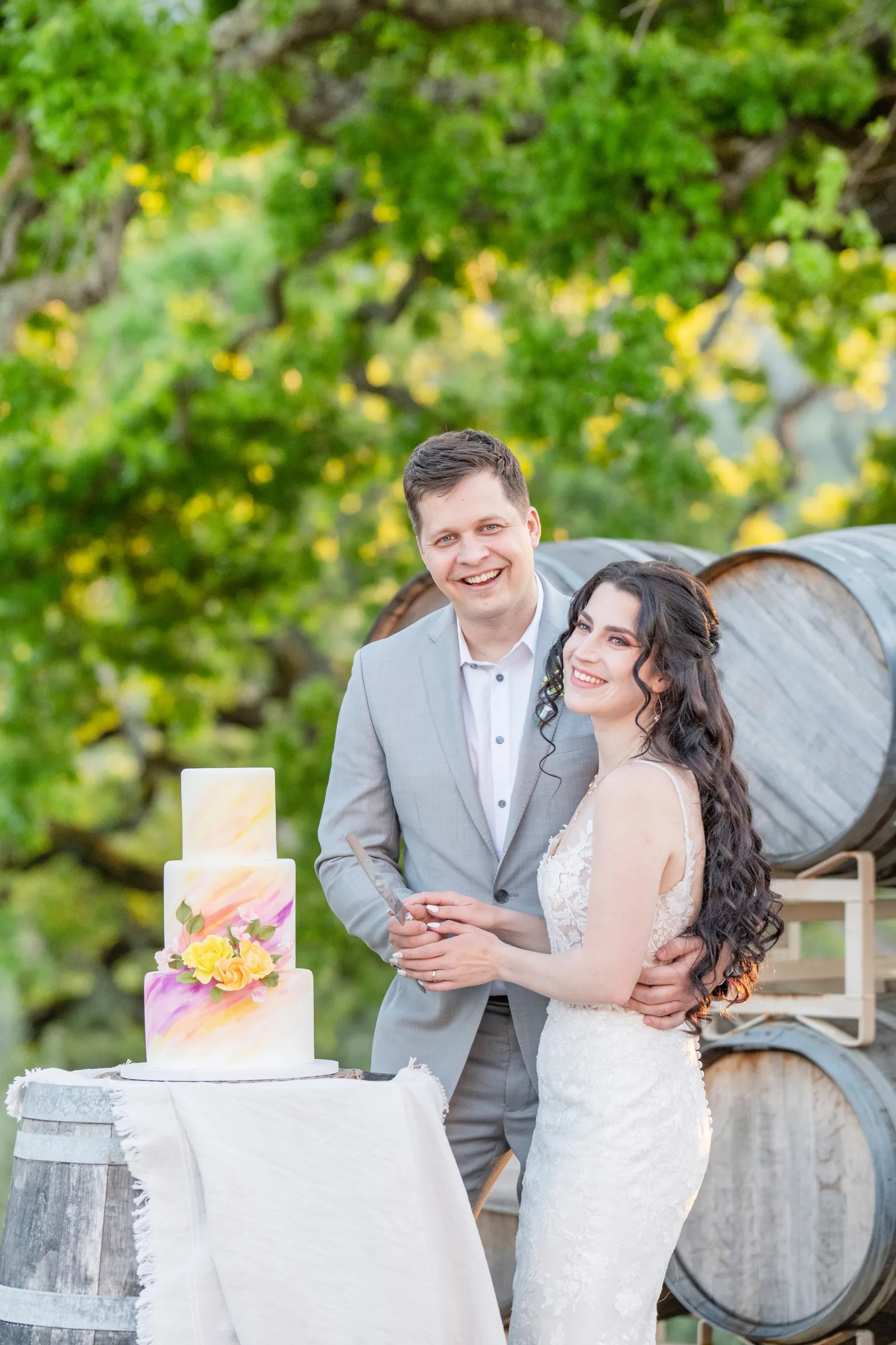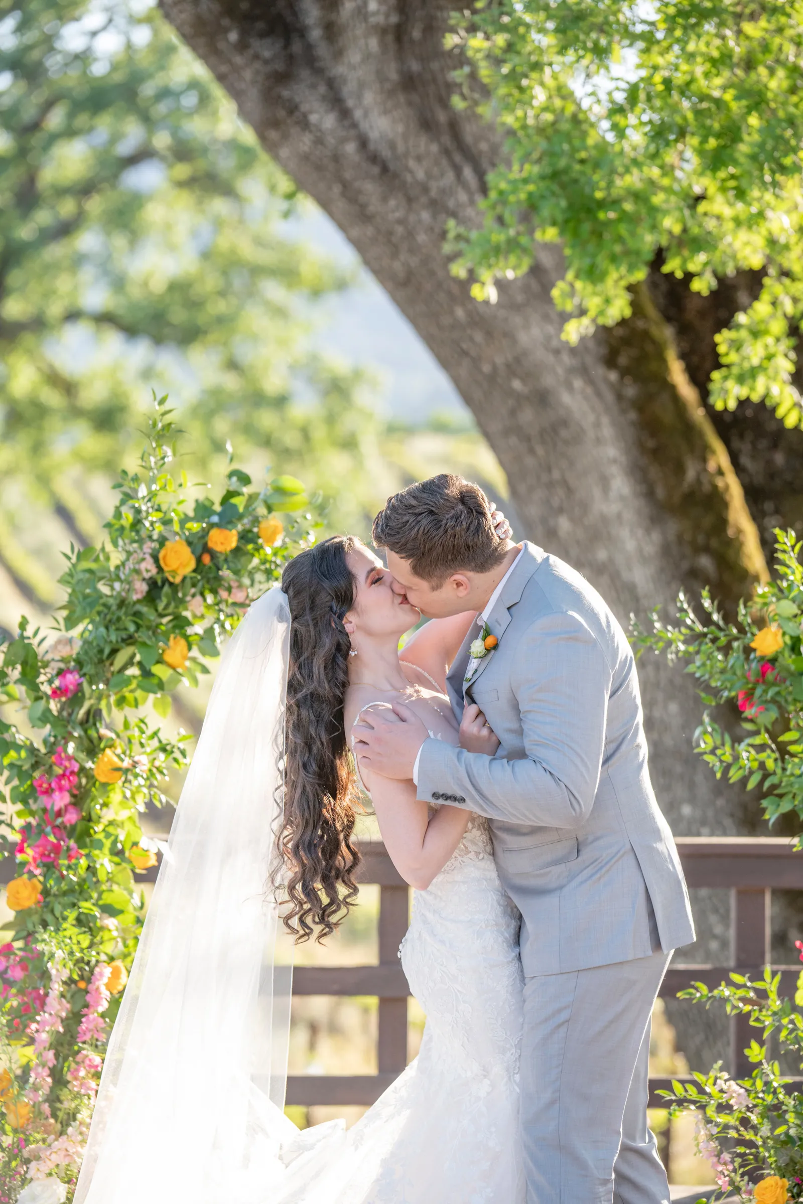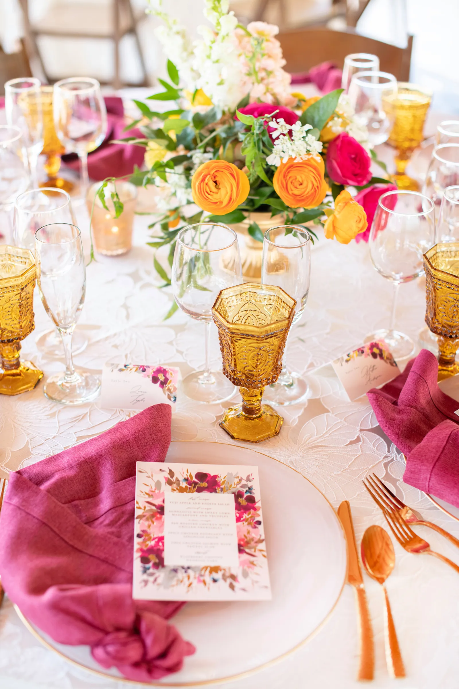 “The selection of bold bright colors included pink, yellow, orange, fuchsia, and green in the floral design, tablescape design, ceremony, cake, and all of the other little details were inspired by the colors of summer, colorful music concerts, the golden sunshine and the natural landscape and backdrop of the vineyards at B.R. Cohn Winery.” -Aisha, Sheree Amour Weddings & Event Planning
