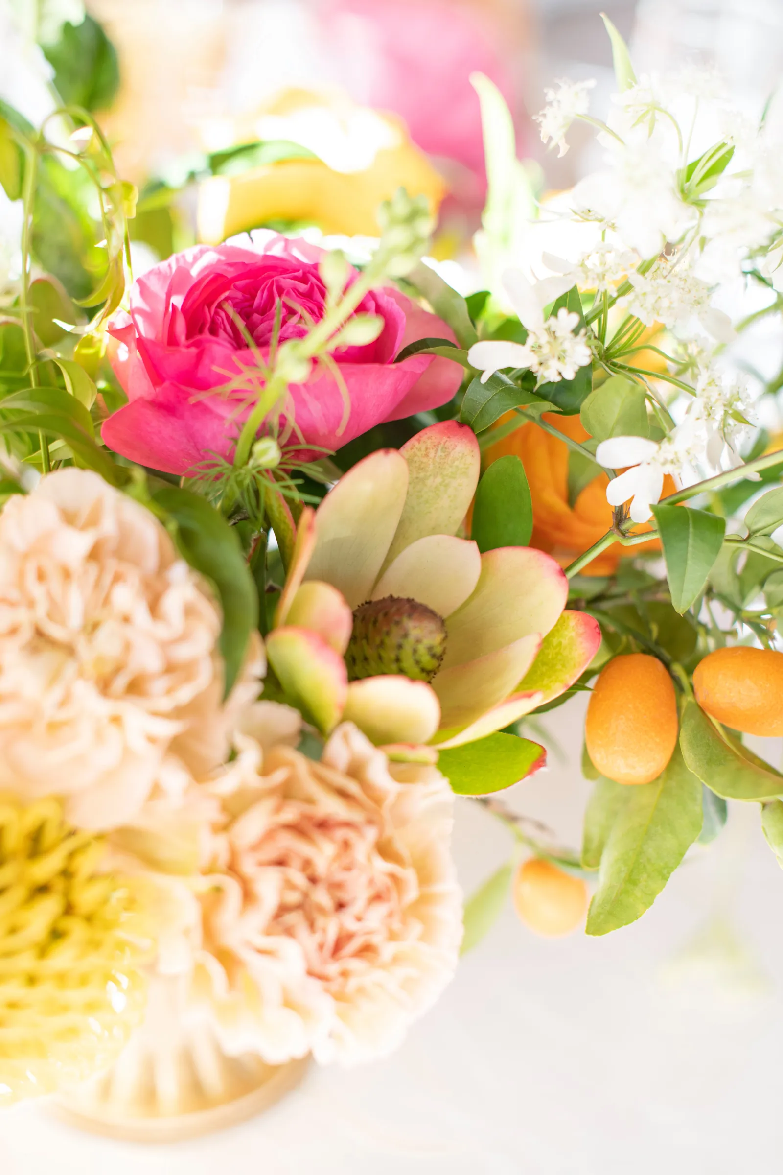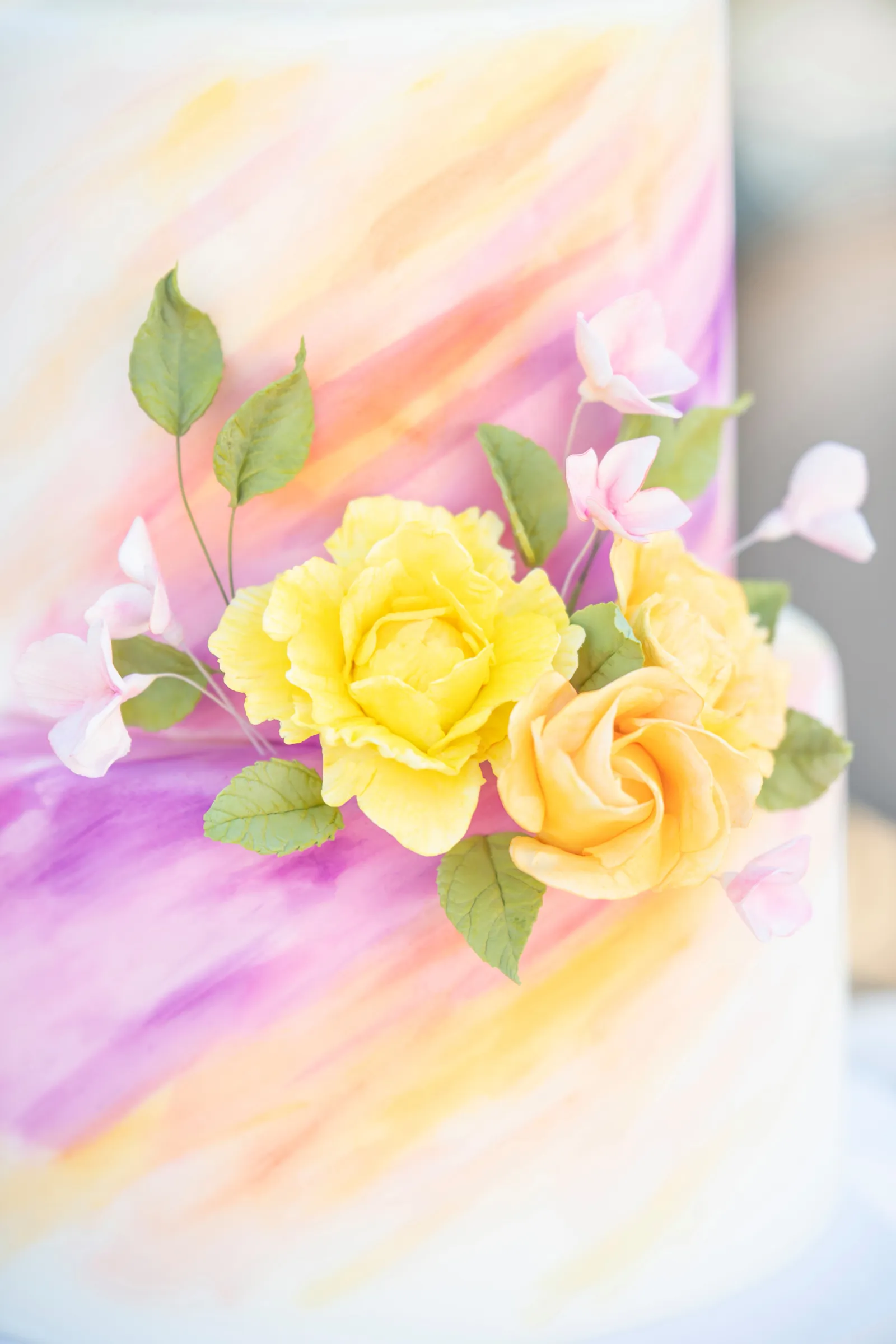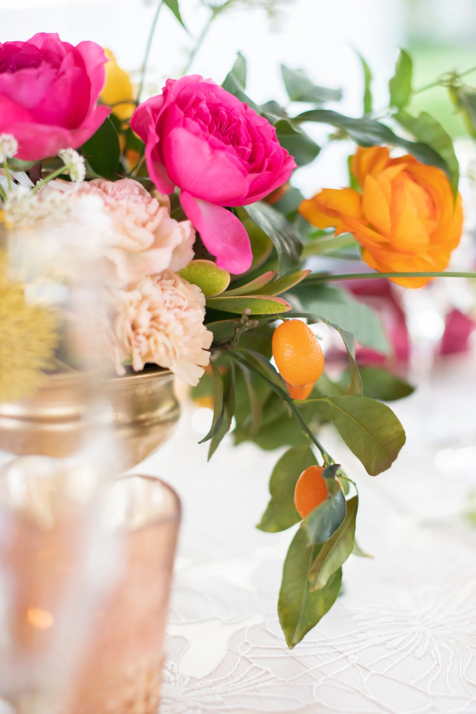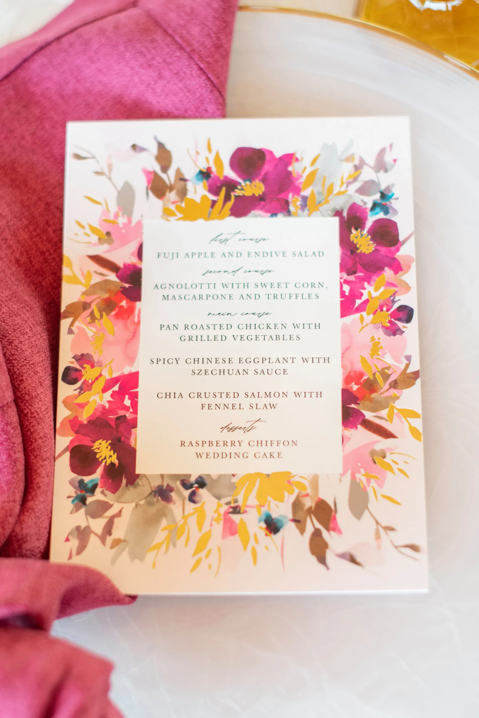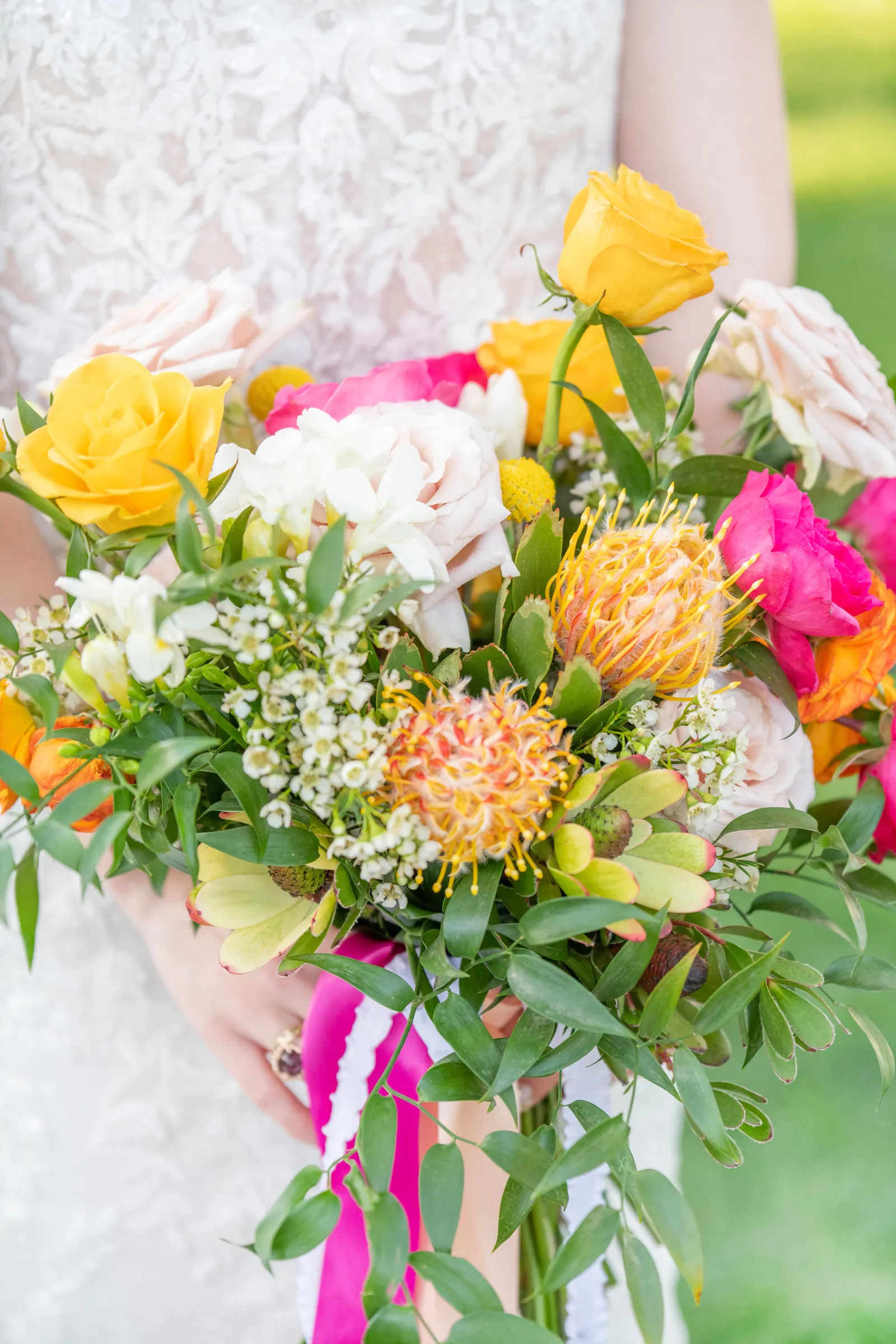 “The selection of bold bright colors included pink, yellow, orange, fuchsia, and green in the floral design, tablescape design, ceremony, cake, and all of the other little details were inspired by the colors of summer, colorful music concerts, the golden sunshine and the natural landscape and backdrop of the vineyards at B.R. Cohn Winery.” -Aisha, Sheree Amour Weddings & Event Planning