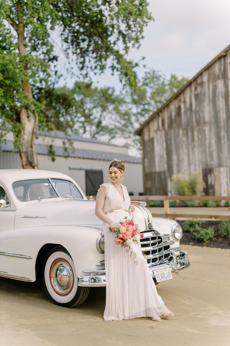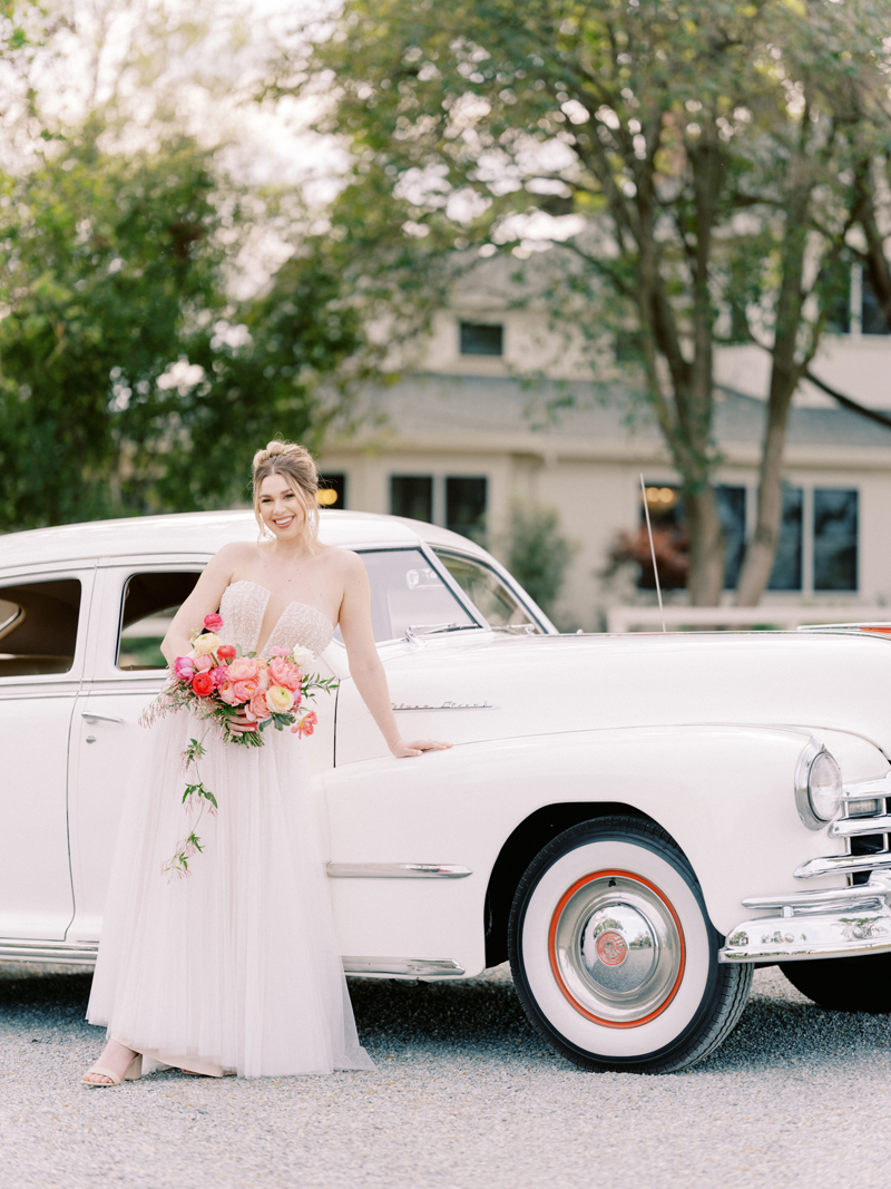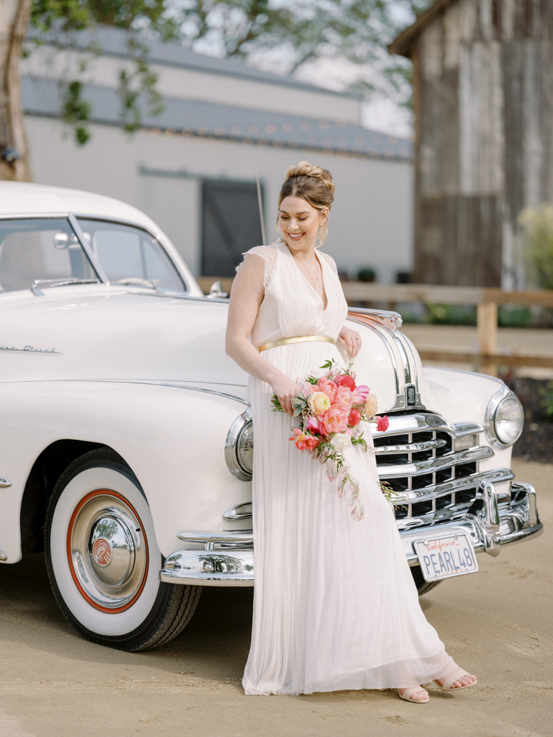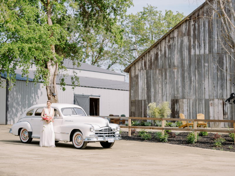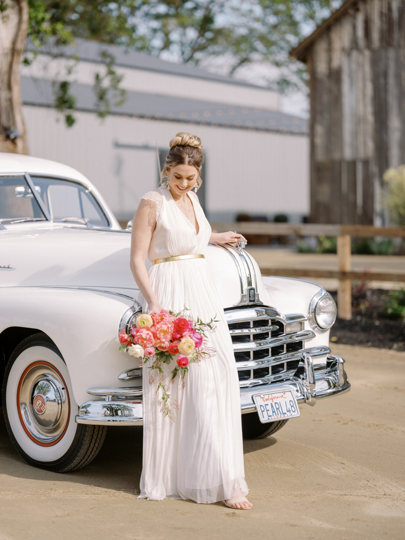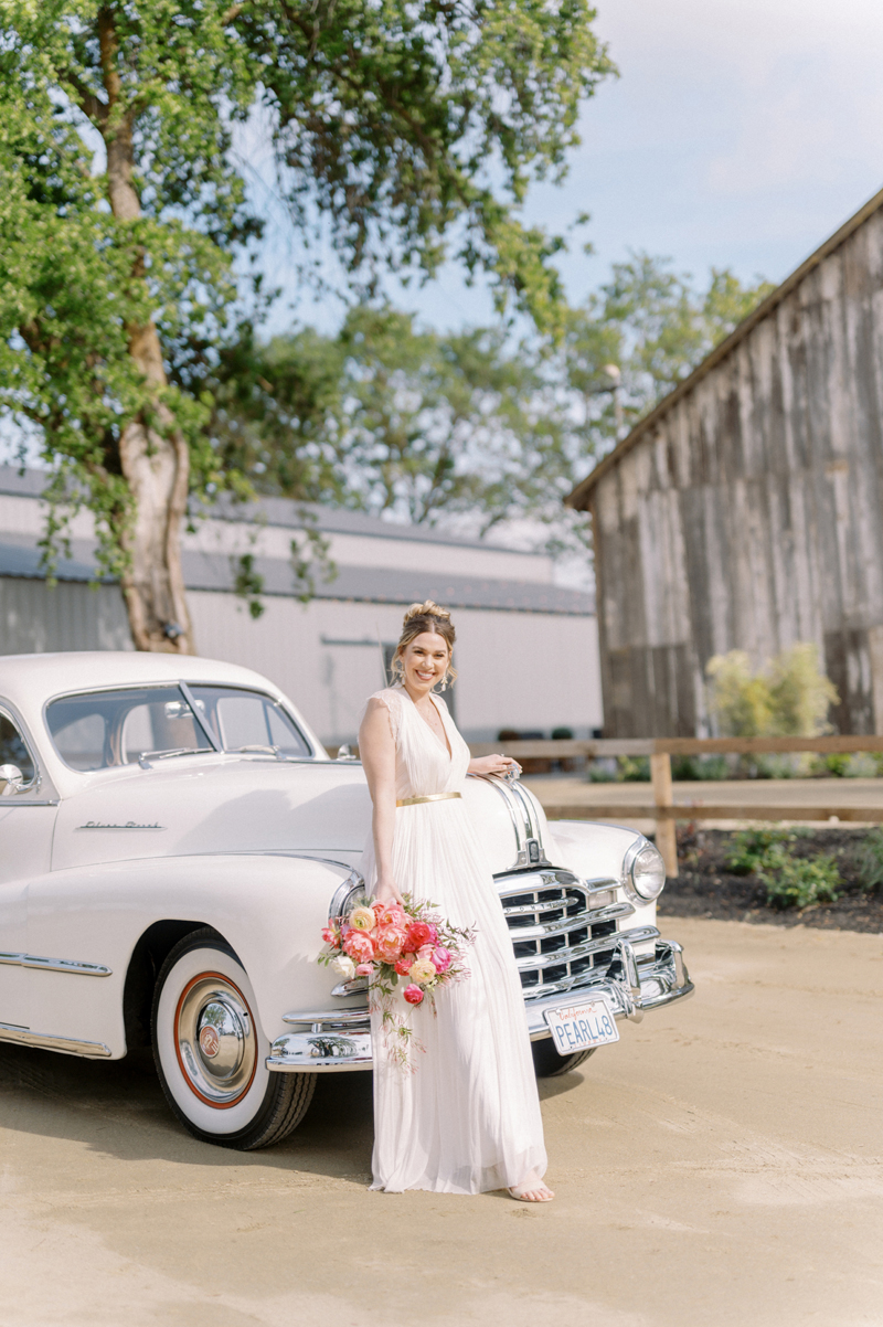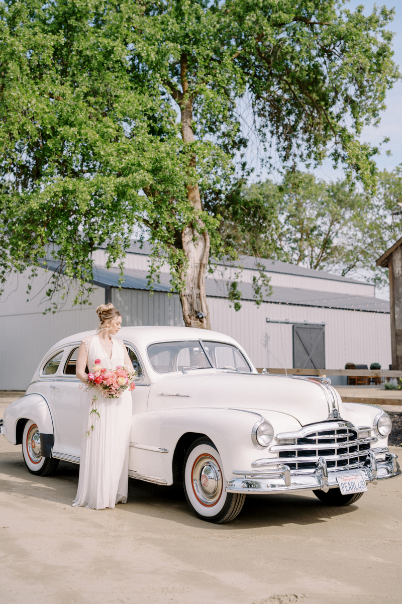 For as long as we can remember, we’ve always wanted to get “Pearl” on one of our shoots, and the stars finally aligned and the beautiful Miss Pearl made her Real Weddings Magazine debut in our “Charmed by Love” styled shoot in the current Summer/Fall 2022 issue! This vintage 1948 Pontiac Silver Streak was lovingly (and painstakingly) restored and is now available for weddings and special events through Sentimental Journey Vintage Transportation! Don’t you think Pearl makes a great co-star with our real bride model Lexi in this shoot? Yeah, we think so too, so without further ado, we’re proud to feature this very special “Pearl Sighting!“