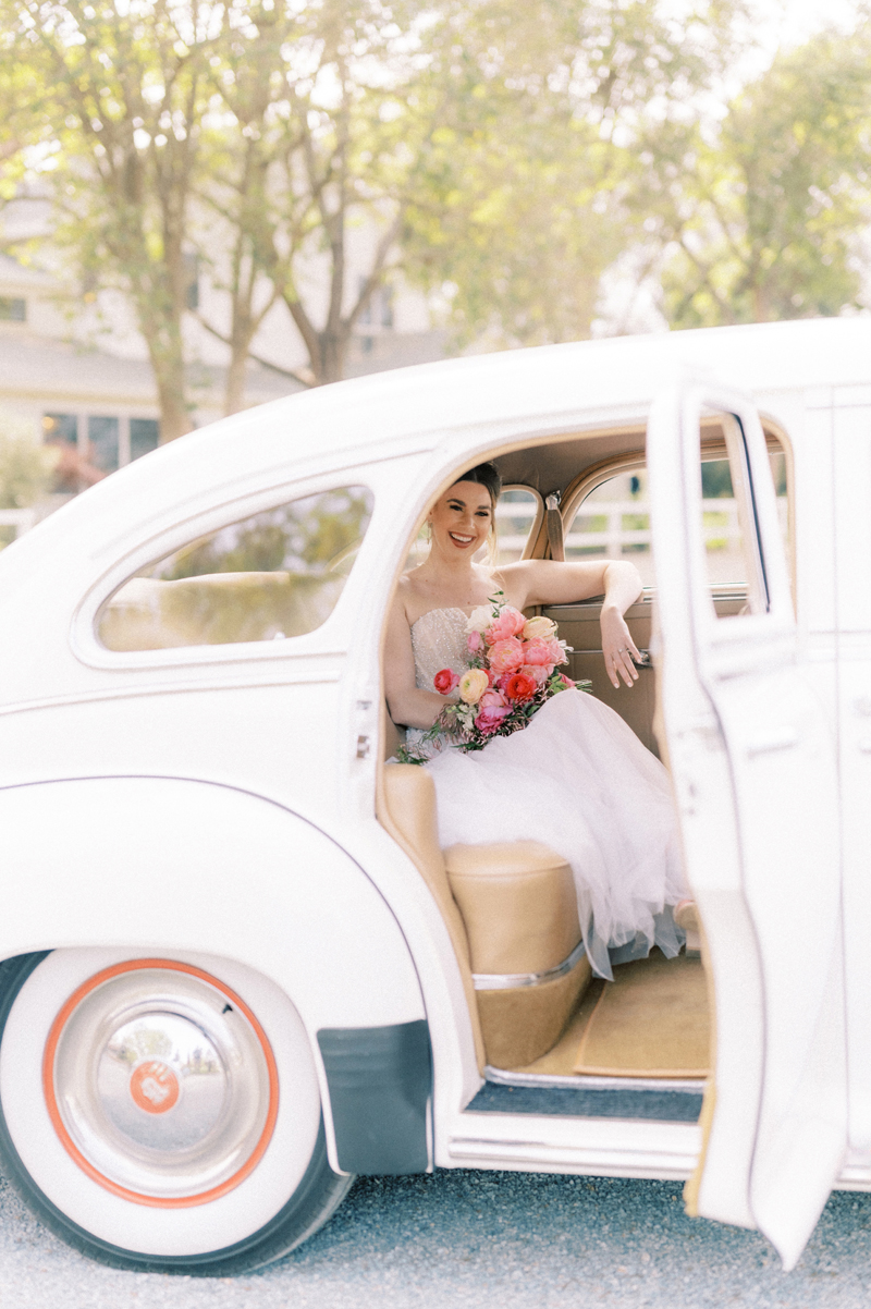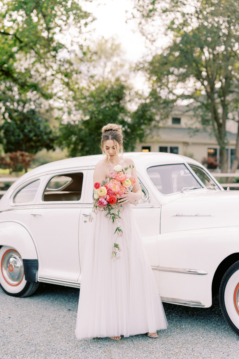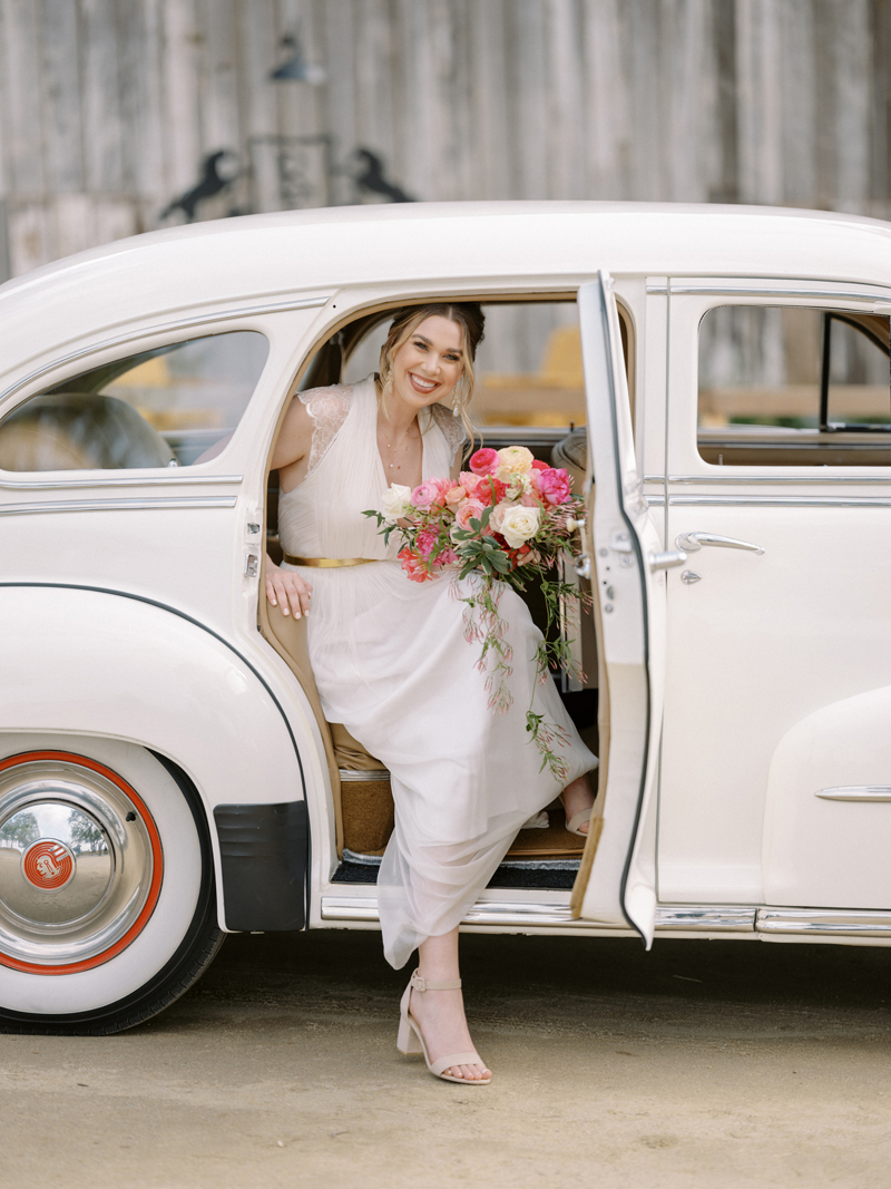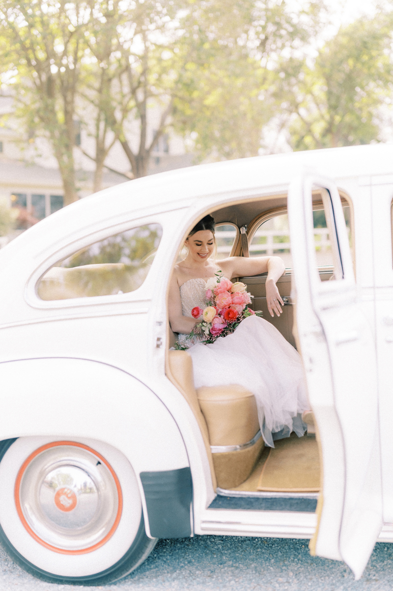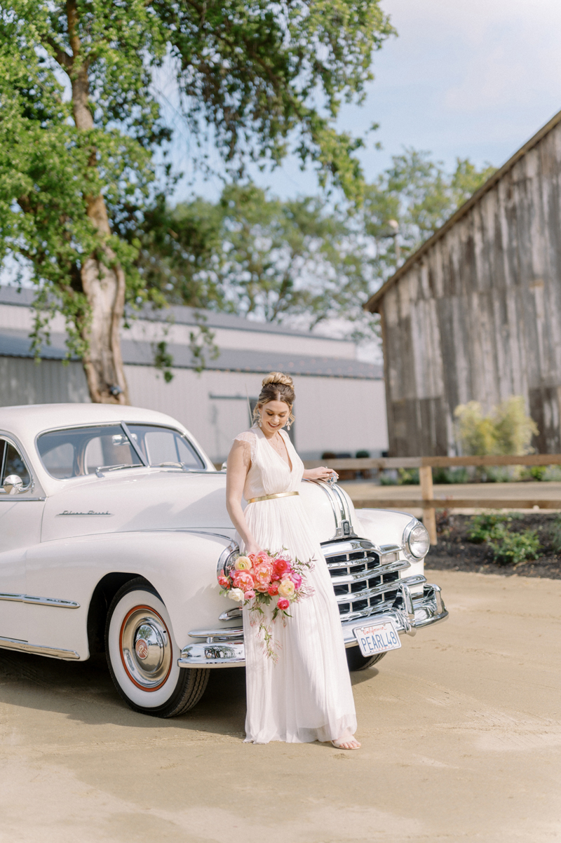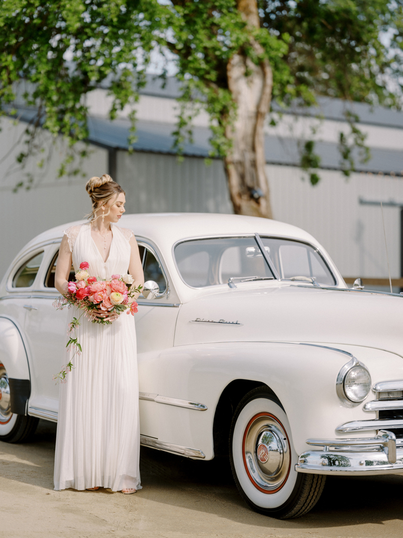 For as long as we can remember, we’ve always wanted to get “Pearl” on one of our shoots, and the stars finally aligned and the beautiful Miss Pearl made her Real Weddings Magazine debut in our “Charmed by Love” styled shoot in the current Summer/Fall 2022 issue! This vintage 1948 Pontiac Silver Streak was lovingly (and painstakingly) restored and is now available for weddings and special events through Sentimental Journey Vintage Transportation! Don’t you think Pearl makes a great co-star with our real bride model Lexi in this shoot? Yeah, we think so too, so without further ado, we’re proud to feature this very special “Pearl Sighting!“