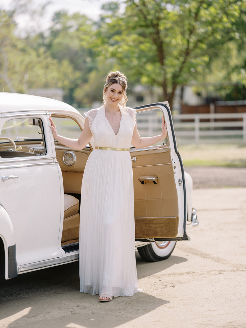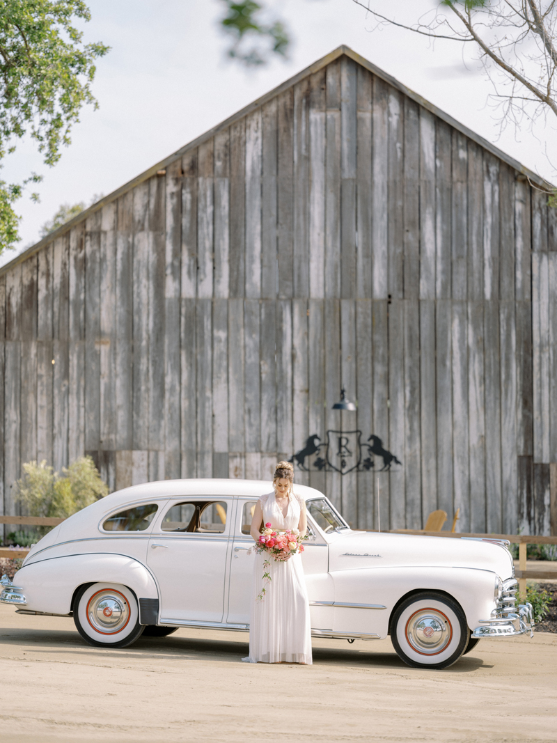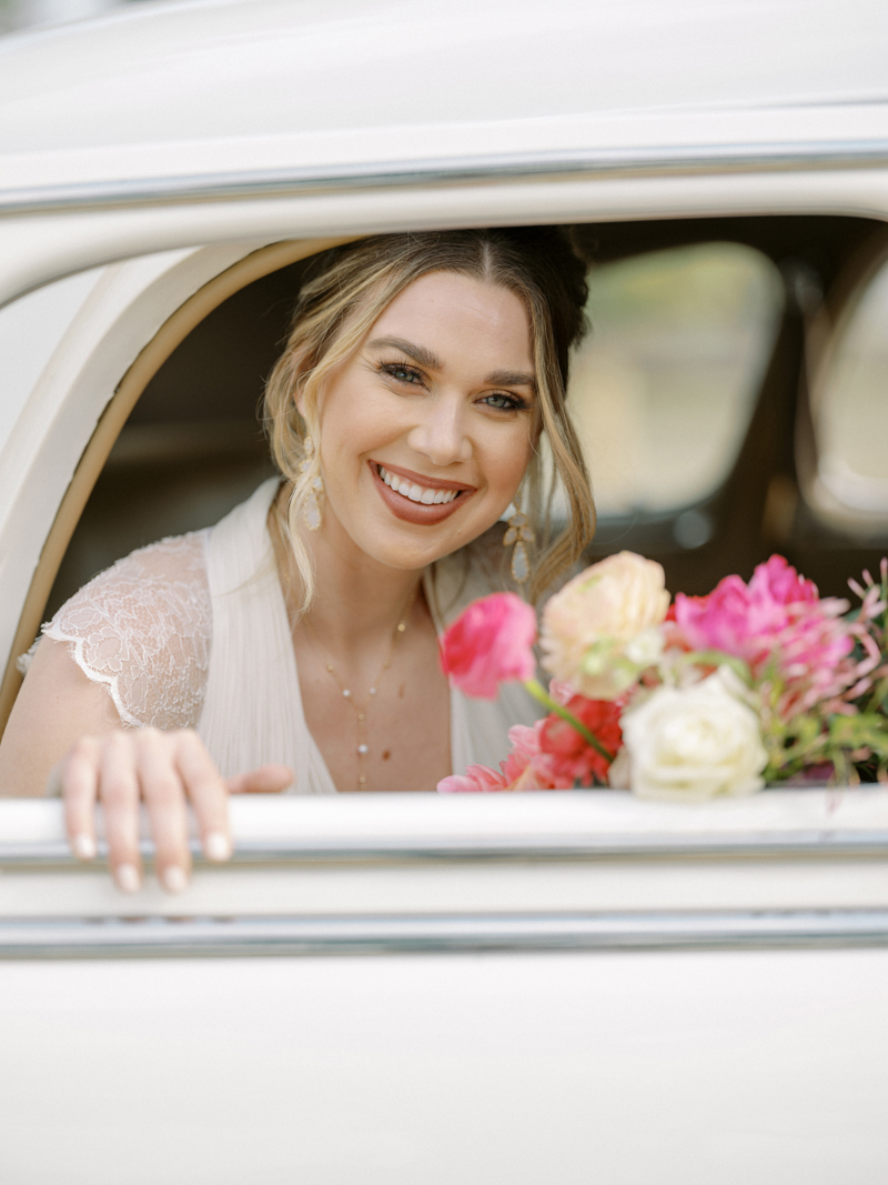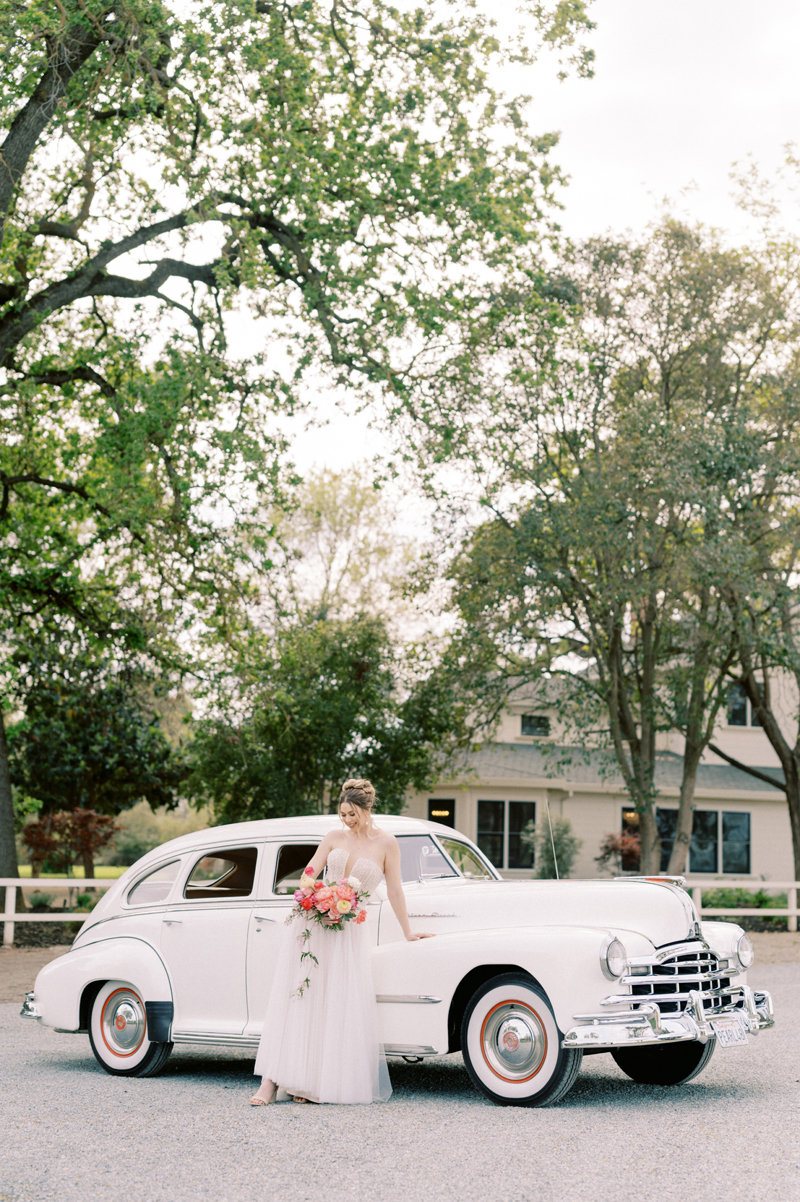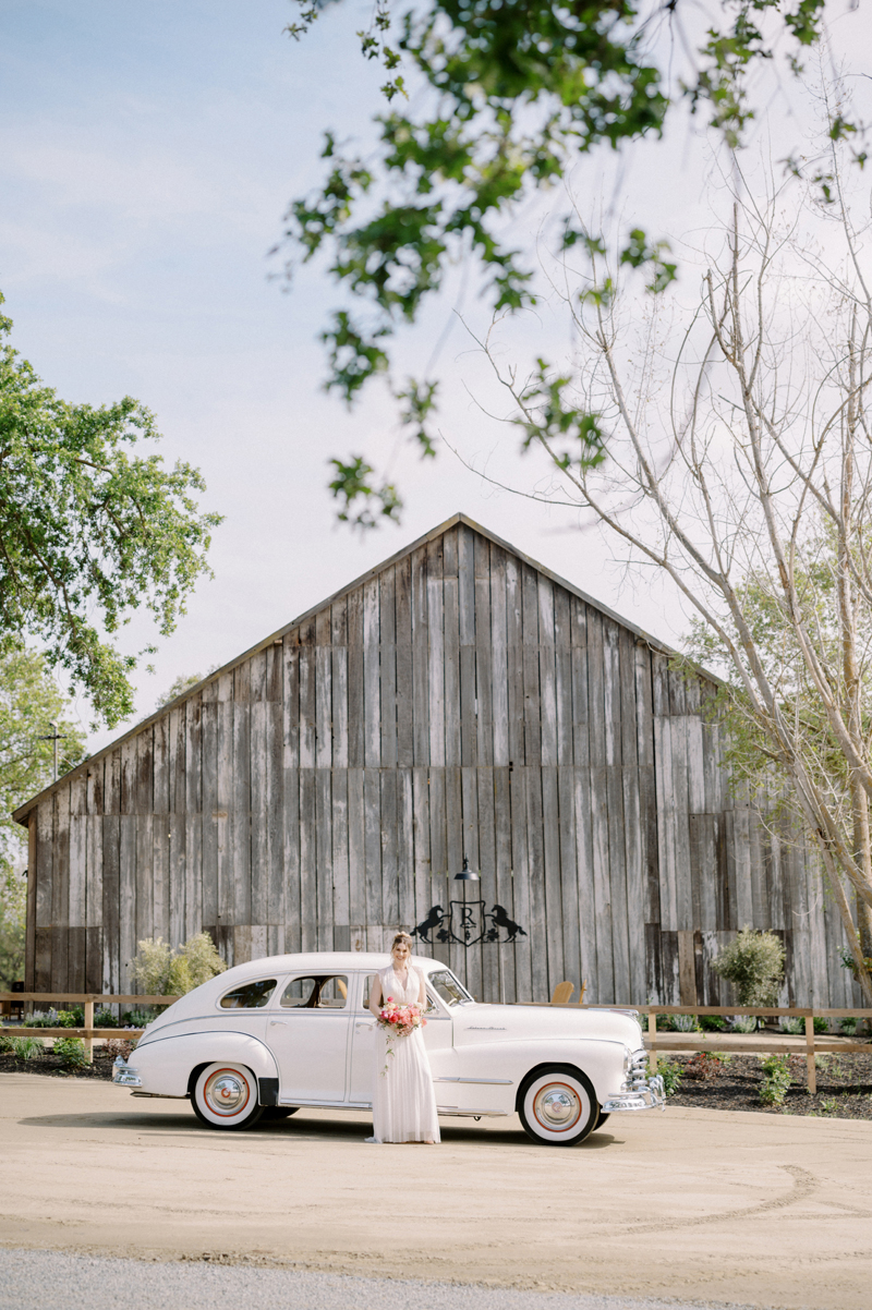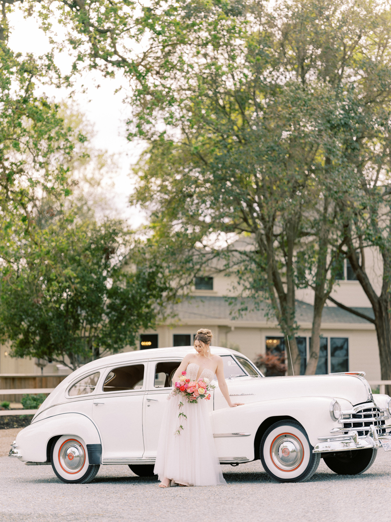 For as long as we can remember, we’ve always wanted to get “Pearl” on one of our shoots, and the stars finally aligned and the beautiful Miss Pearl made her Real Weddings Magazine debut in our “Charmed by Love” styled shoot in the current Summer/Fall 2022 issue! This vintage 1948 Pontiac Silver Streak was lovingly (and painstakingly) restored and is now available for weddings and special events through Sentimental Journey Vintage Transportation! Don’t you think Pearl makes a great co-star with our real bride model Lexi in this shoot? Yeah, we think so too, so without further ado, we’re proud to feature this very special “Pearl Sighting!“