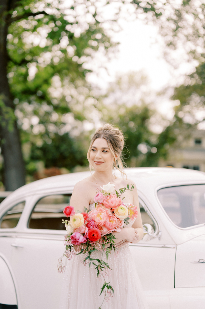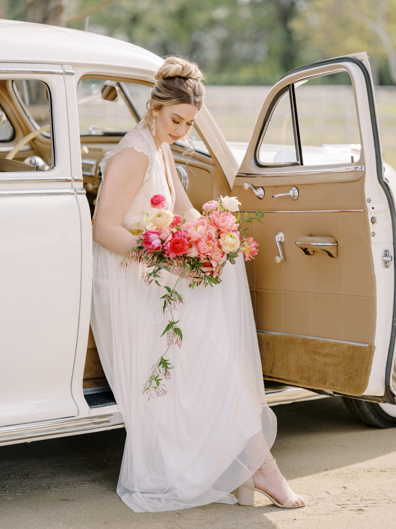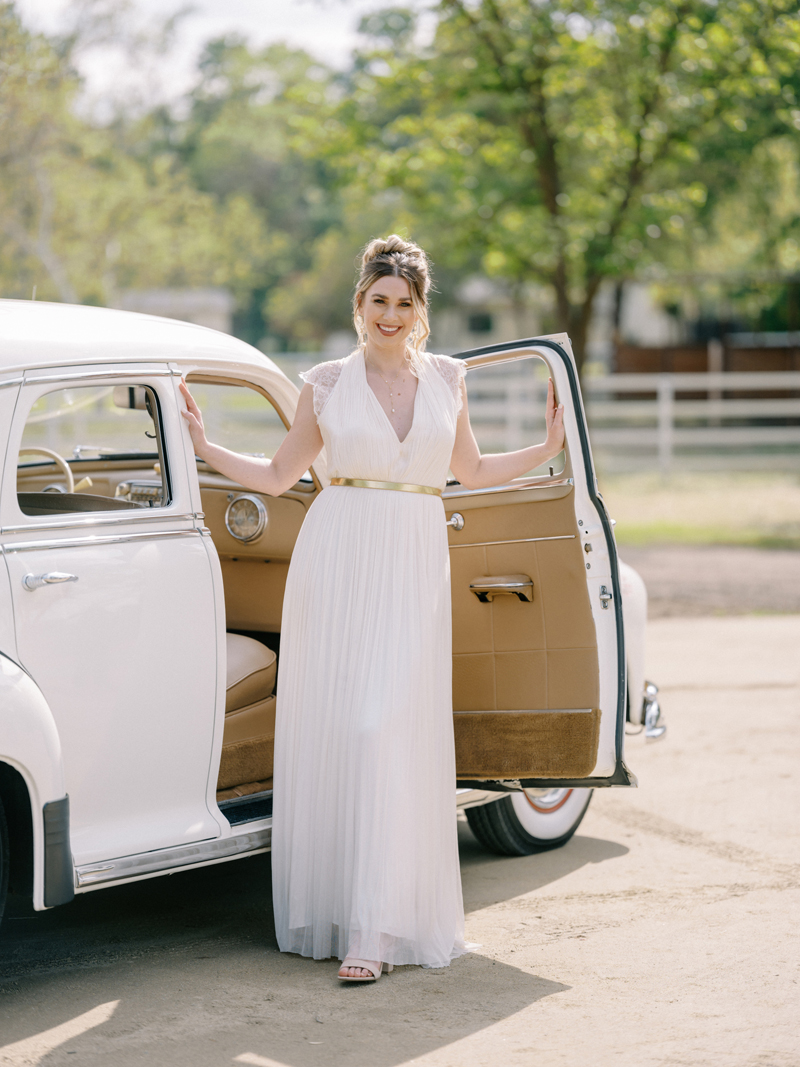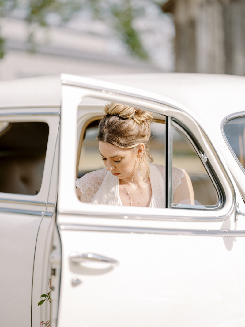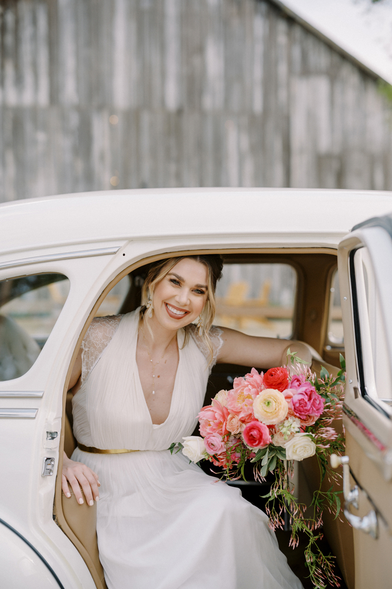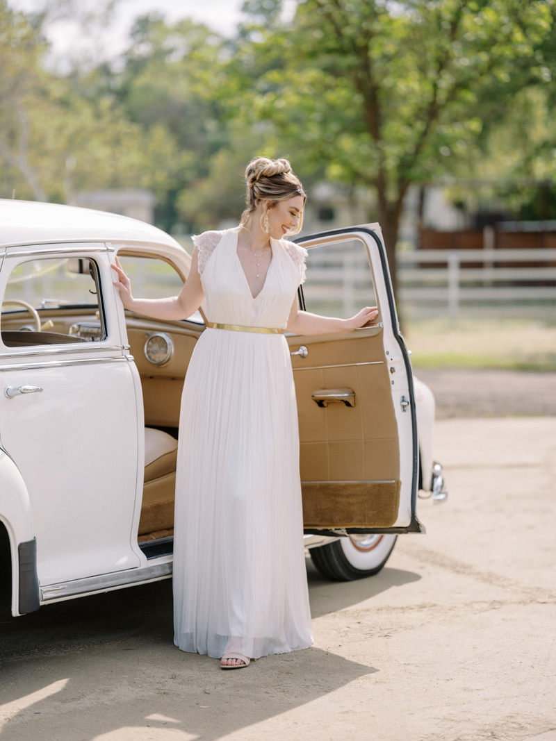 For as long as we can remember, we’ve always wanted to get “Pearl” on one of our shoots, and the stars finally aligned and the beautiful Miss Pearl made her Real Weddings Magazine debut in our “Charmed by Love” styled shoot in the current Summer/Fall 2022 issue! This vintage 1948 Pontiac Silver Streak was lovingly (and painstakingly) restored and is now available for weddings and special events through Sentimental Journey Vintage Transportation! Don’t you think Pearl makes a great co-star with our real bride model Lexi in this shoot? Yeah, we think so too, so without further ado, we’re proud to feature this very special “Pearl Sighting!“