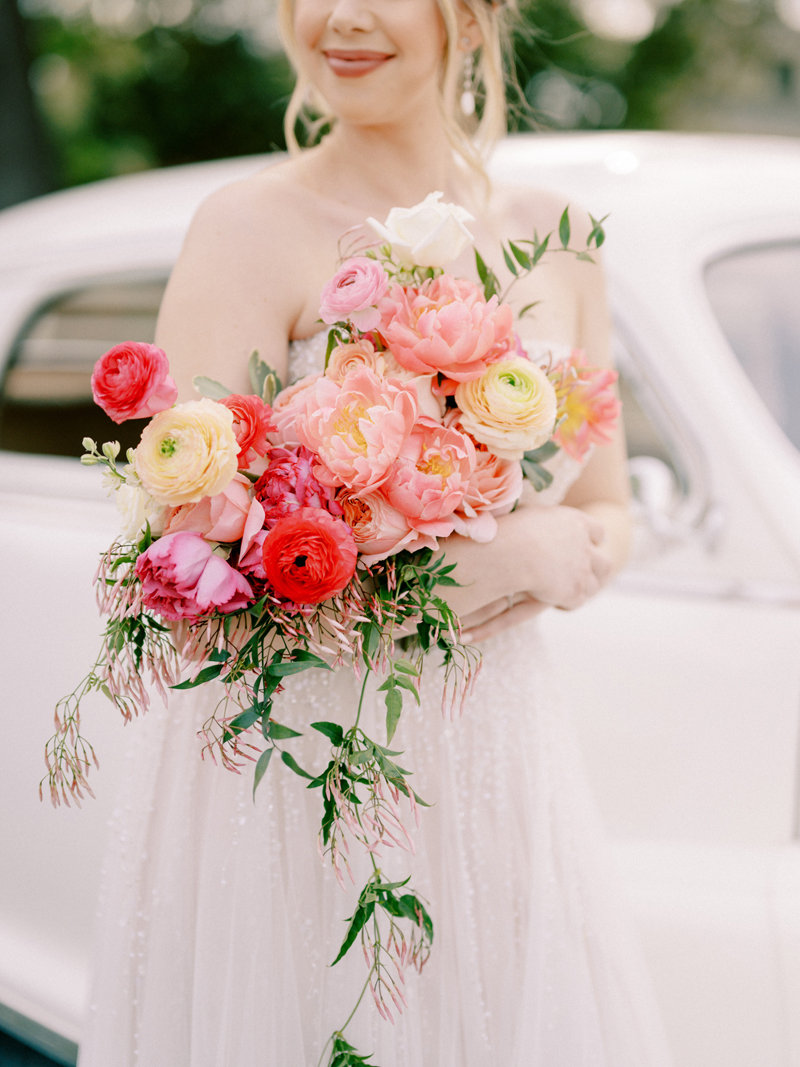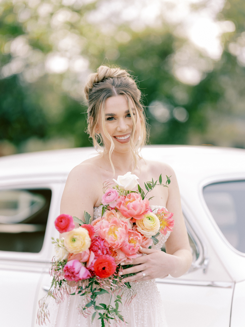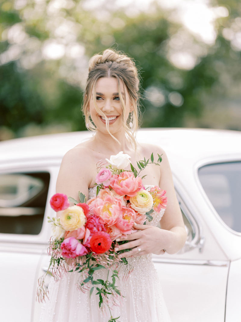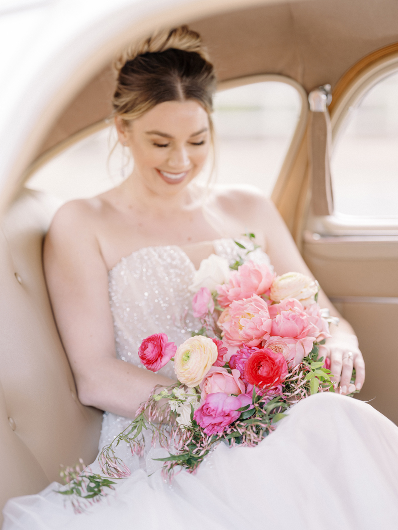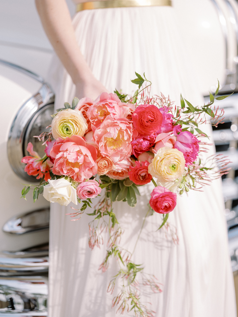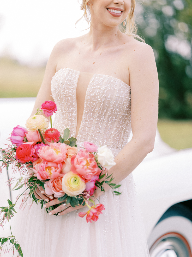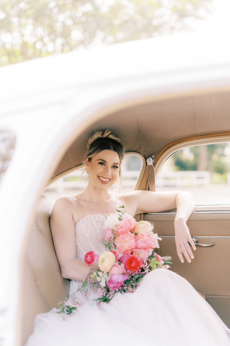 For as long as we can remember, we’ve always wanted to get “Pearl” on one of our shoots, and the stars finally aligned and the beautiful Miss Pearl made her Real Weddings Magazine debut in our “Charmed by Love” styled shoot in the current Summer/Fall 2022 issue! This vintage 1948 Pontiac Silver Streak was lovingly (and painstakingly) restored and is now available for weddings and special events through Sentimental Journey Vintage Transportation! Don’t you think Pearl makes a great co-star with our real bride model Lexi in this shoot? Yeah, we think so too, so without further ado, we’re proud to feature this very special “Pearl Sighting!“