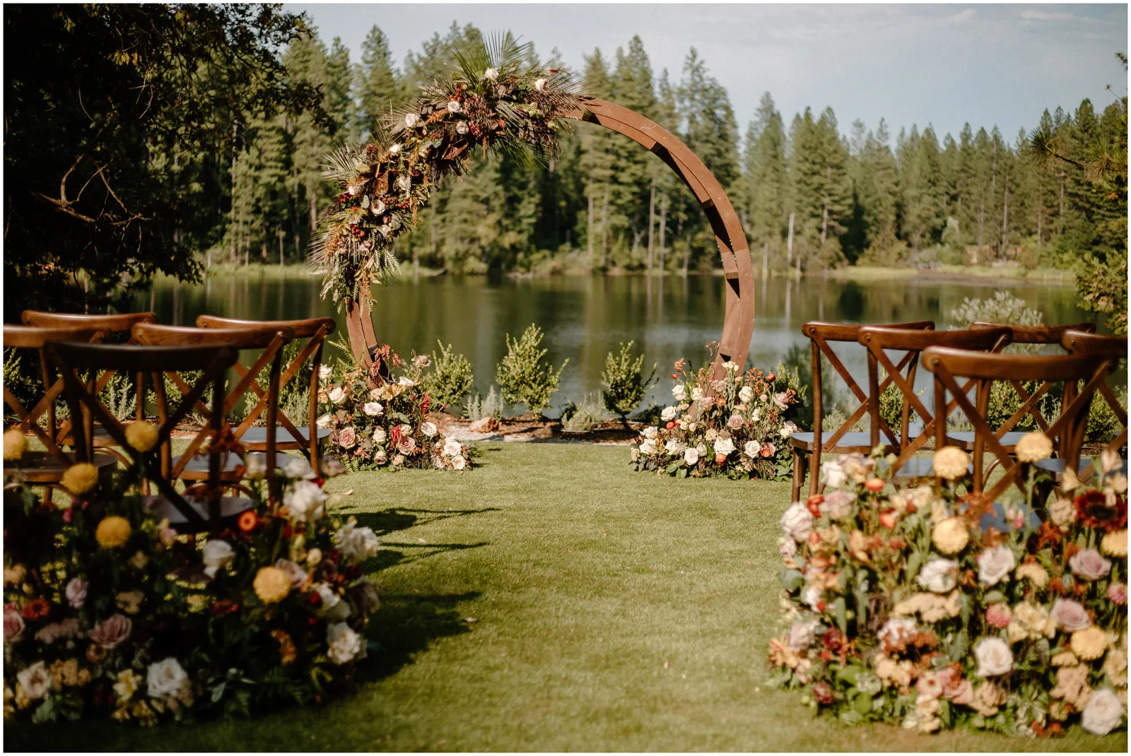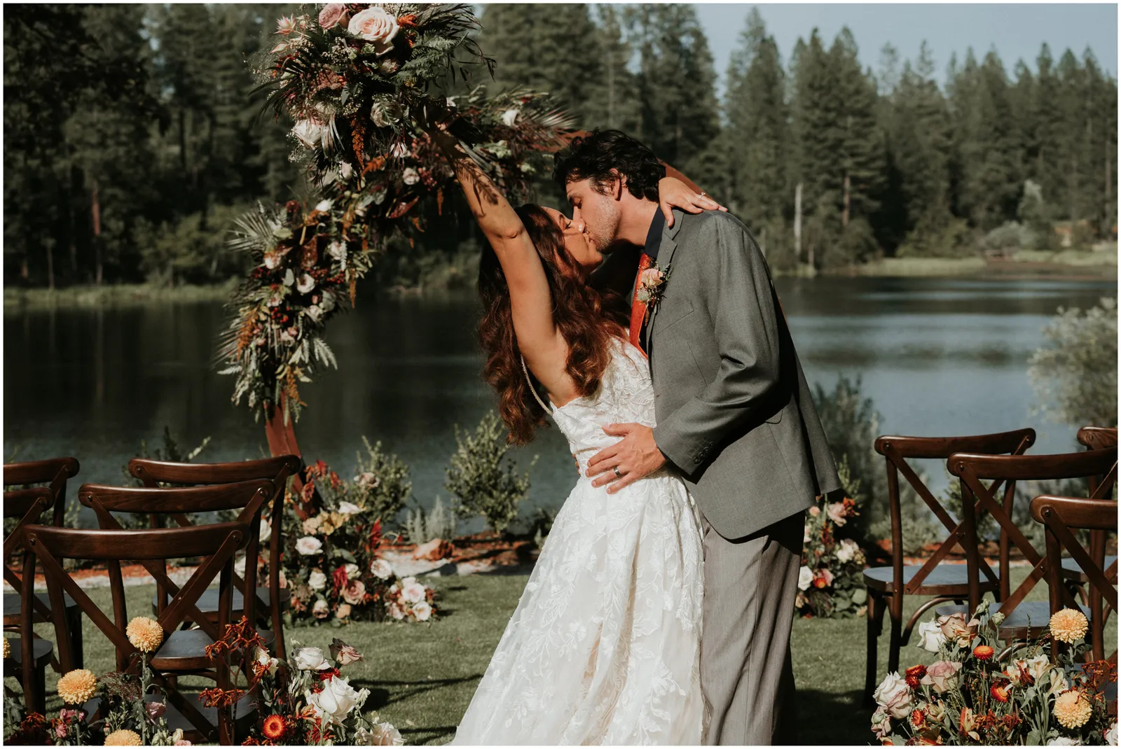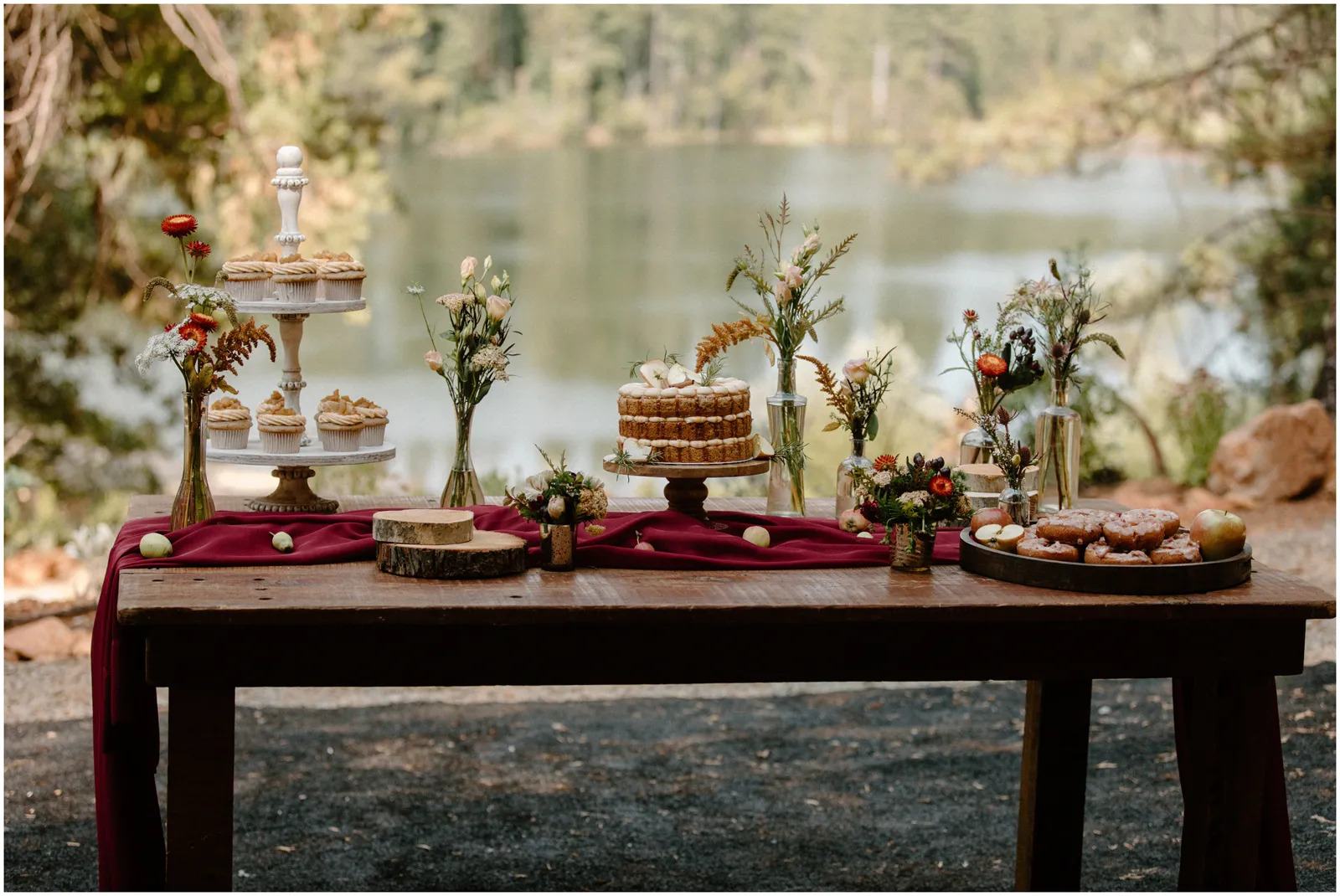 Inspired by the dreamy views of Blakely Lake and Apple Hill along with the natural grounds featuring gorgeous meadows and towering pines, our creative team designed a beautiful fall-inspired minimony and reception styled shoot to complement this natural landscape. Plus, we got to eat the famous apple doughnuts while we worked and played!”—photographer Katelyn Bradley on the inspiration behind this shoot