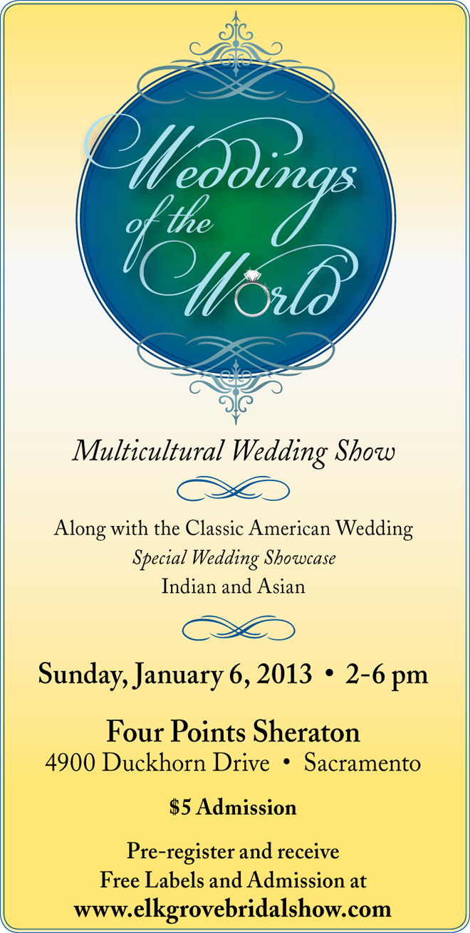 Today’s the Day! It’s the Weddings of the World – Multicultural Wedding Show at the Four Points Sheraton in Natomas today from 2-6 p.m. Stop by our booth to get your FREE copy of Real Weddings Magazine, a copy of our wedding planner Real Weddings Magazine’s The Bride’s Guide, and register for a chance to win a $150 gift certificate to Laser Esthetica! Scroll down for all the details to this great event!