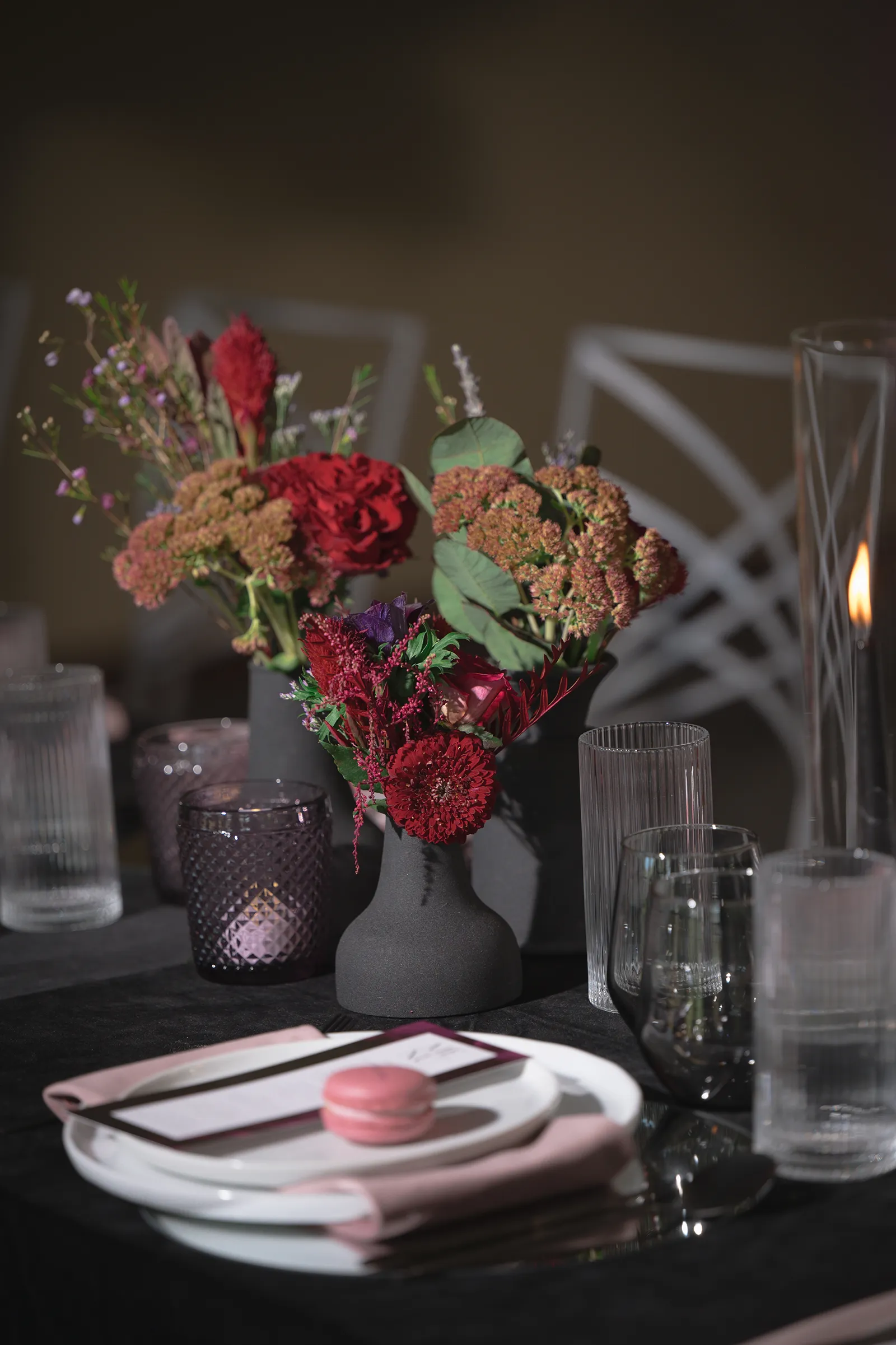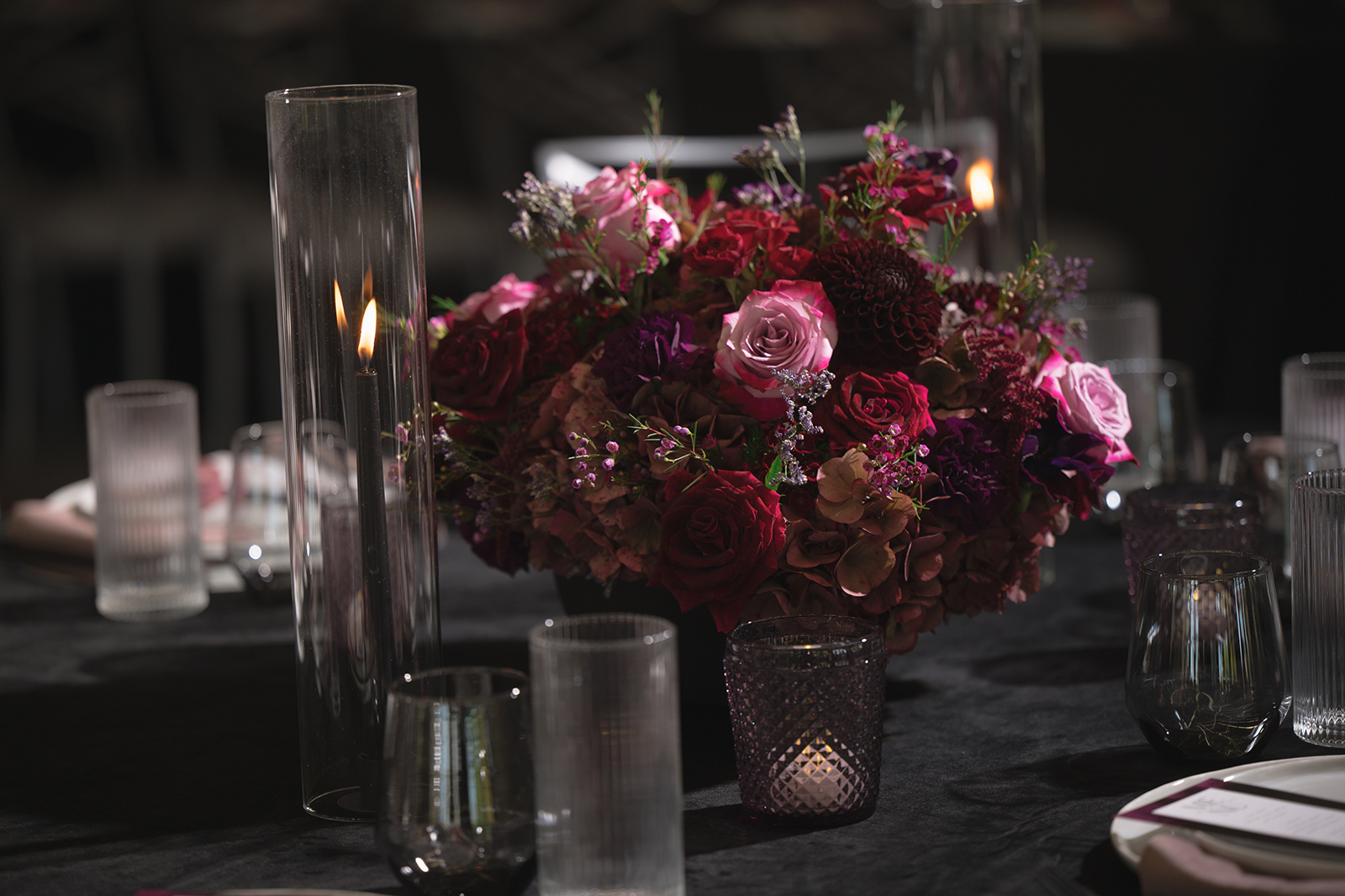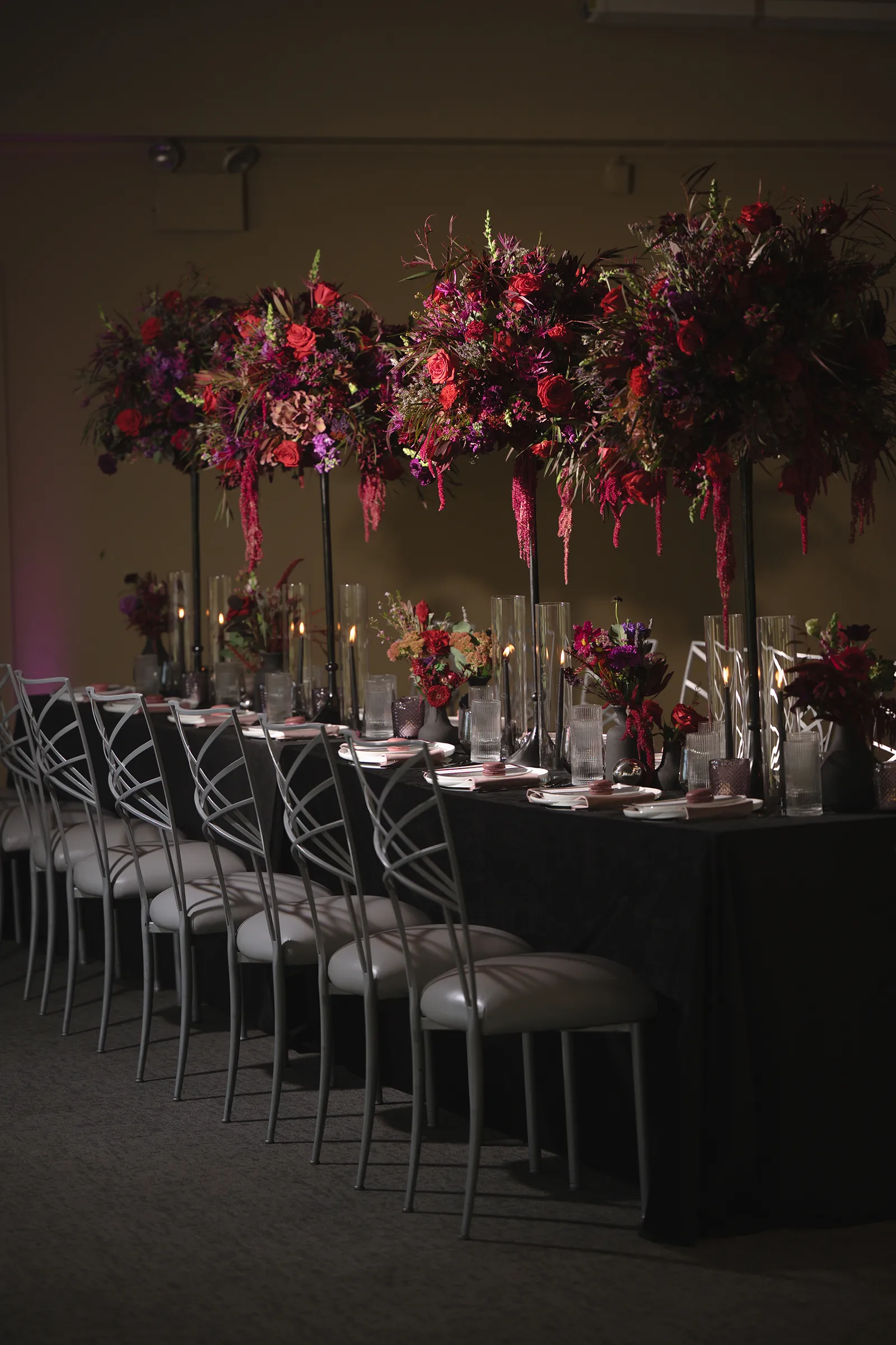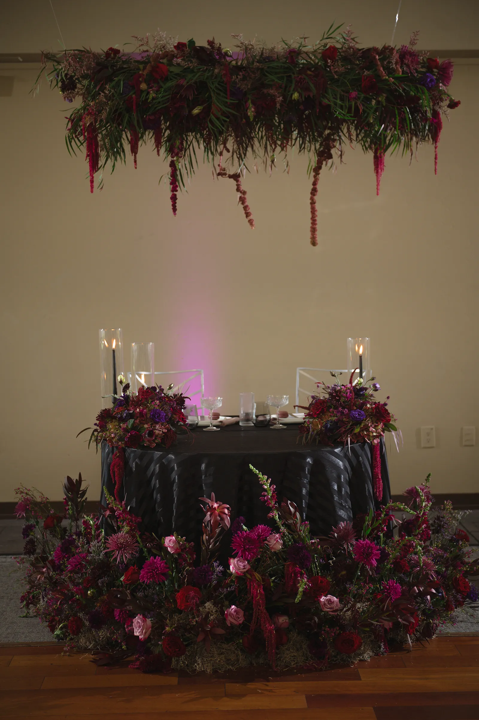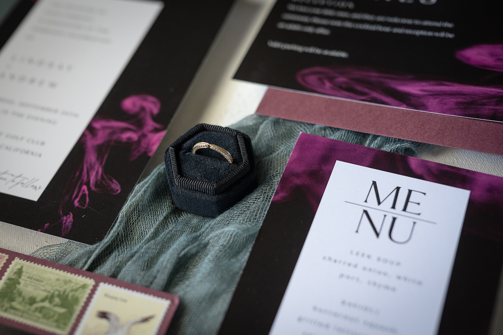 Moody, dark details can create a super romantic wedding. In the Mood for Love features lots of dark reds, pinks, and purples, a fog machine, and a stunning floral curtain…like STUN-NING. Check out all these pretty details from In the Mood for Love featured in the Winter/Spring 2024 issue. We hope it inspires you for your wedding!