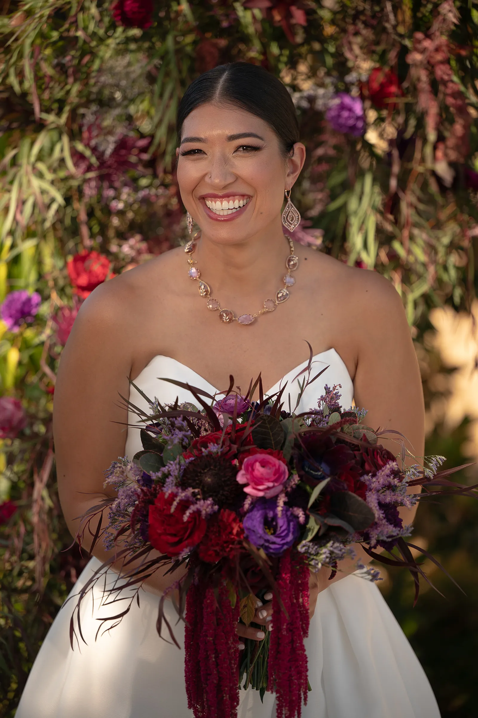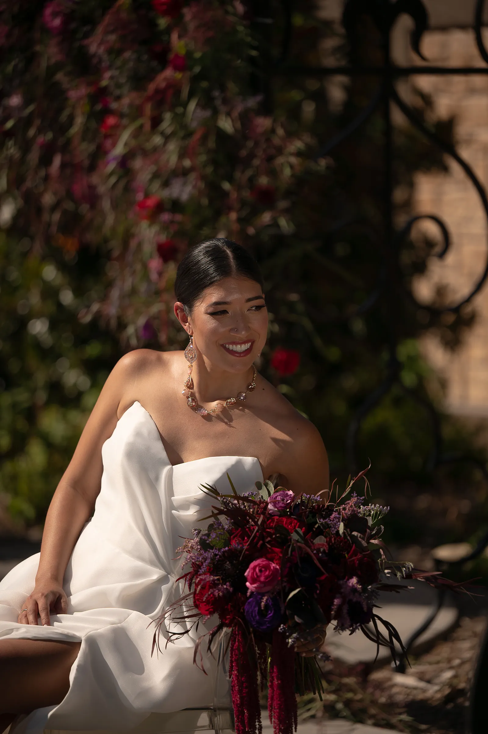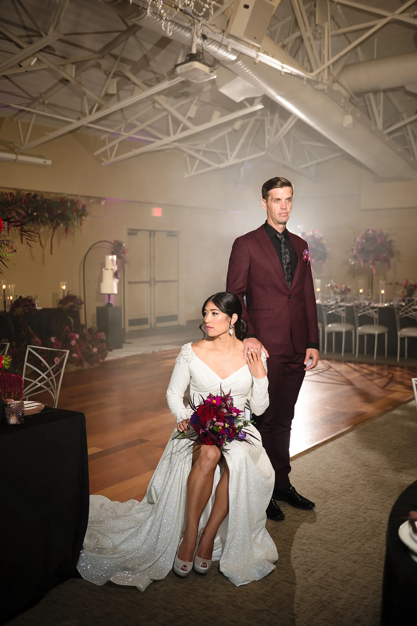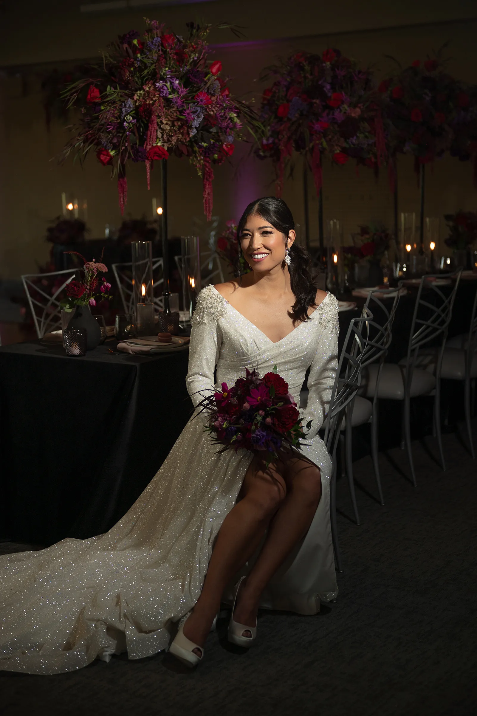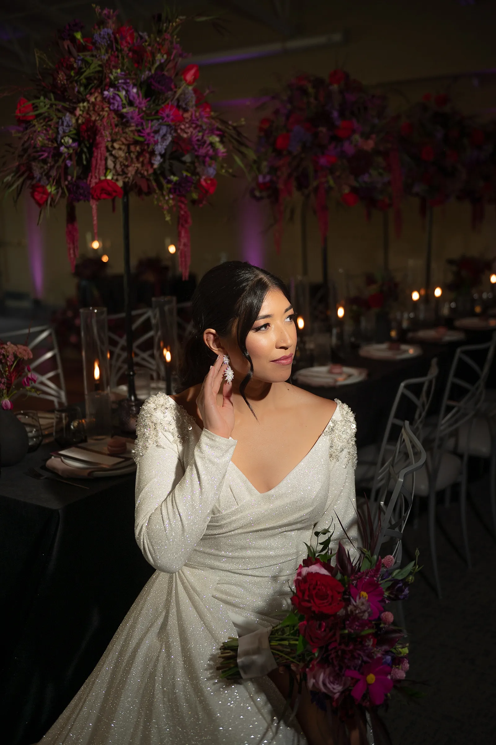 L: I loved the colors. They were much moodier than the colors we had at our wedding. So it was so much fun to have different colors, more intense makeup, different hairstyles, and different dresses than I would have chosen. The venue was gorgeous and can easily see how it would make a great place for weddings. The food set up and display of food/drink and of course the beyond gorgeous flowers were all amazing! I enjoy hosting parties/dinners and loved the set up for this wedding. I could see all of this being at a real wedding!