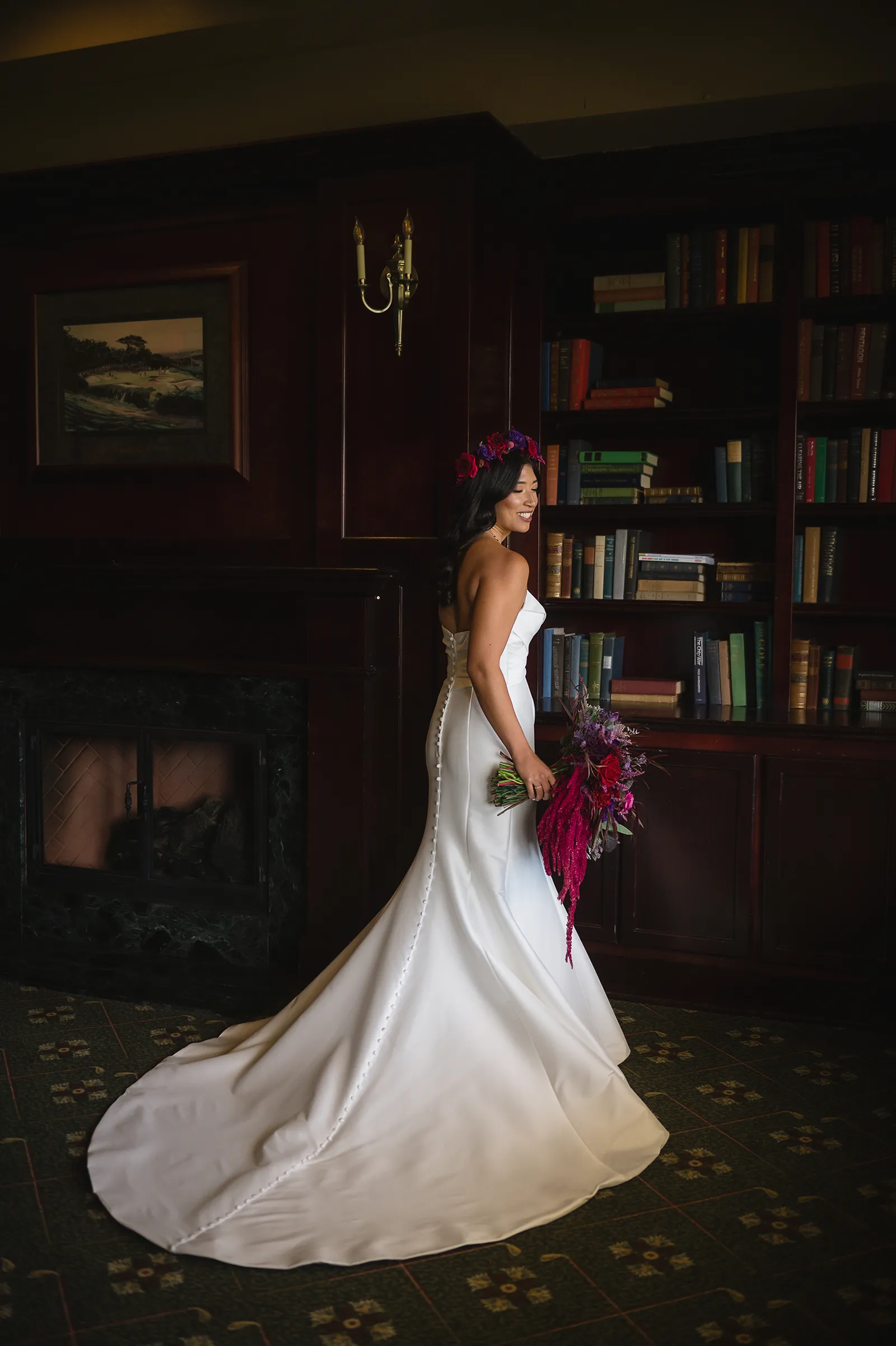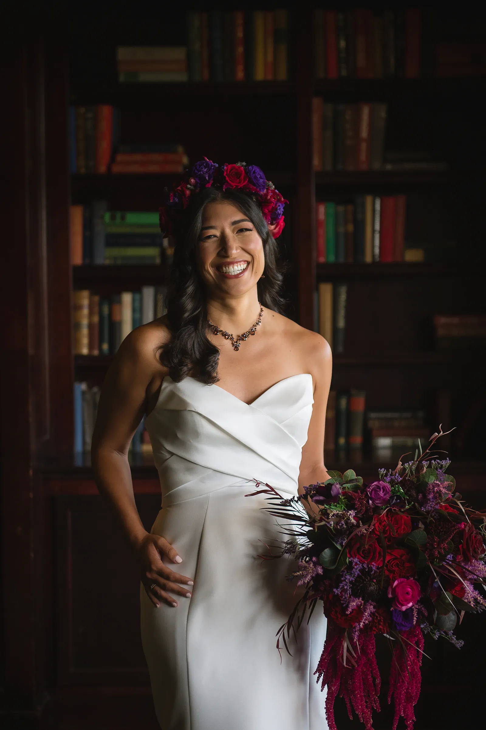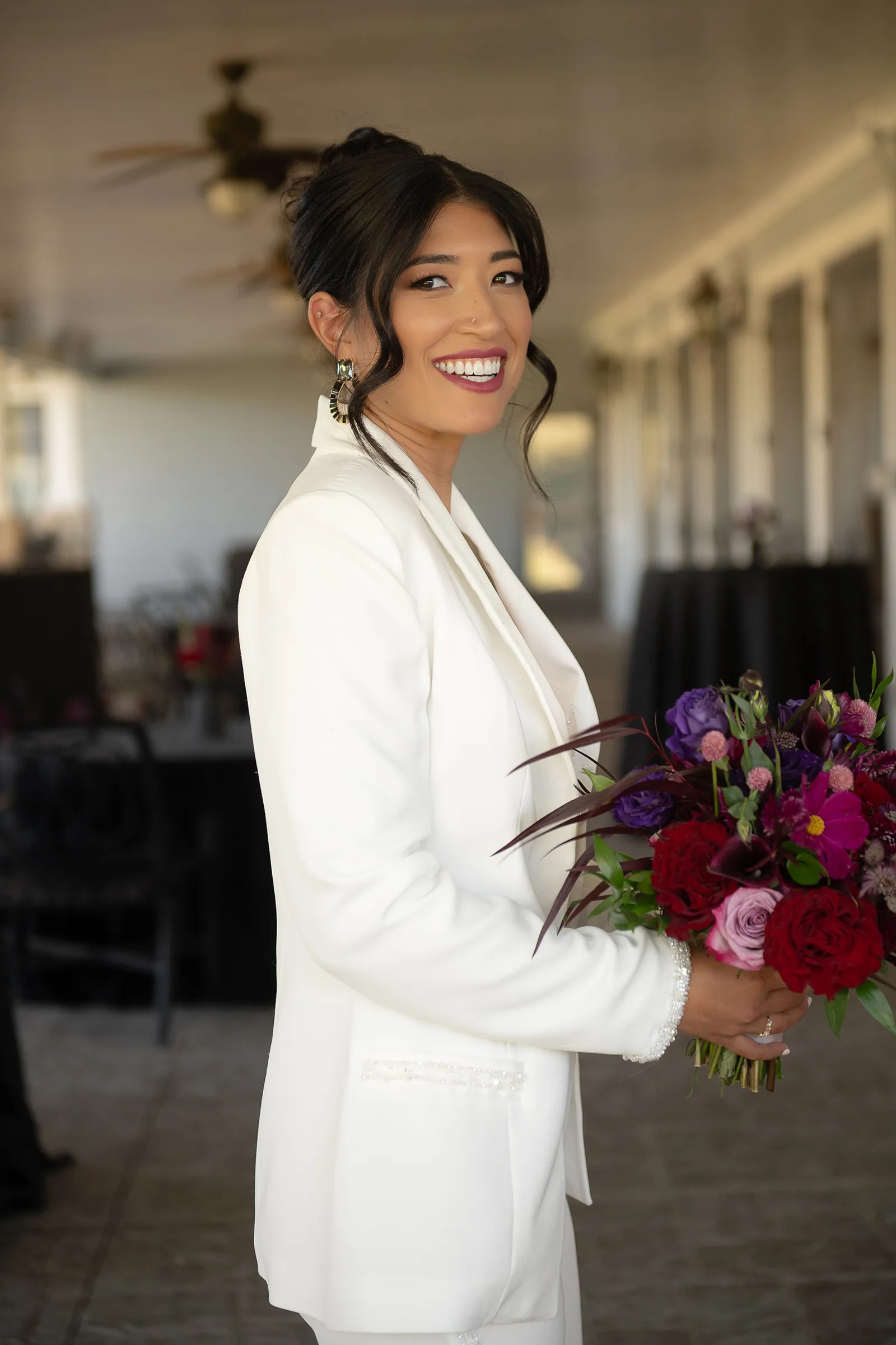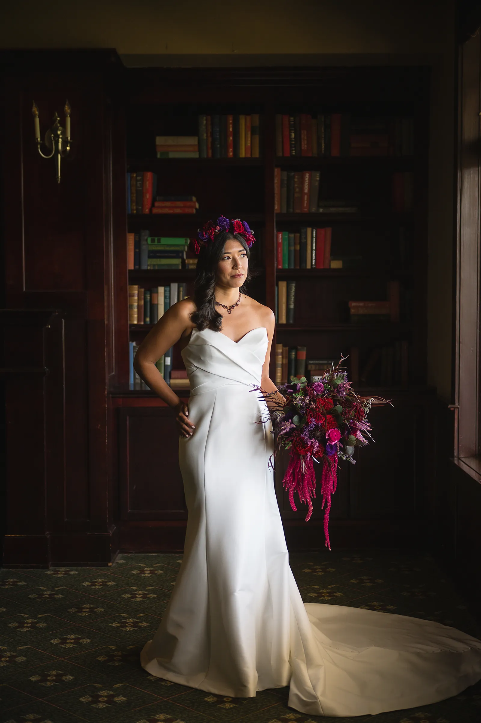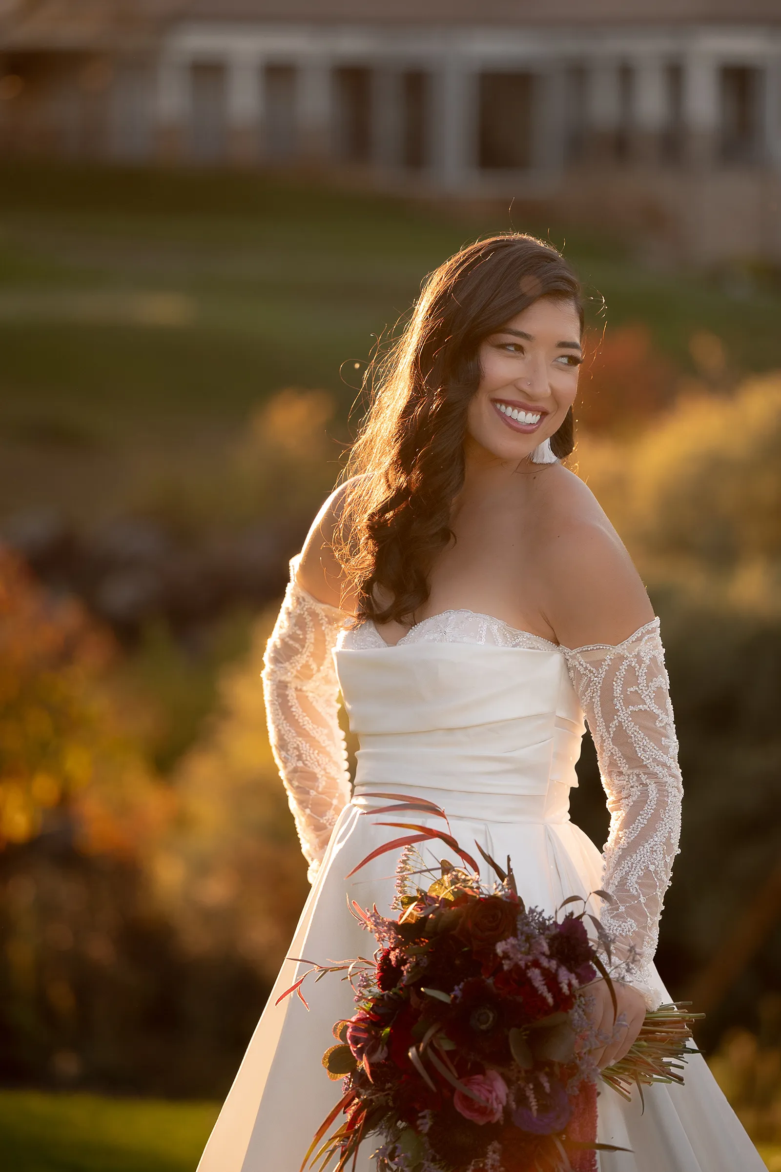 L: I loved the colors. They were much moodier than the colors we had at our wedding. So it was so much fun to have different colors, more intense makeup, different hairstyles, and different dresses than I would have chosen. The venue was gorgeous and can easily see how it would make a great place for weddings. The food set up and display of food/drink and of course the beyond gorgeous flowers were all amazing! I enjoy hosting parties/dinners and loved the set up for this wedding. I could see all of this being at a real wedding!