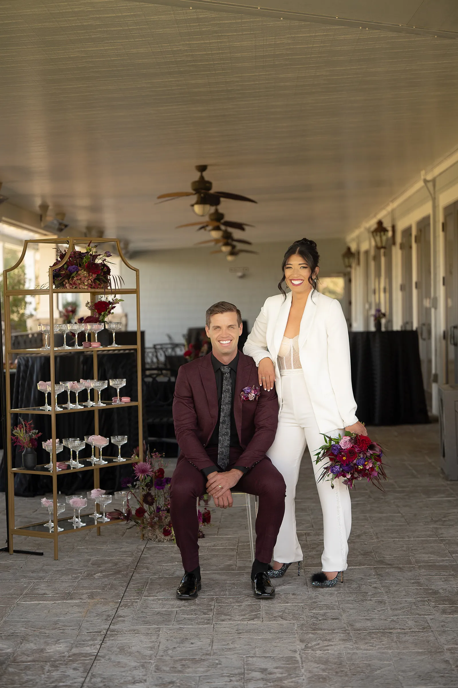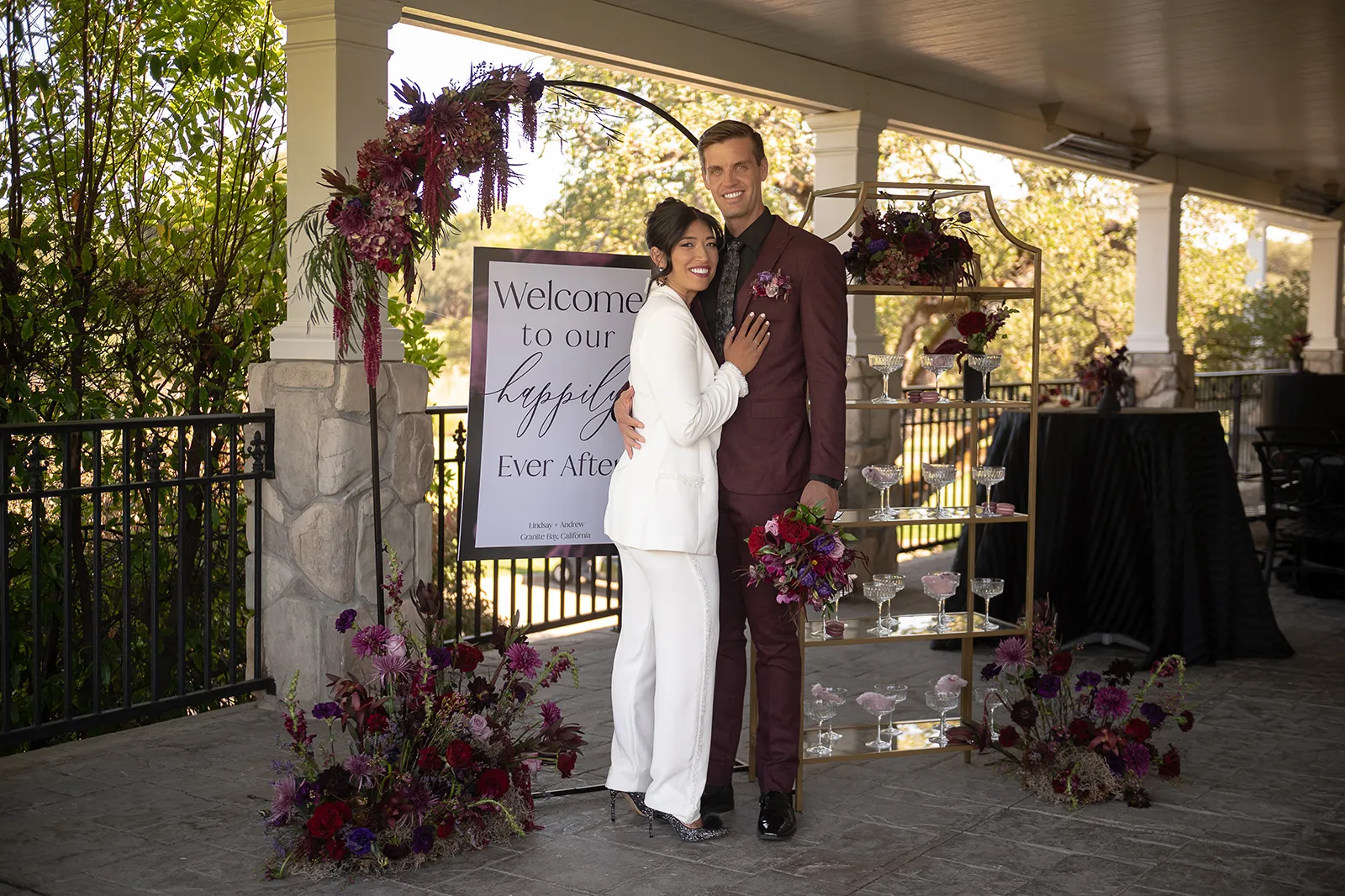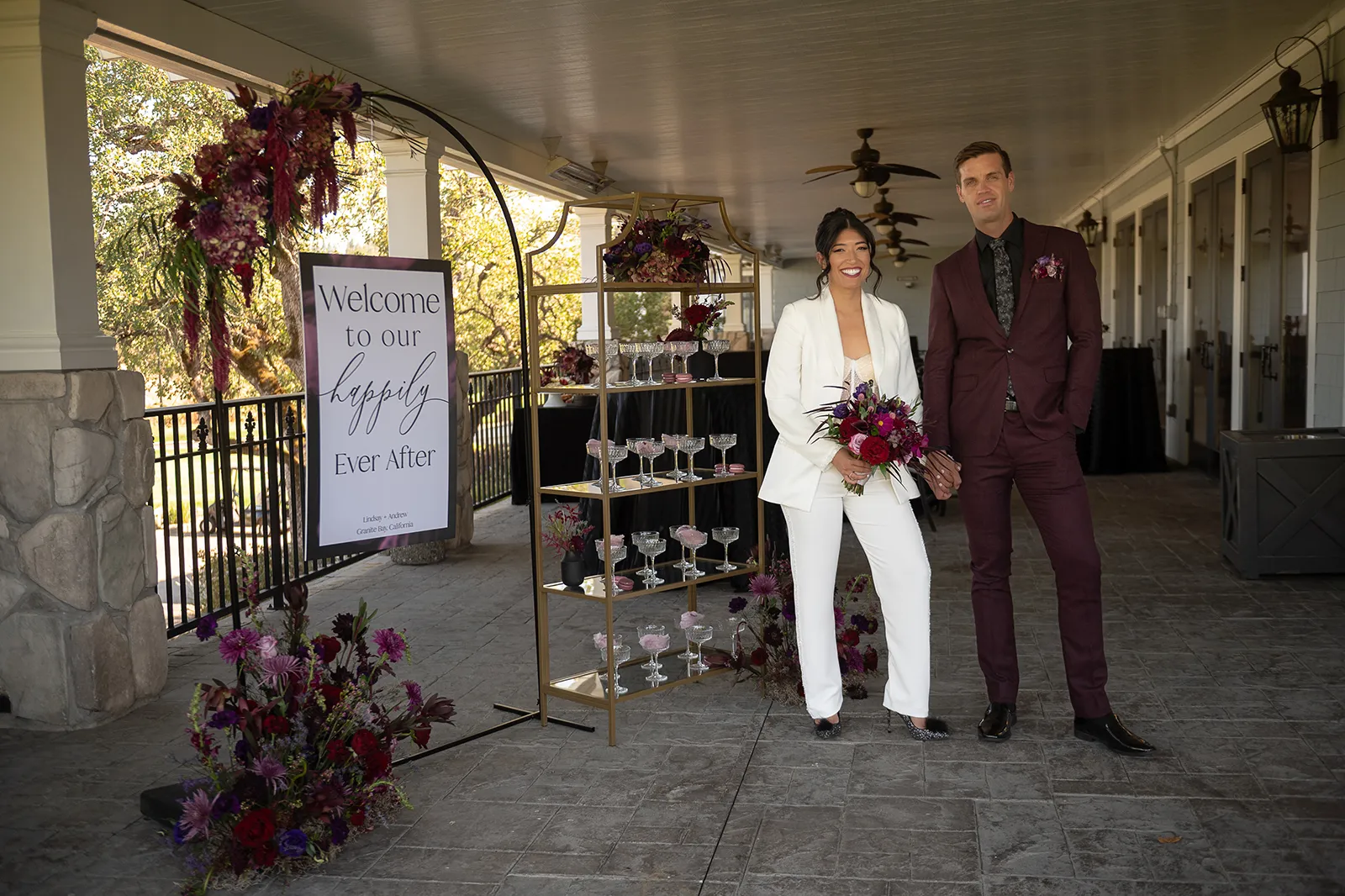 On Lindsay: Jumpsuit from The Bridal Box; Earrings from Macy’s; Shoes from DSW. On Andrew: Suit, Shirt and Shoes from Tuxedo Den; Tie from Macy’s