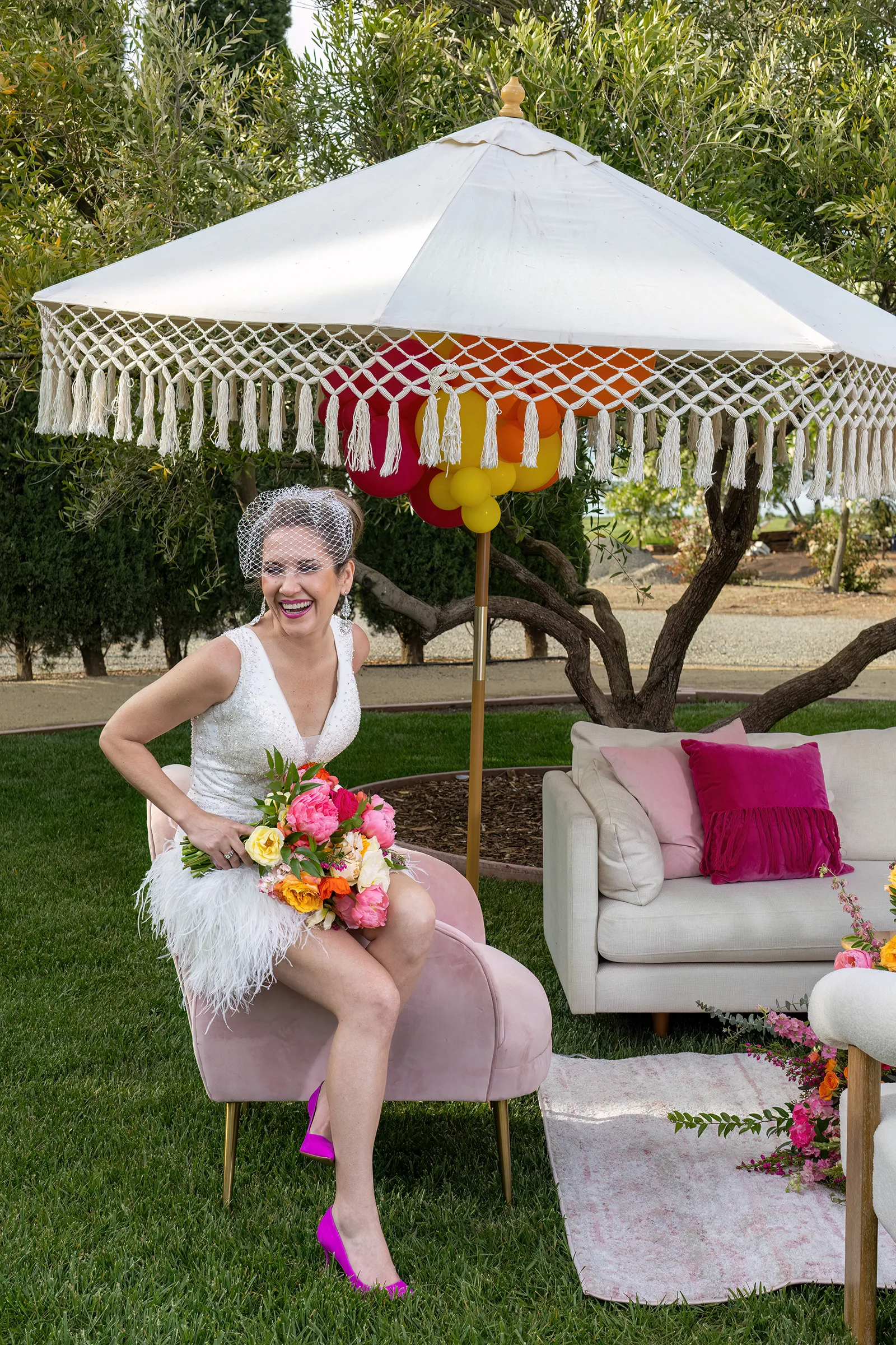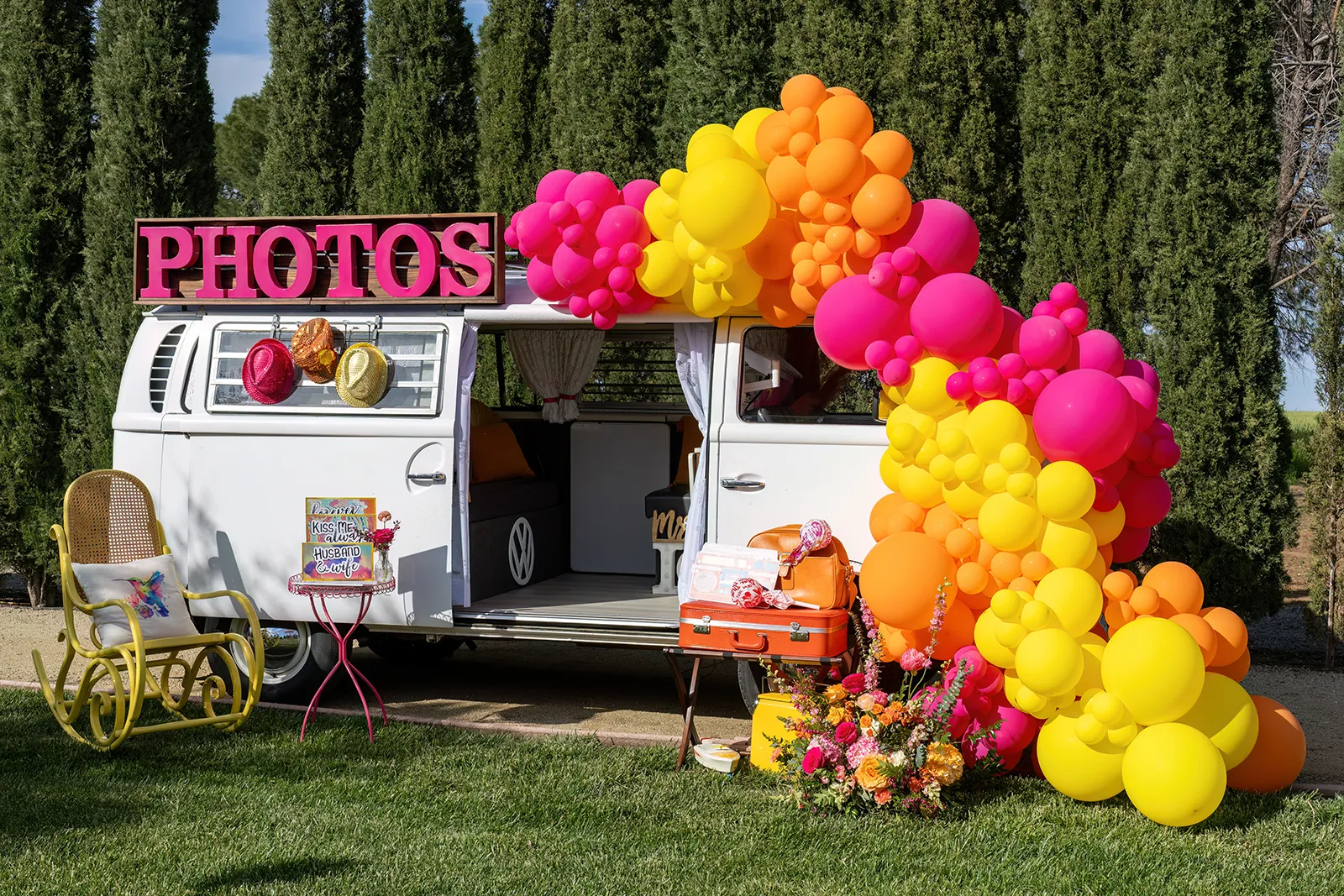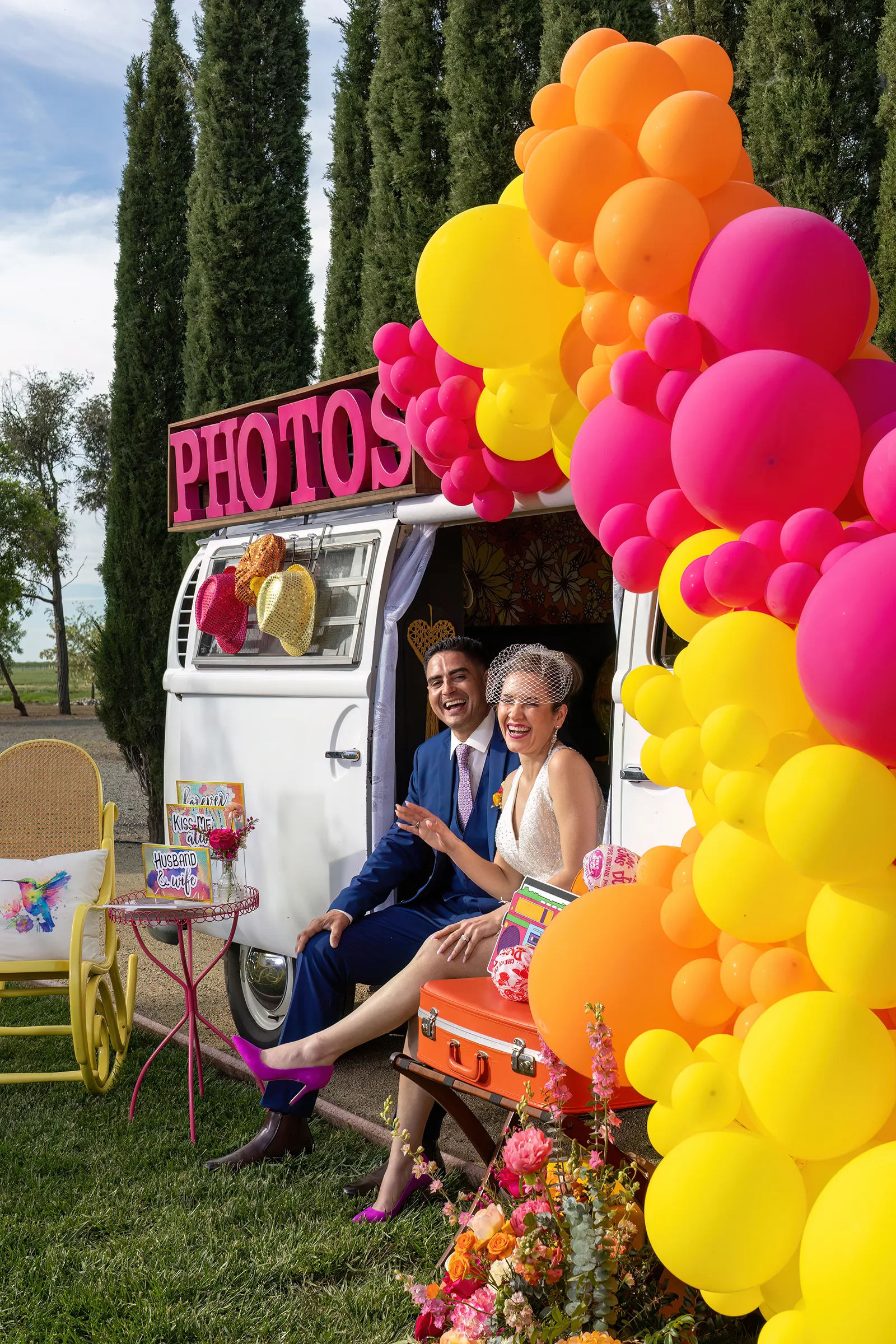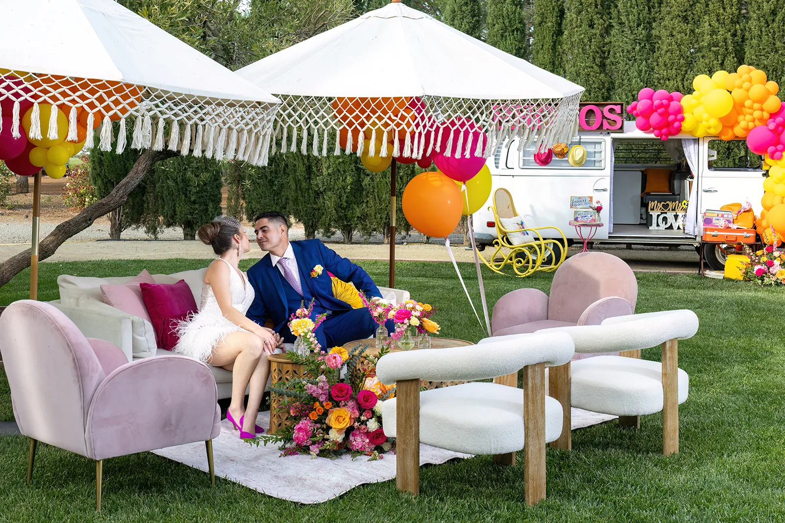 Bright, bold and beautiful. This shoot incorporates whimsical details: balloons, hanging flowers and a photo bus…all bursting with color!