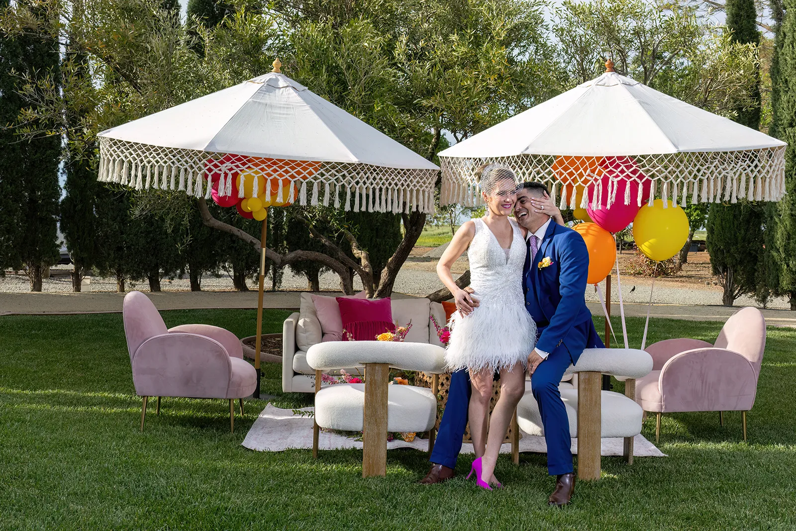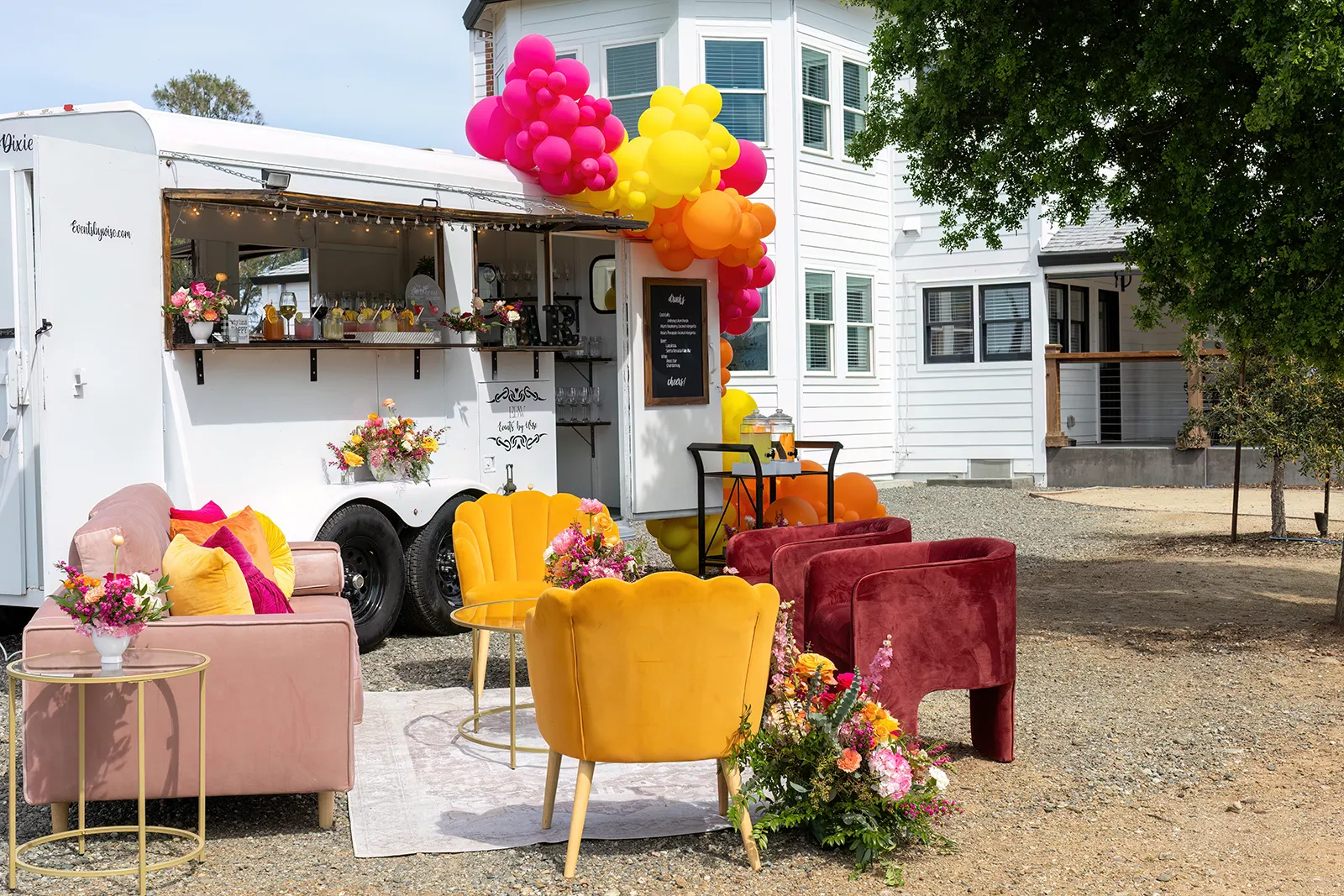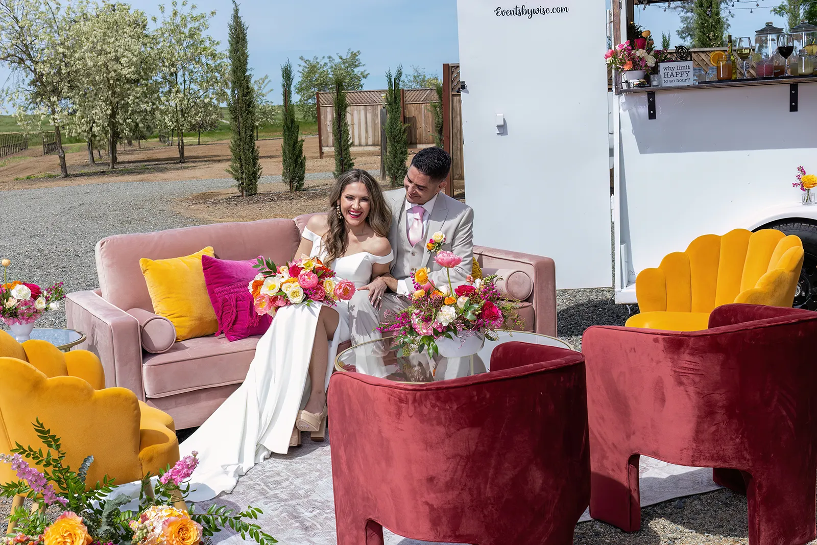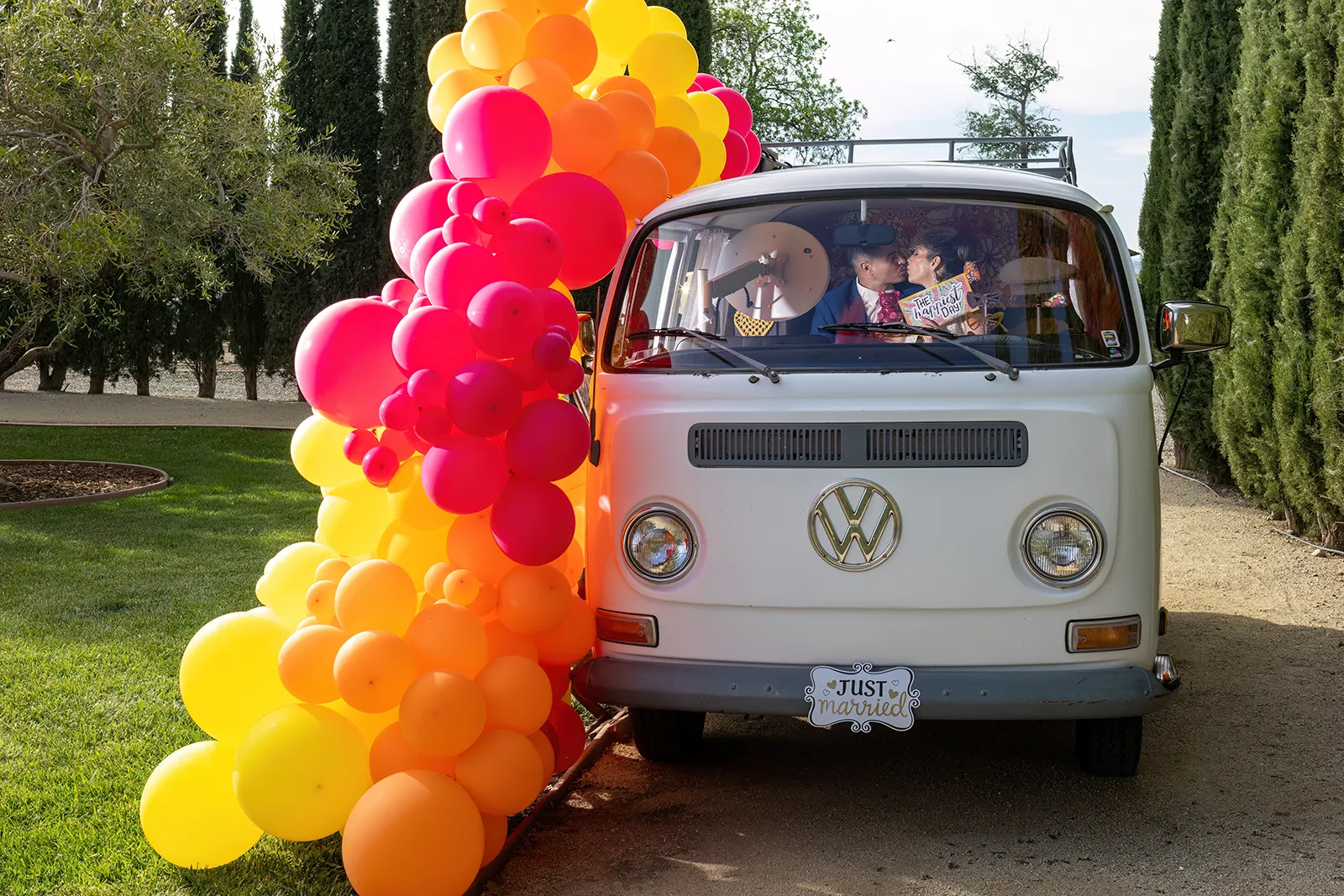 Bright, bold and beautiful. This shoot incorporates whimsical details: balloons, hanging flowers and a photo bus…all bursting with color!