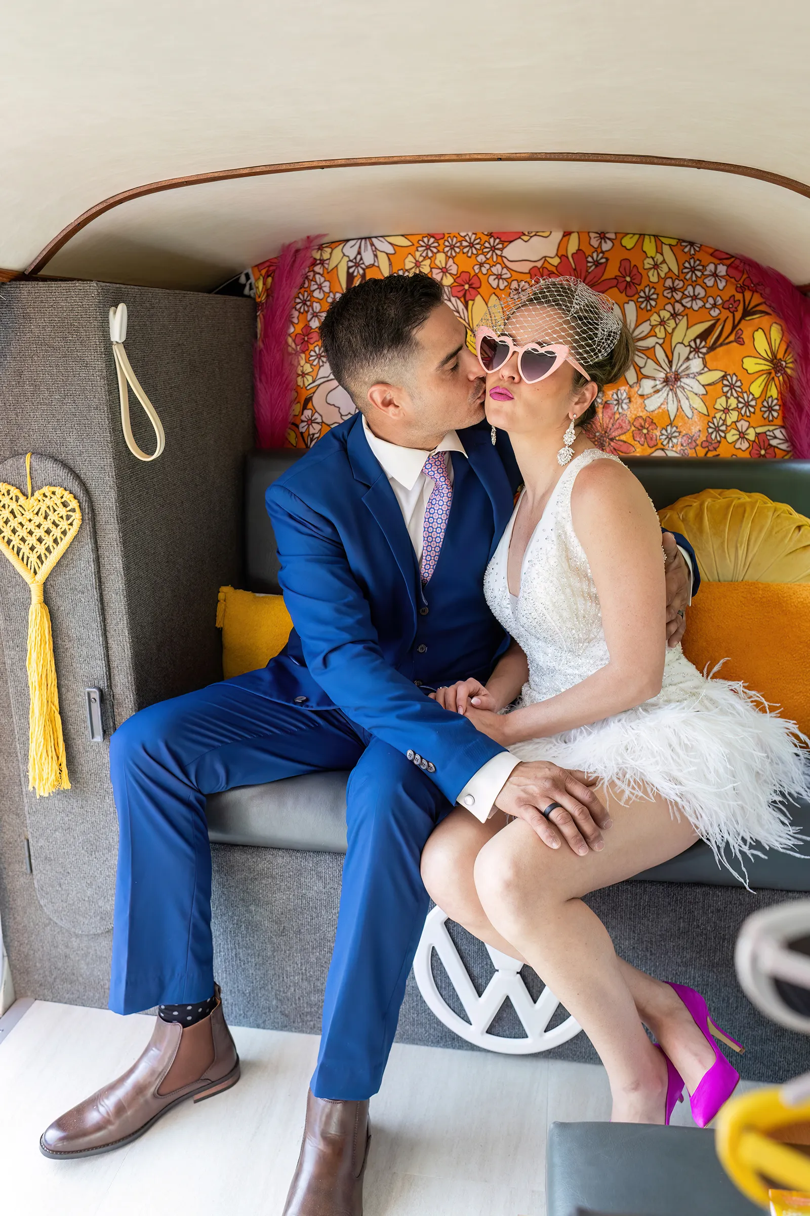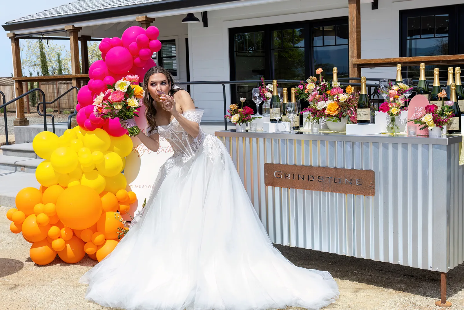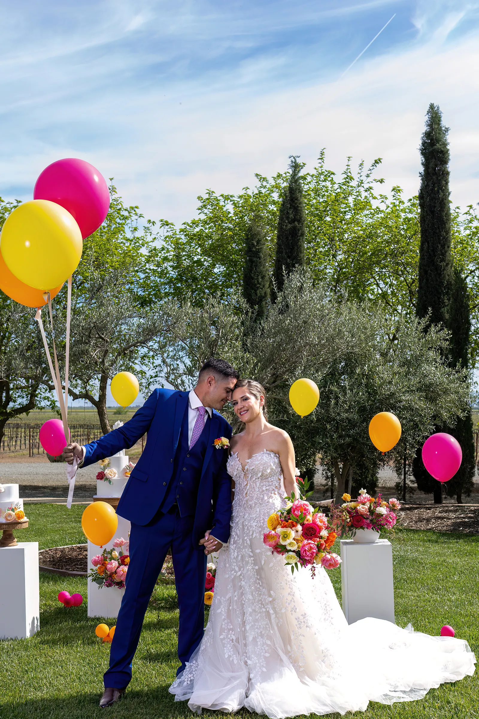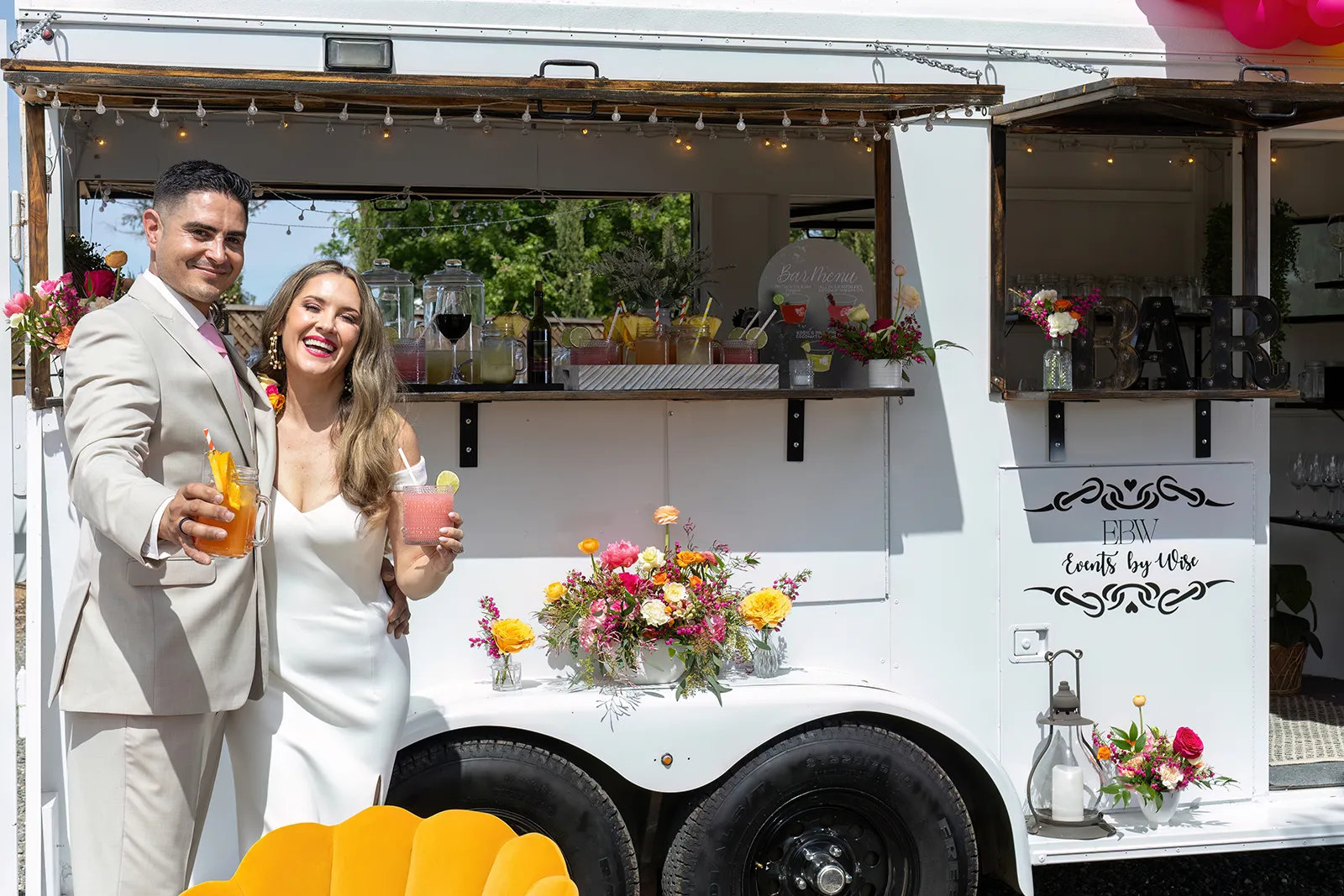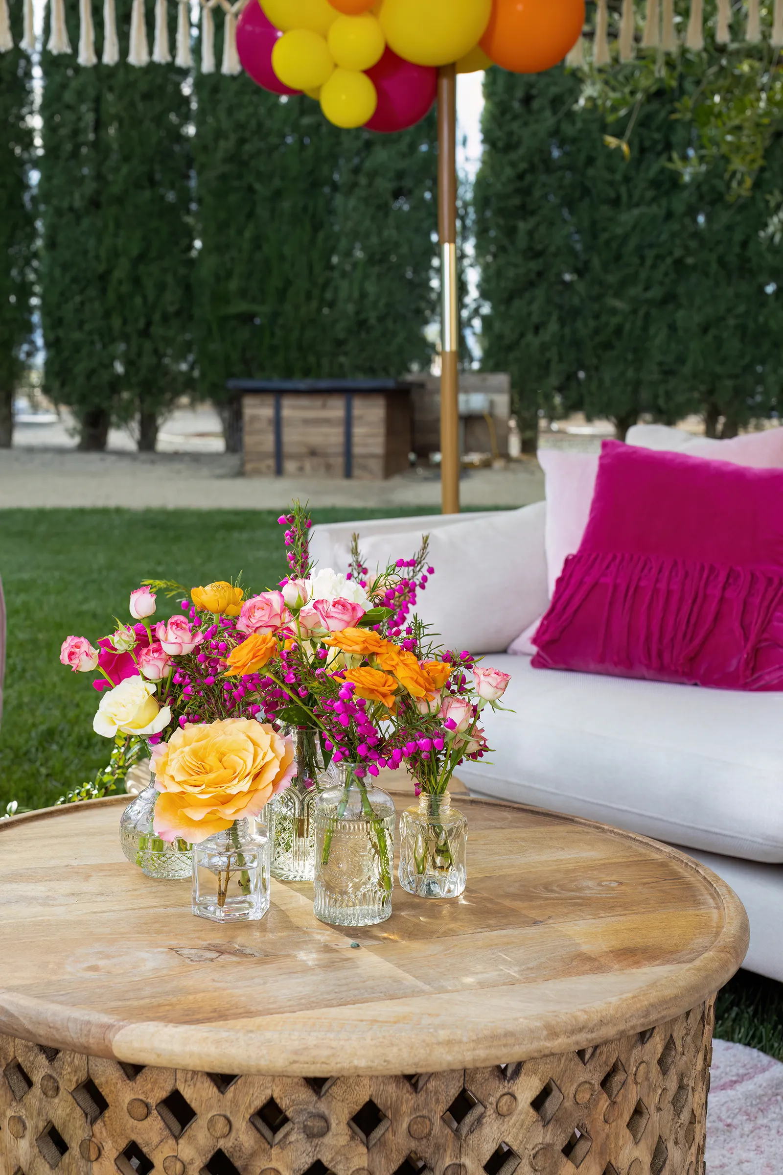 Bright, bold and beautiful. This shoot incorporates whimsical details: balloons, hanging flowers and a photo bus…all bursting with color!