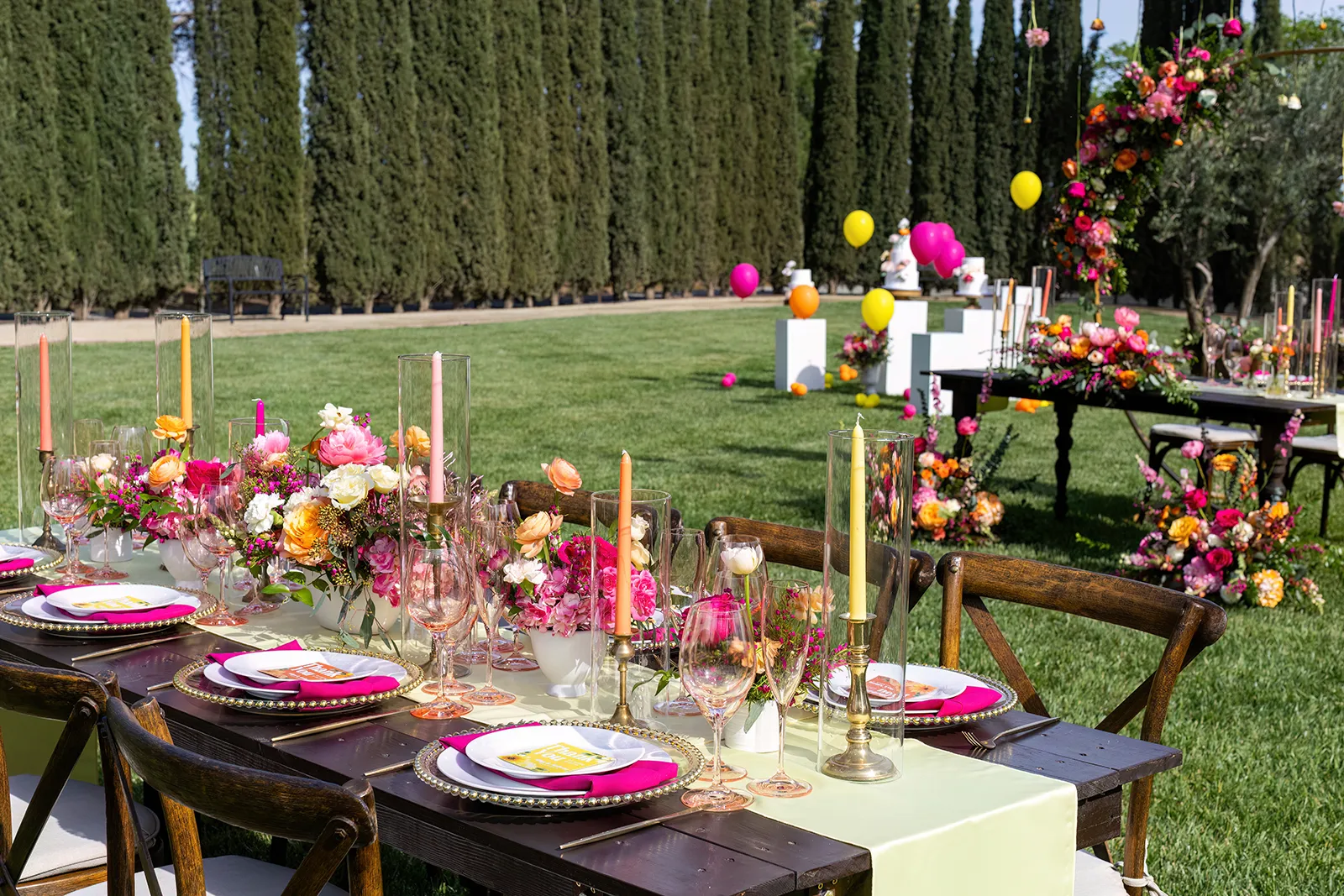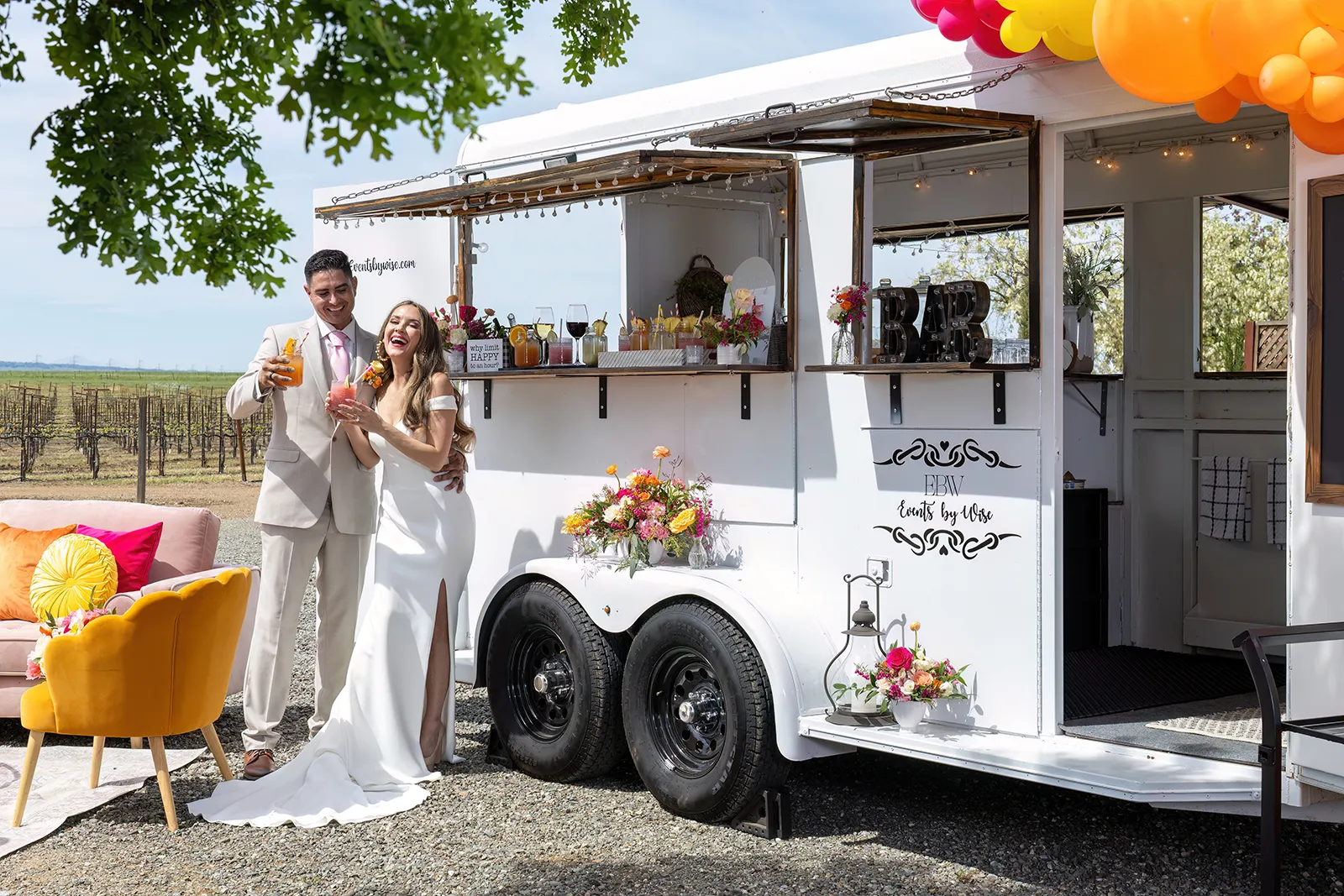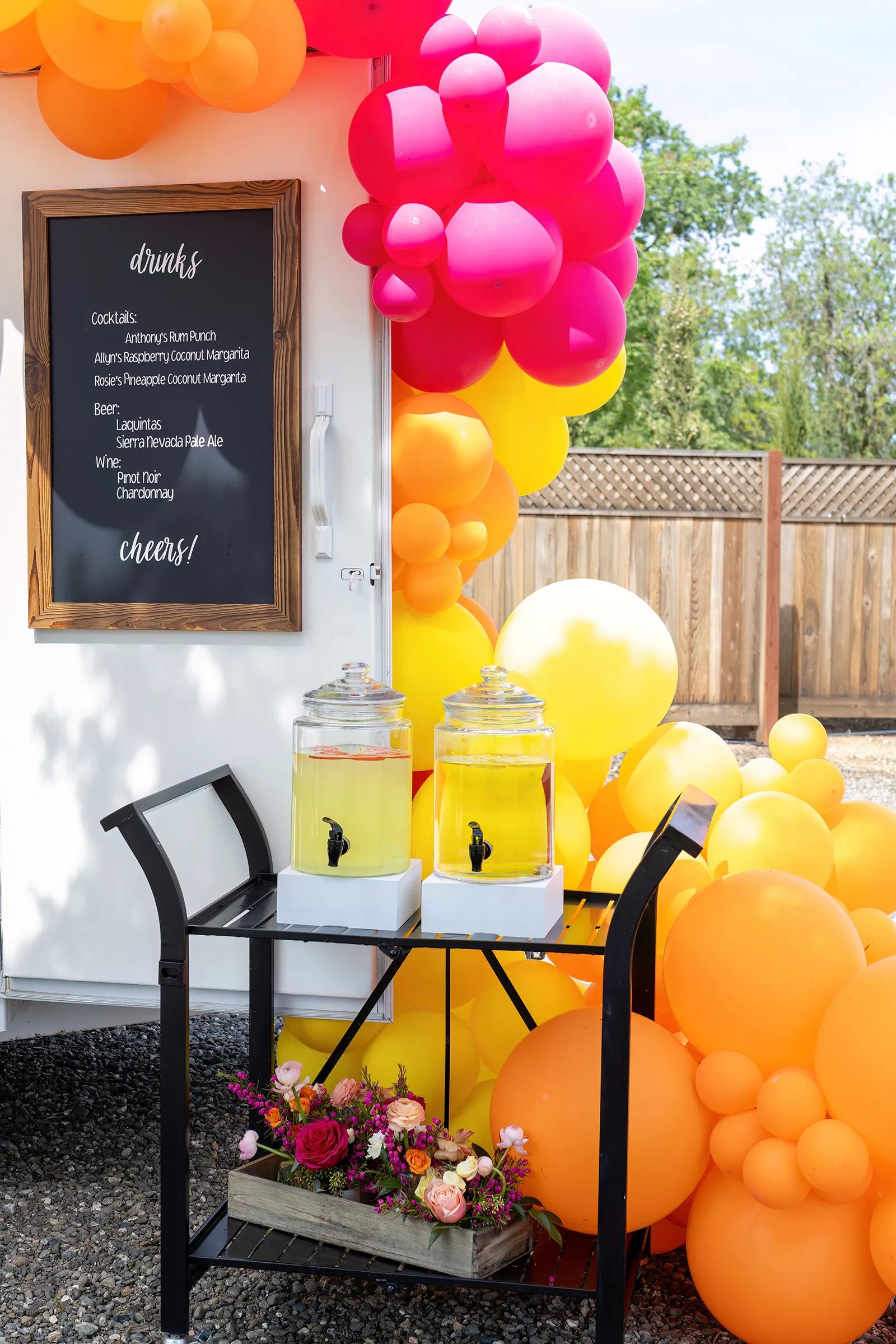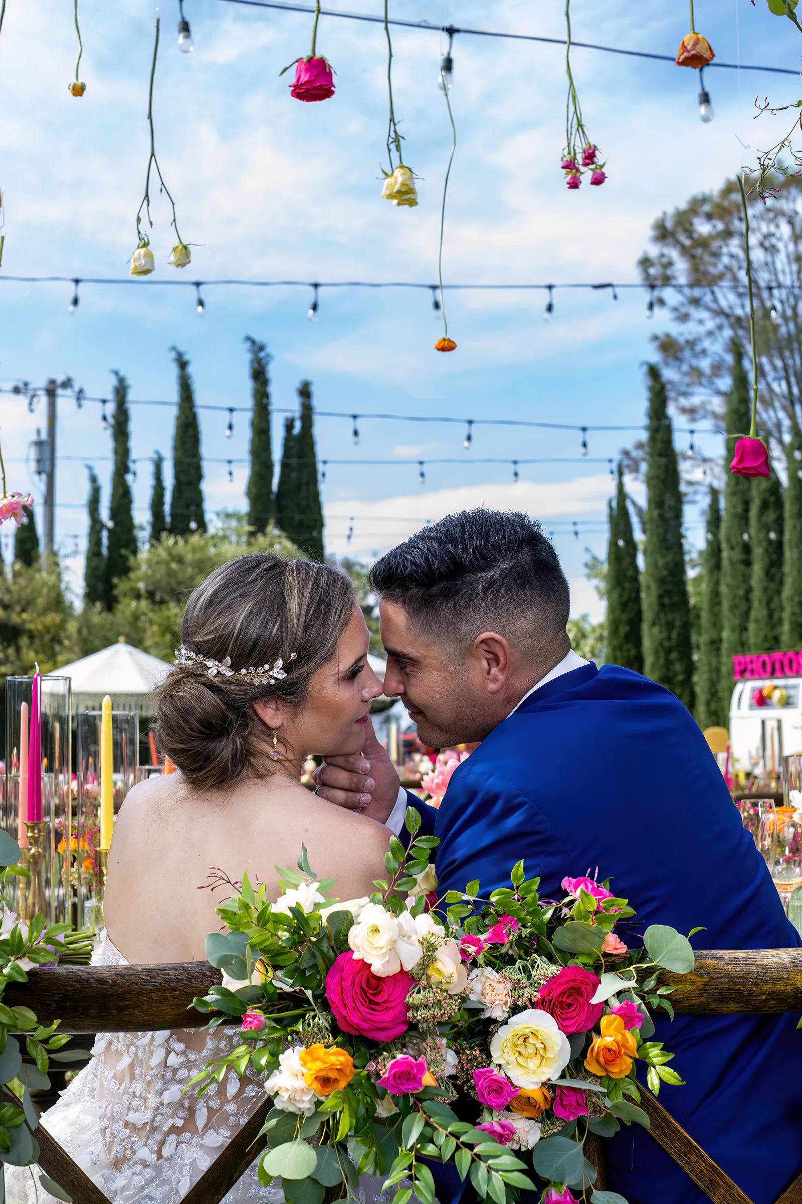 Bright, bold and beautiful. This shoot incorporates whimsical details: balloons, hanging flowers and a photo bus…all bursting with color!