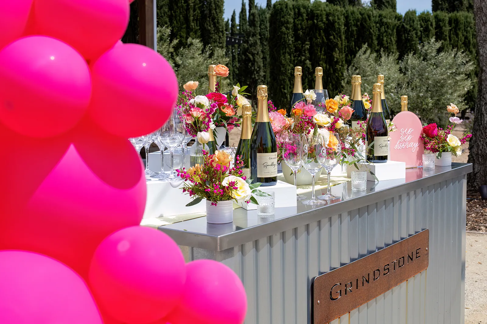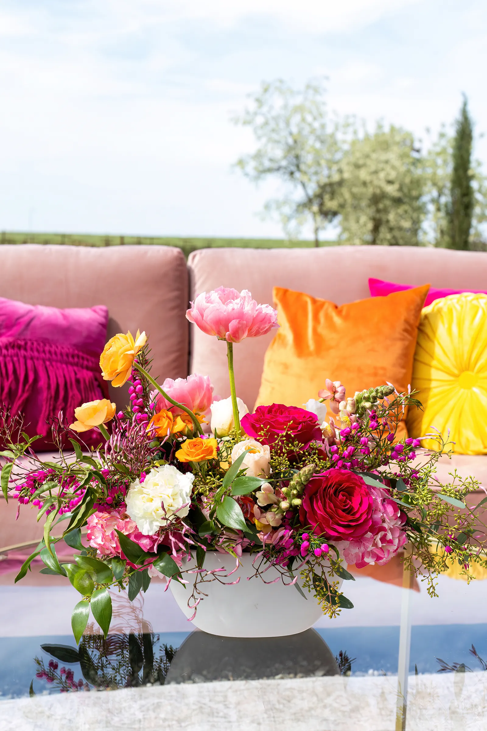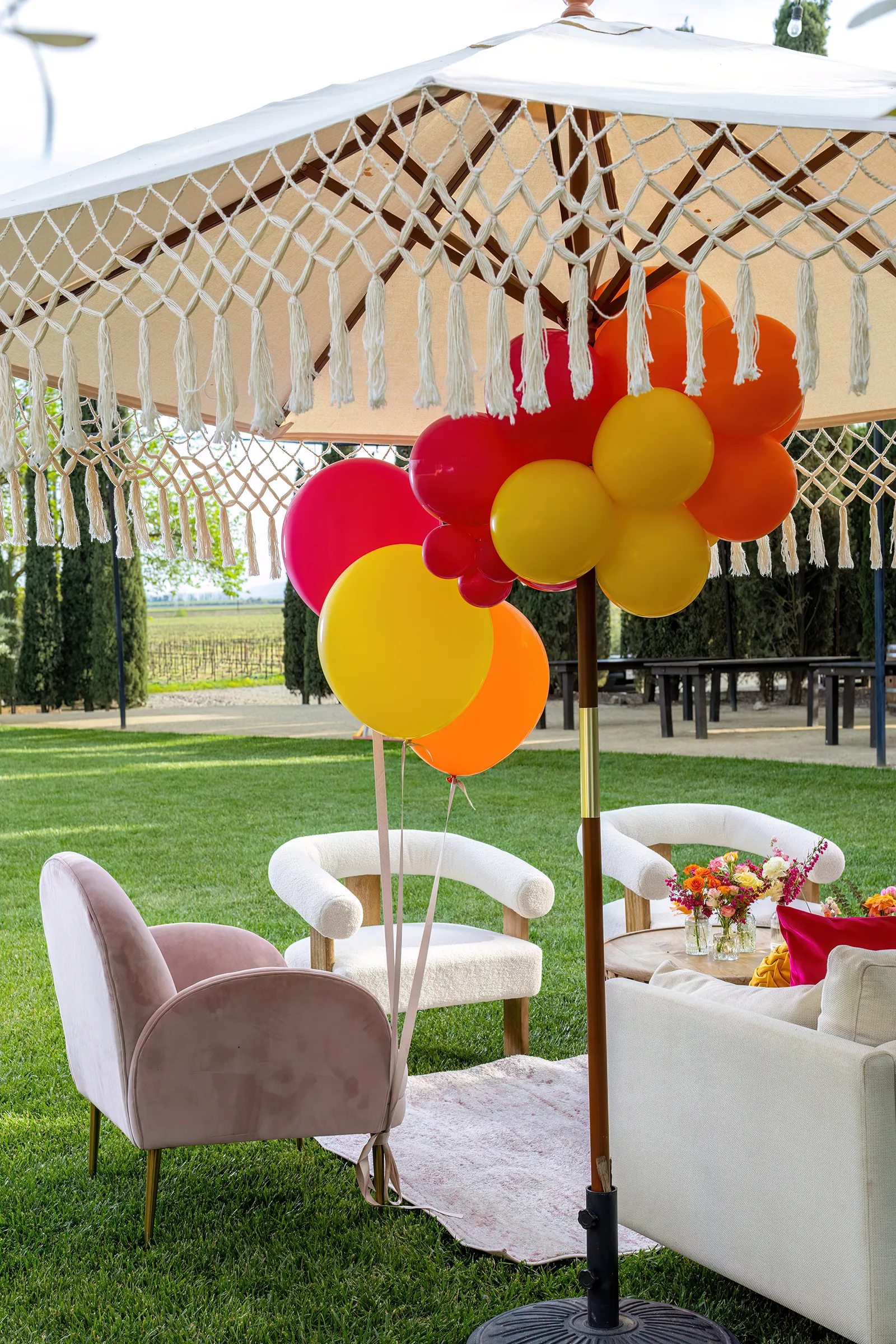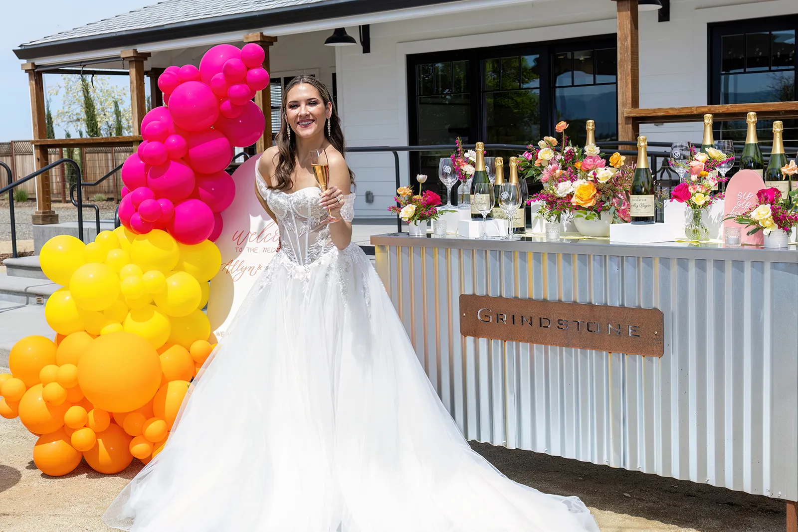 Bright, bold and beautiful. This shoot incorporates whimsical details: balloons, hanging flowers and a photo bus…all bursting with color!
