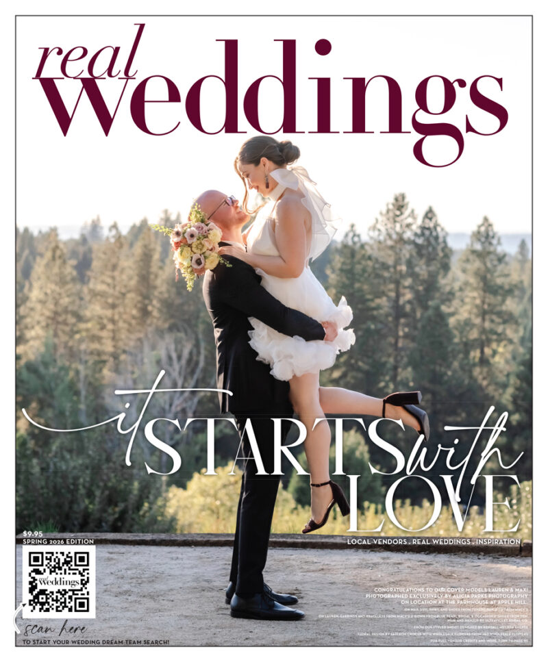 On the Winter 2026-PRINT EDITION Cover (above): On Kyle: Suit, Shirt, Tie, and Shoes from Always Elegant Bridal & Tuxedo; On Haley: Earrings and Ring from Ruby Noir; Gown and Veil from Always Elegant Bridal & Tuxedo; Hair and Makeup by All Dolled Up Beauty + Bridal