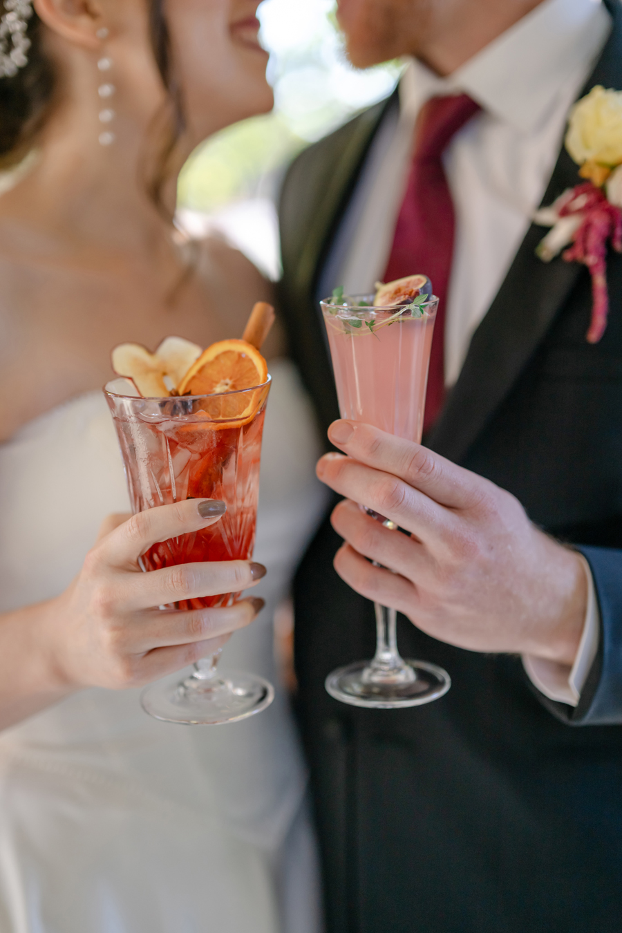 For our shoot, they mixed up two irresistible favorites: a cozy-meets-festive Cranberry Cider Margarita (hello fall romance!) and the delicately elegant Fig & Thyme Gin Fizz (basically a toast in cocktail form). One is bold and bright, the other soft and sophisticated—together they’re basically the perfect wedding couple.