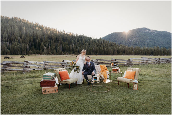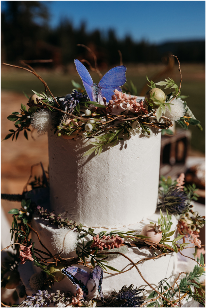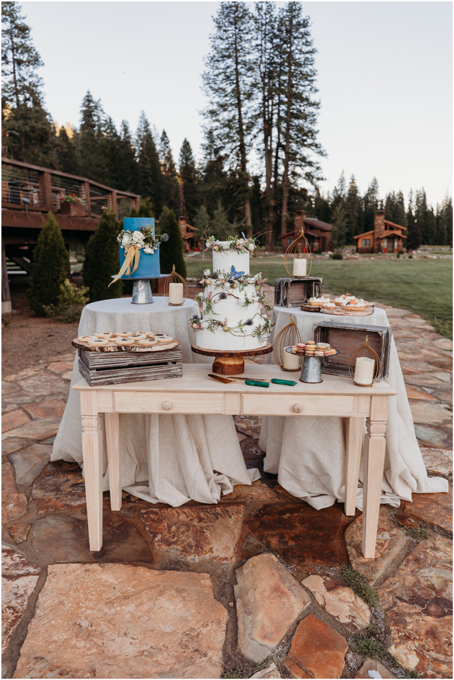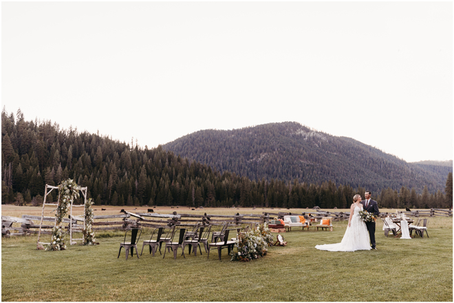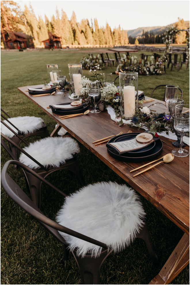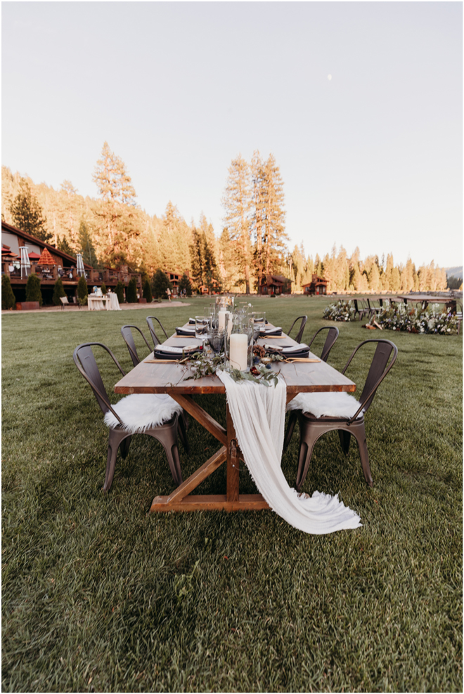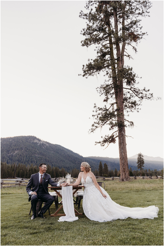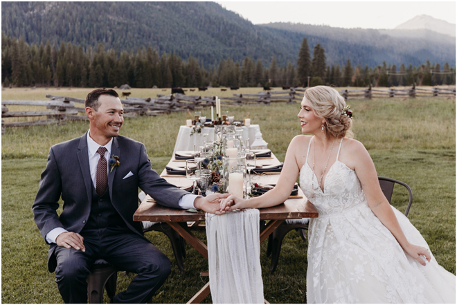 The rugged granite of the Sierra Nevada range, the volcanic activity of the Cascades, and the diverse flora of the Great Basin converge to create Lassen National Forest, fittingly called the Crossroads. At the gateway to this northeastern California wilderness is Highlands Ranch Resort. With panoramic views of meadows, mountains, coniferous forest, and endless sky, the Ranch became the perfect venue for a styled elopement shoot. The design of the editorial combined outdoorsy adventure, a rustic aesthetic, and modern chic appeal. The styled shoot was arranged by Real Weddings, coordinated by Tan Weddings & Events, and teamed with talented creatives. Like the magnificent setting, the styled shoot was at the crossroads of grandeur, rustic, and refinement.