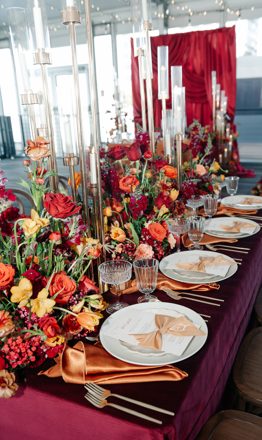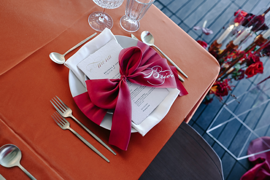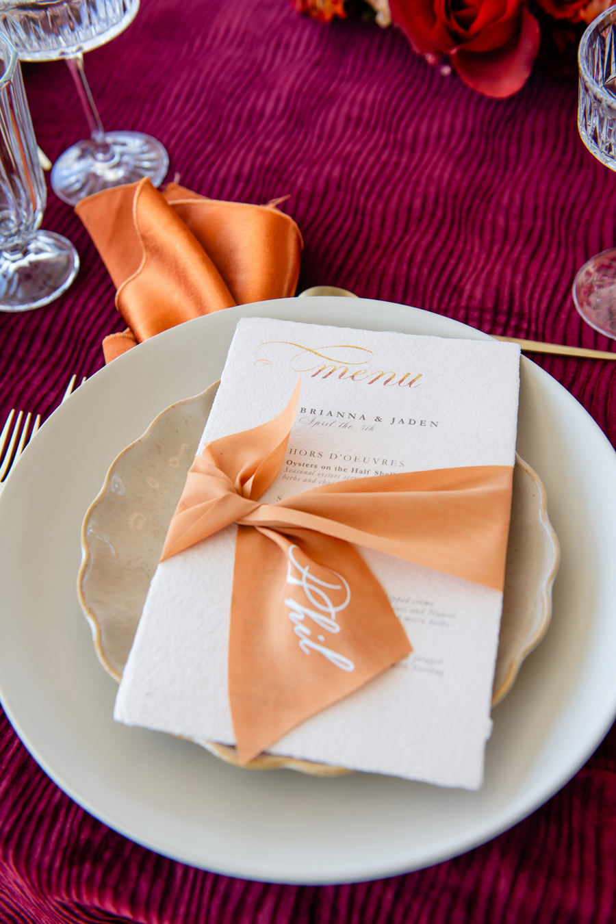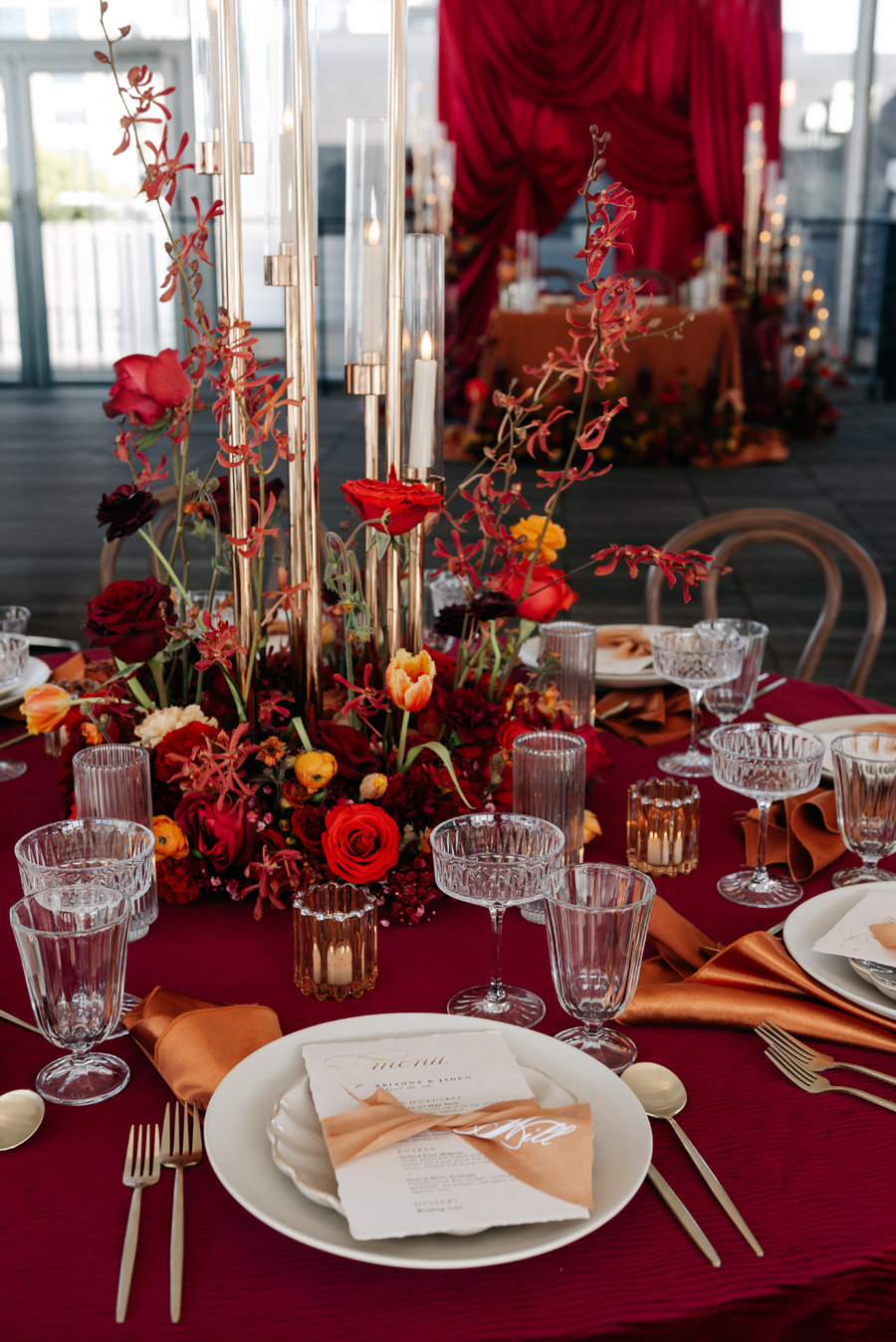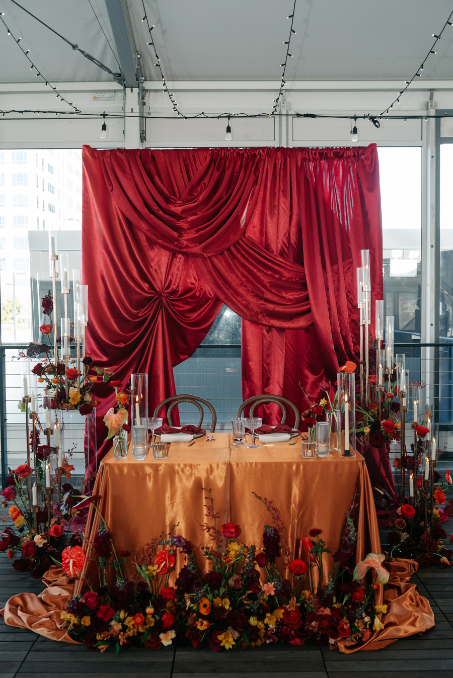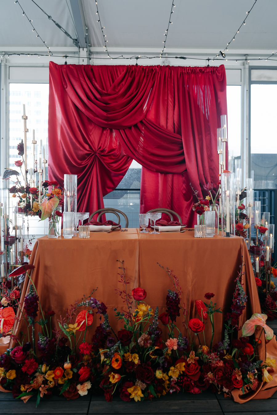 Details. Details. And more details. We cannot get enough of them! And for our “Love on Fire” styled shoot, the details were, well, FIRE! From the deep crimson and burnt orange linens and sweetheart table backdrop (um, hello you gorgeous draping, you!) to the vivid red phone (as our audio guestbook—we love this trend!), the breathtaking custom paperie and calligraphy, the exquisite rentals and the rich fall-influenced palette of lush florals, along with the scrumptious curated cuisine (did you say filet mignon and diver scallops?! Yes, please!), delicious curated cocktails, and ending with enticing ice cream (we were all screaming for the ice cream!) and affogatos, our talented creative team understood the assignment, 💯! Feast your eyes on all of these delicious details!