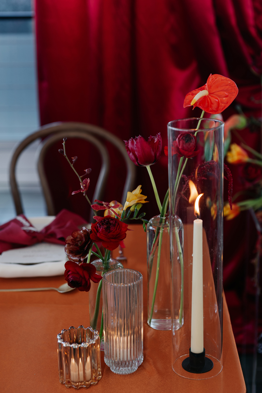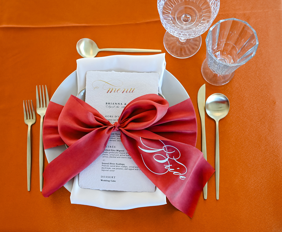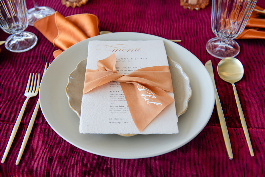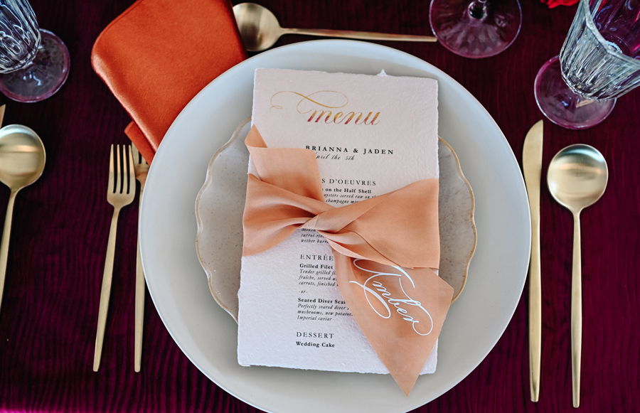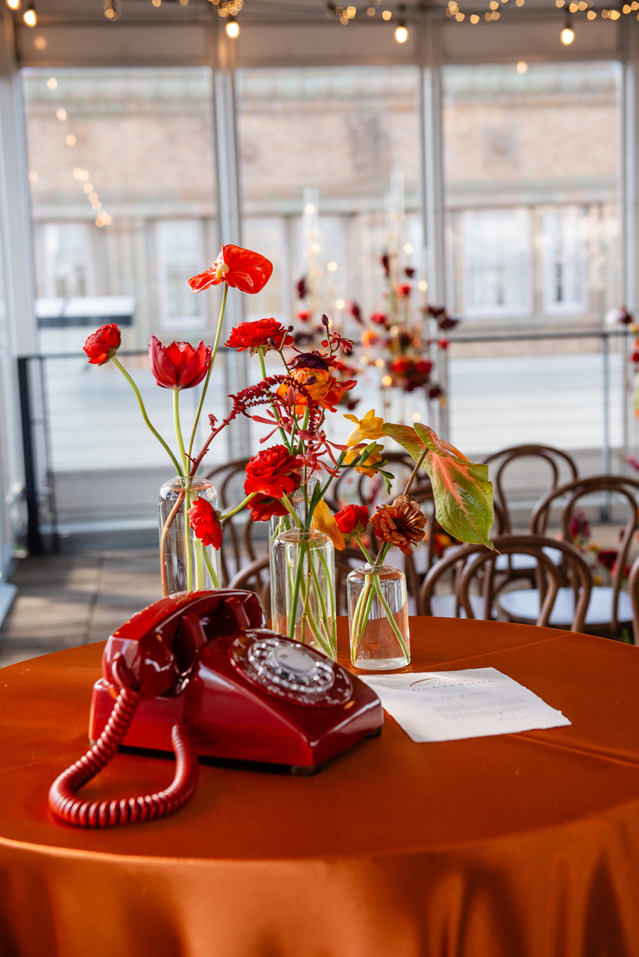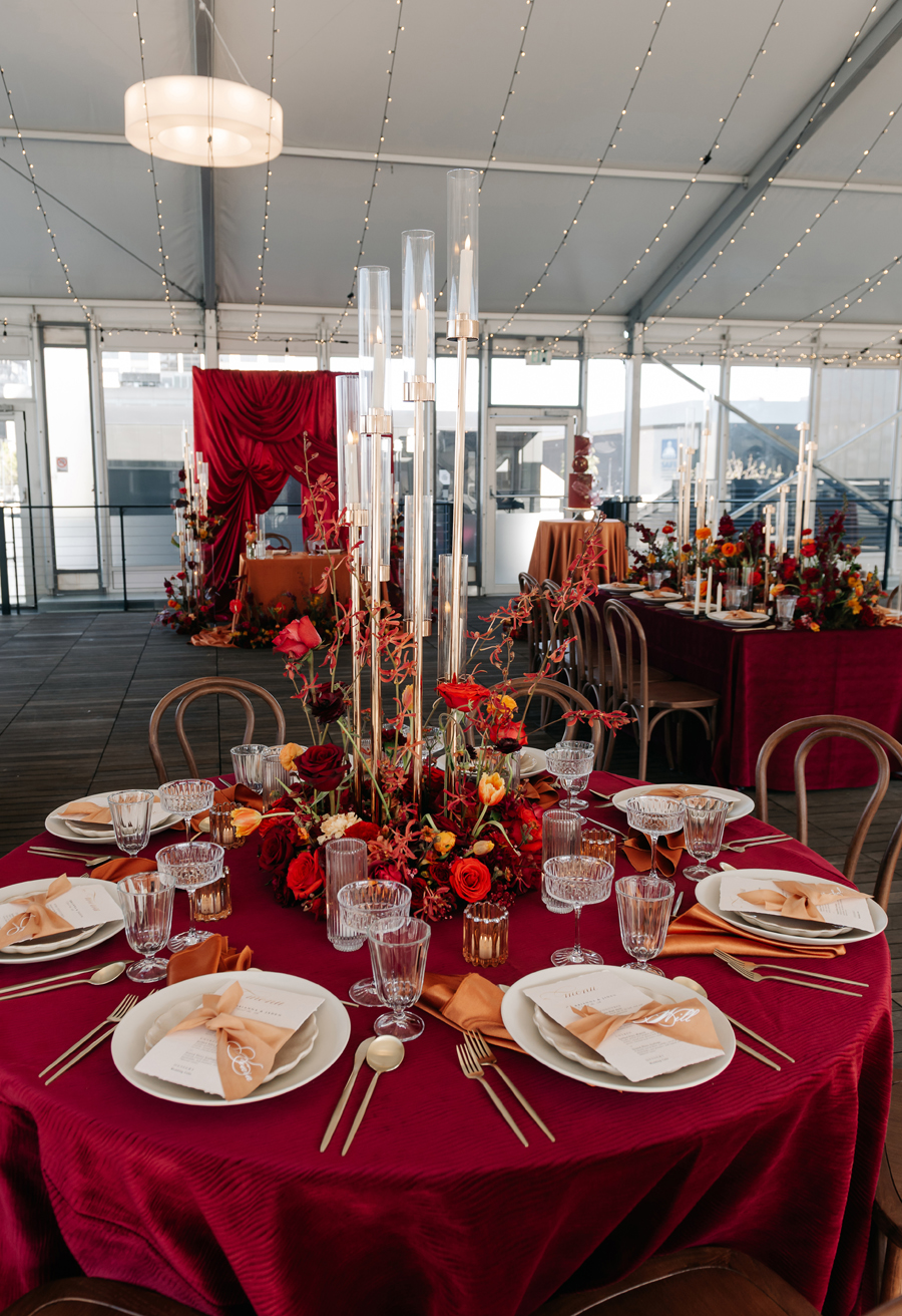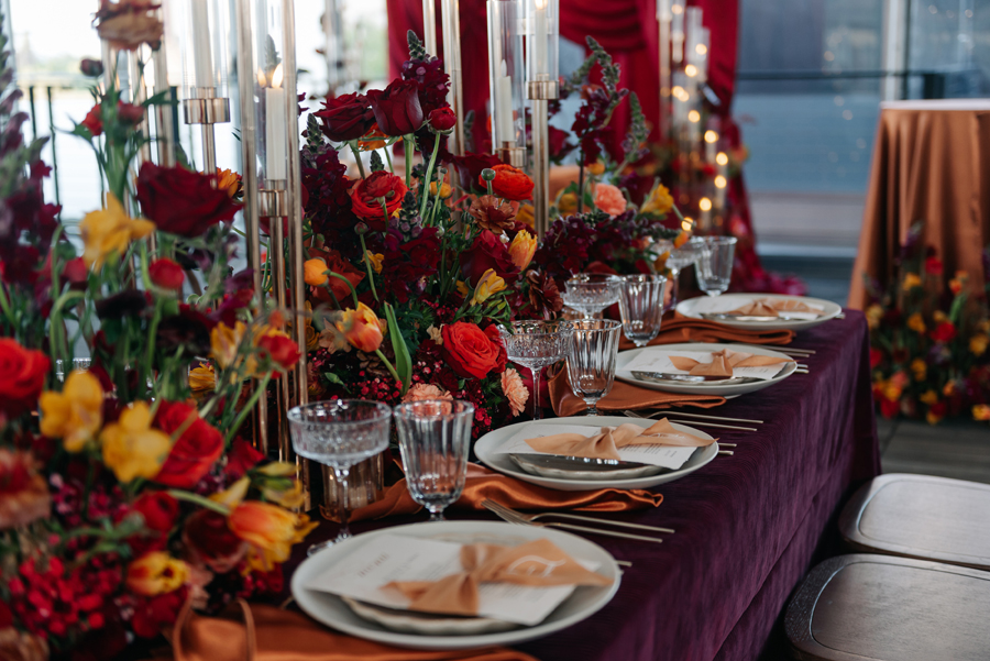 Details. Details. And more details. We cannot get enough of them! And for our “Love on Fire” styled shoot, the details were, well, FIRE! From the deep crimson and burnt orange linens and sweetheart table backdrop (um, hello you gorgeous draping, you!) to the vivid red phone (as our audio guestbook—we love this trend!), the breathtaking custom paperie and calligraphy, the exquisite rentals and the rich fall-influenced palette of lush florals, along with the scrumptious curated cuisine (did you say filet mignon and diver scallops?! Yes, please!), delicious curated cocktails, and ending with enticing ice cream (we were all screaming for the ice cream!) and affogatos, our talented creative team understood the assignment, 💯! Feast your eyes on all of these delicious details!
