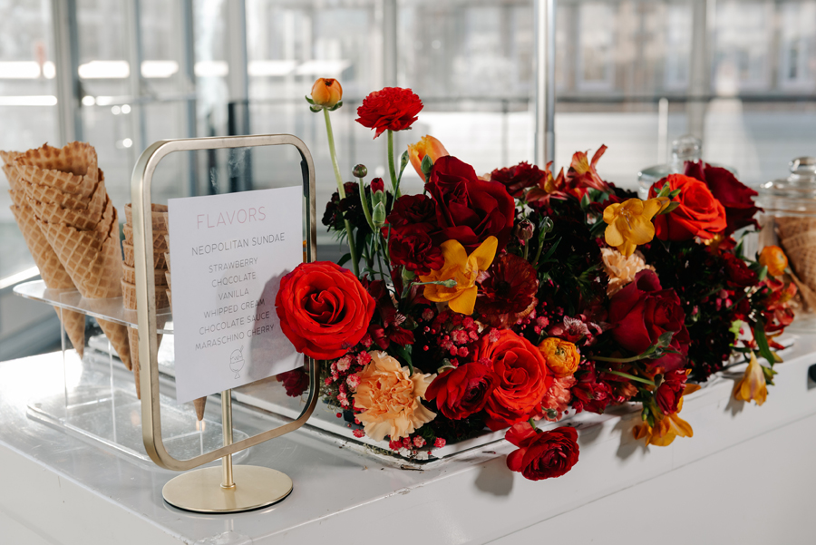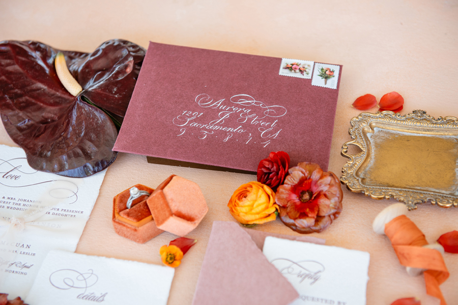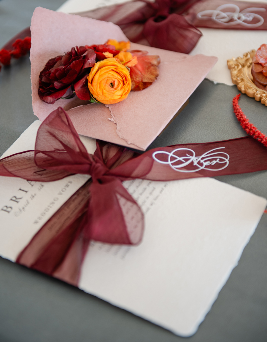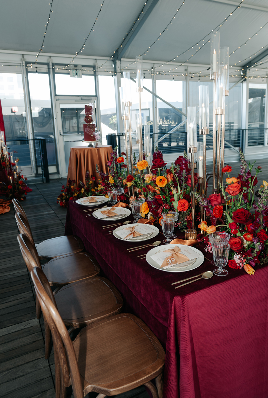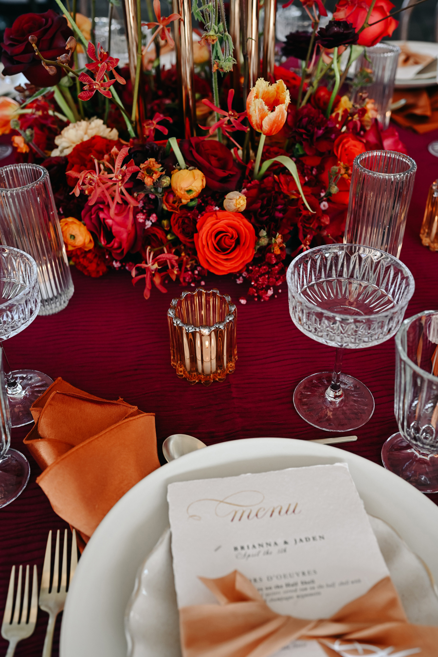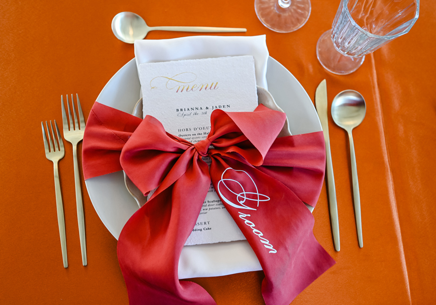 Details. Details. And more details. We cannot get enough of them! And for our “Love on Fire” styled shoot, the details were, well, FIRE! From the deep crimson and burnt orange linens and sweetheart table backdrop (um, hello you gorgeous draping, you!) to the vivid red phone (as our audio guestbook—we love this trend!), the breathtaking custom paperie and calligraphy, the exquisite rentals and the rich fall-influenced palette of lush florals, along with the scrumptious curated cuisine (did you say filet mignon and diver scallops?! Yes, please!), delicious curated cocktails, and ending with enticing ice cream (we were all screaming for the ice cream!) and affogatos, our talented creative team understood the assignment, 💯! Feast your eyes on all of these delicious details!