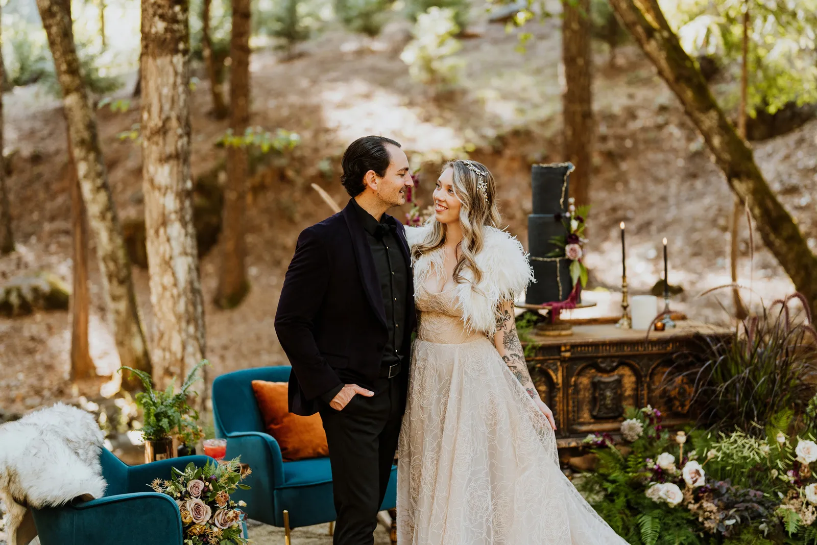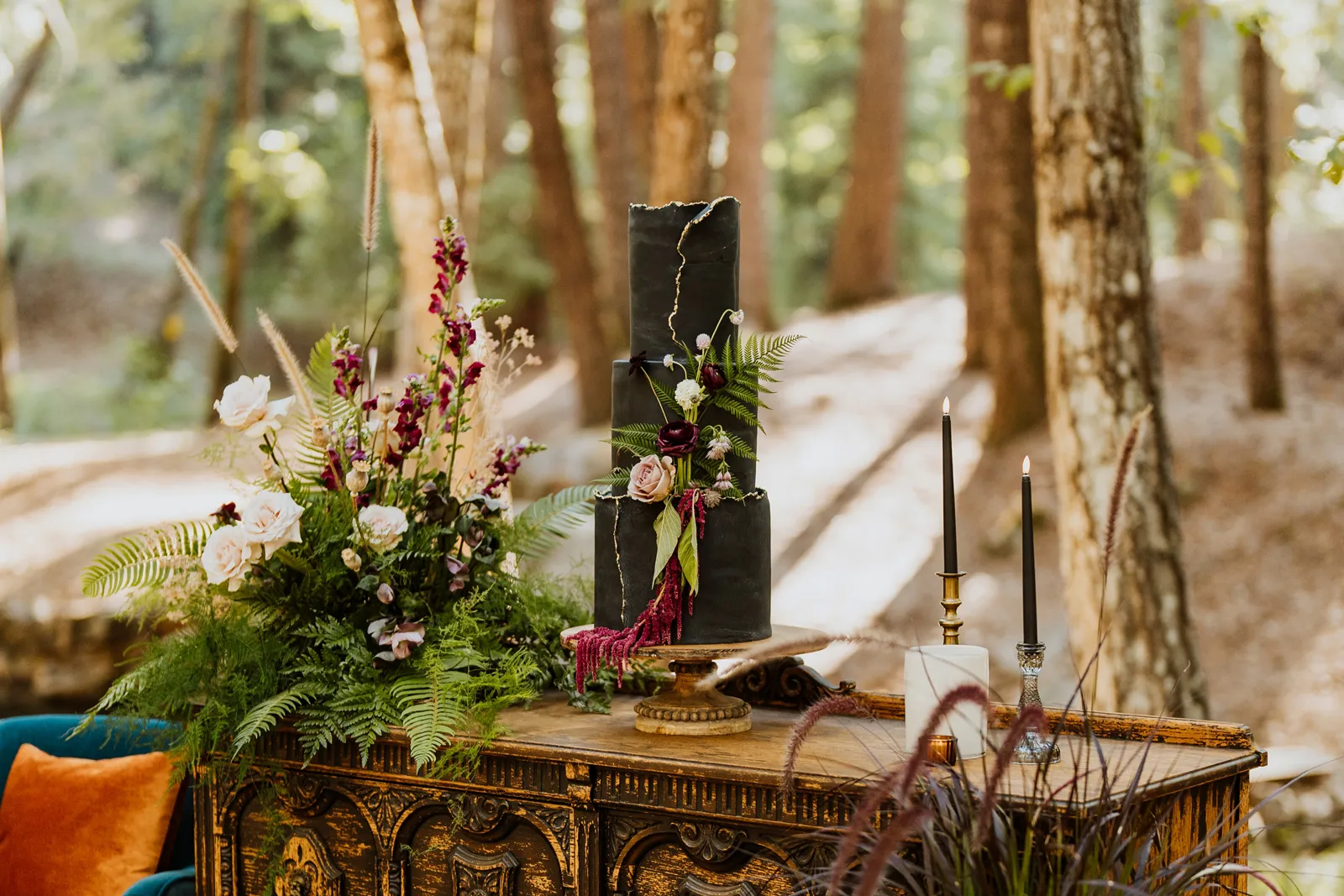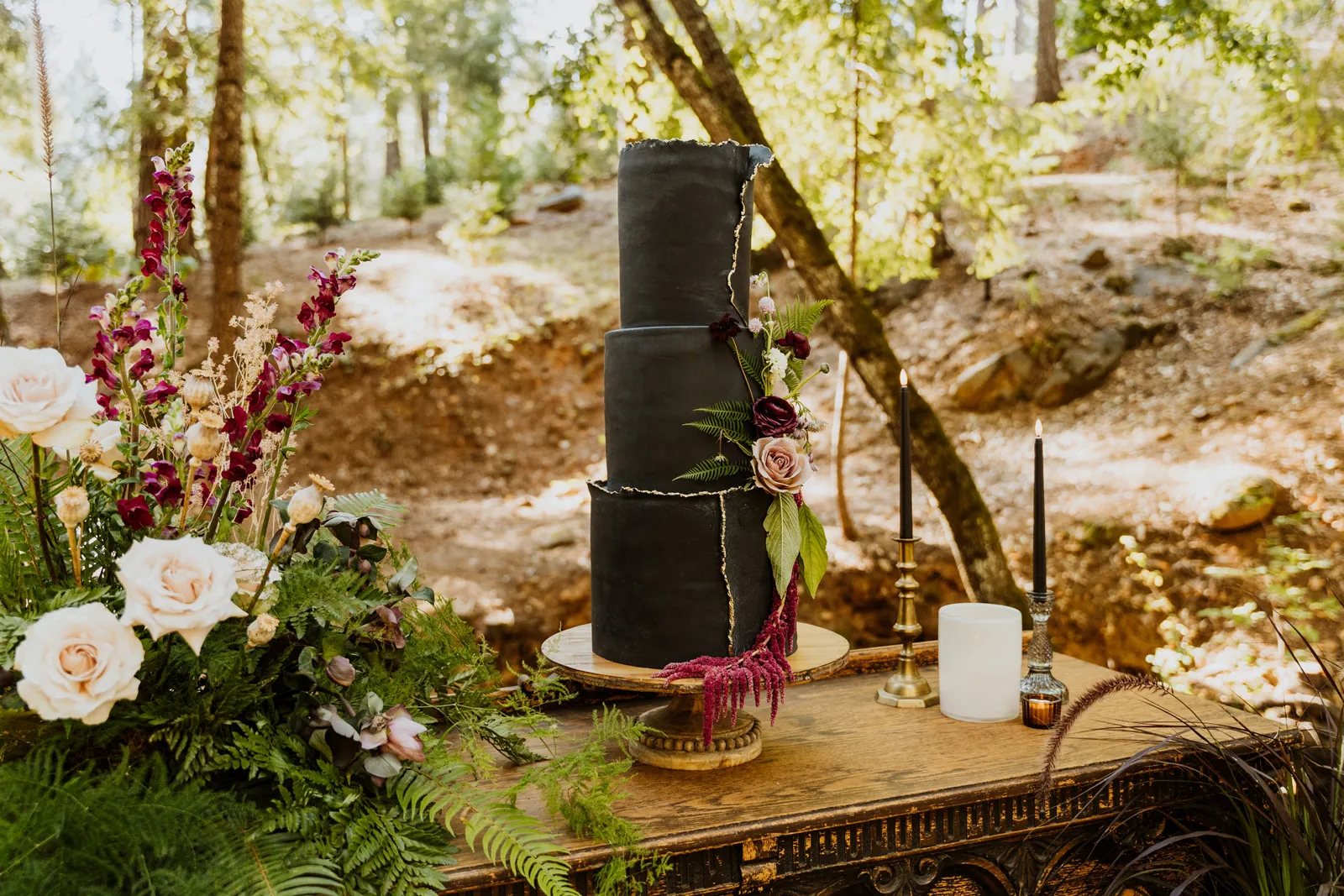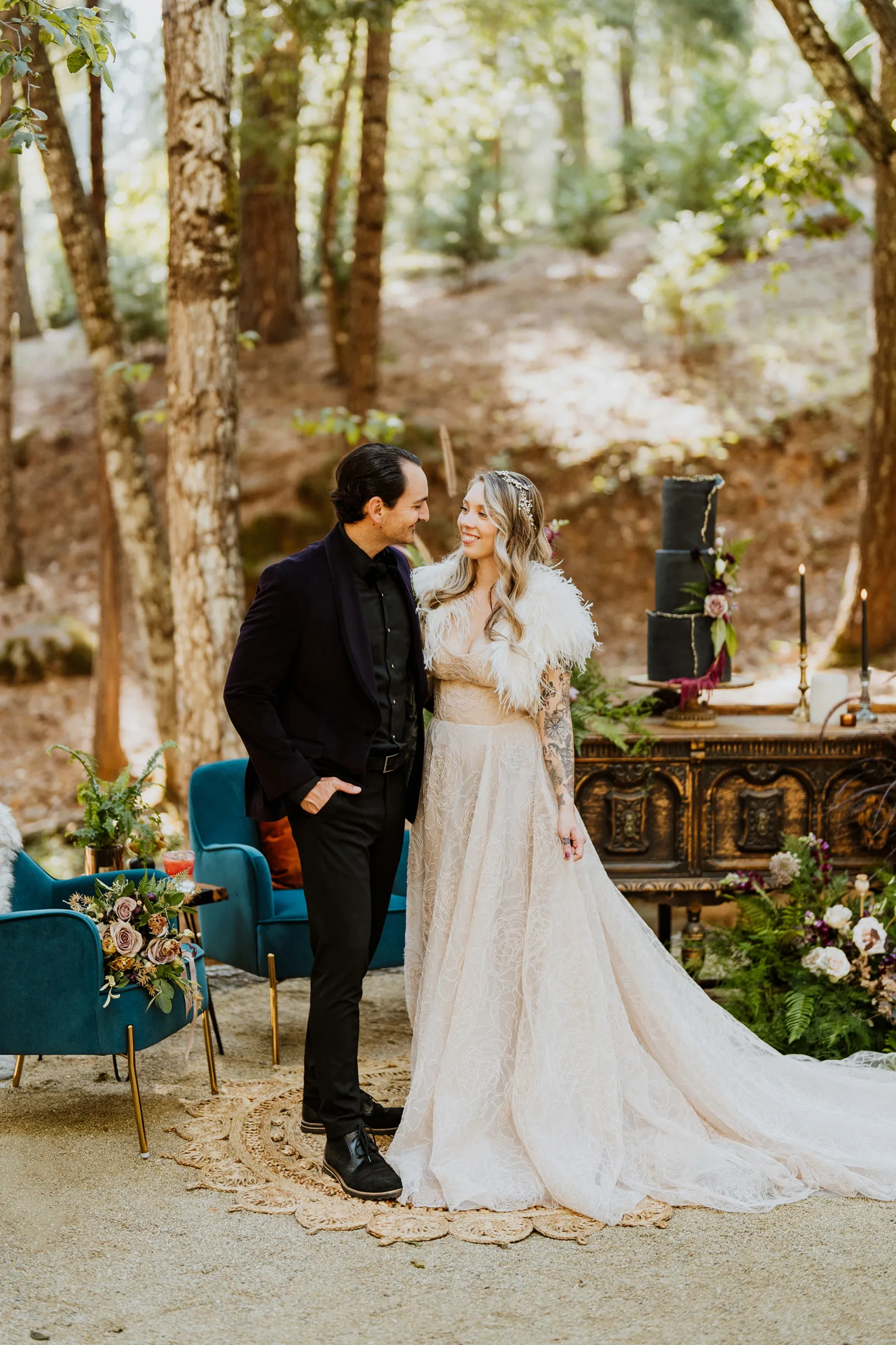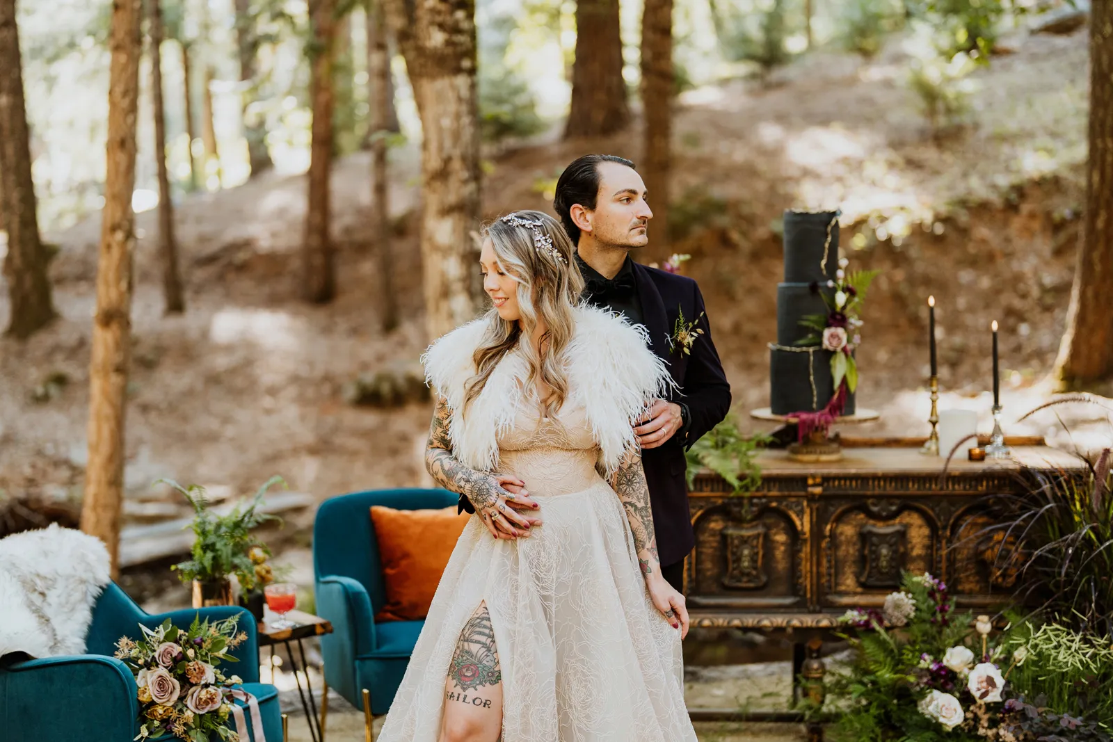 Welcome back to our next installment of Real Weddings Submitted Styled Shoots. Today’s shoot is absolutely brimming with tons of inspiration. With rich purples and black finishes set in the forest (think of a black, multi-tiered cake from Spilled Milk Co., colorful cocktails courtesy of The Parched Poppies, a feathered bolero from Perfect Dress Party and a navy suit from Tuxedo Den) you’re going to get all the romantic, moody vibes from this shoot. Keep scrolling so you can get in on all the amazing details!
